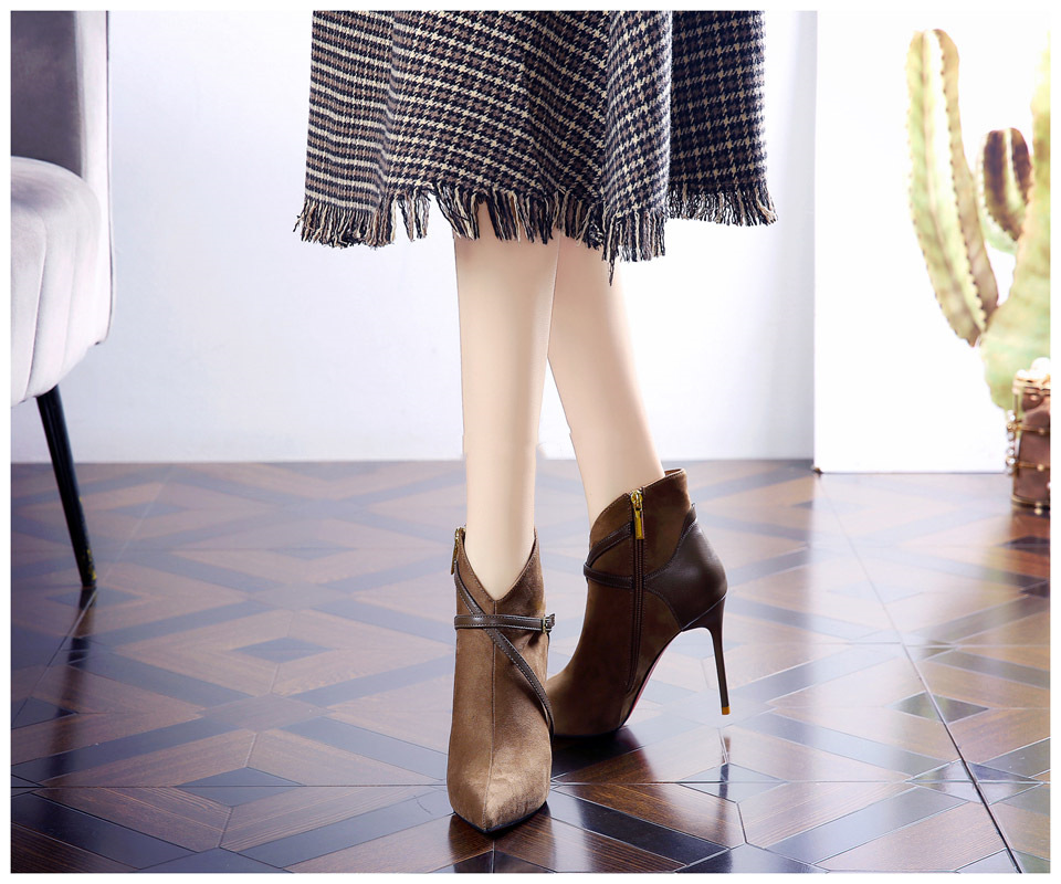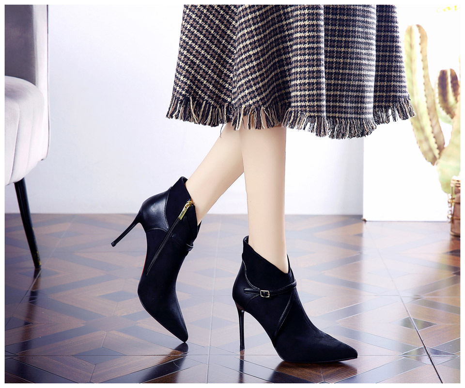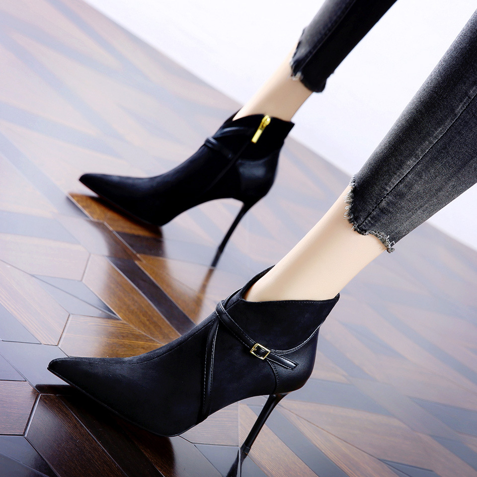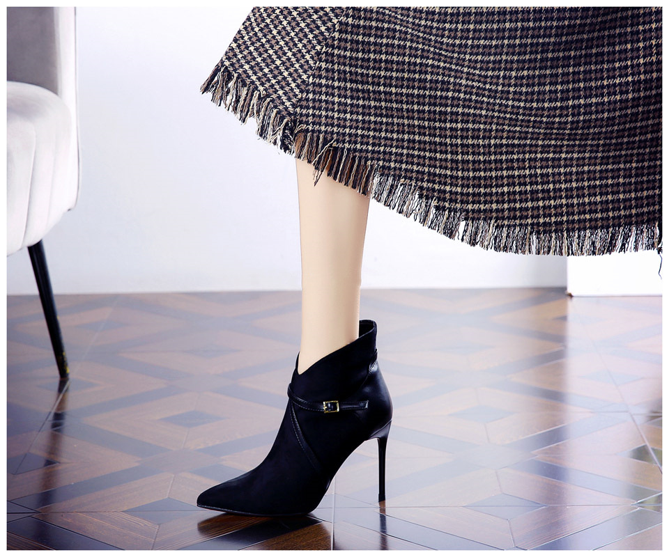 365-36 하이힐 여성 2024 가을과 겨울 따뜻한 패션 튀김 거리 뾰족한 발목 부츠 벨트 버클 얇은 힐 마틴 부츠스토어 가기