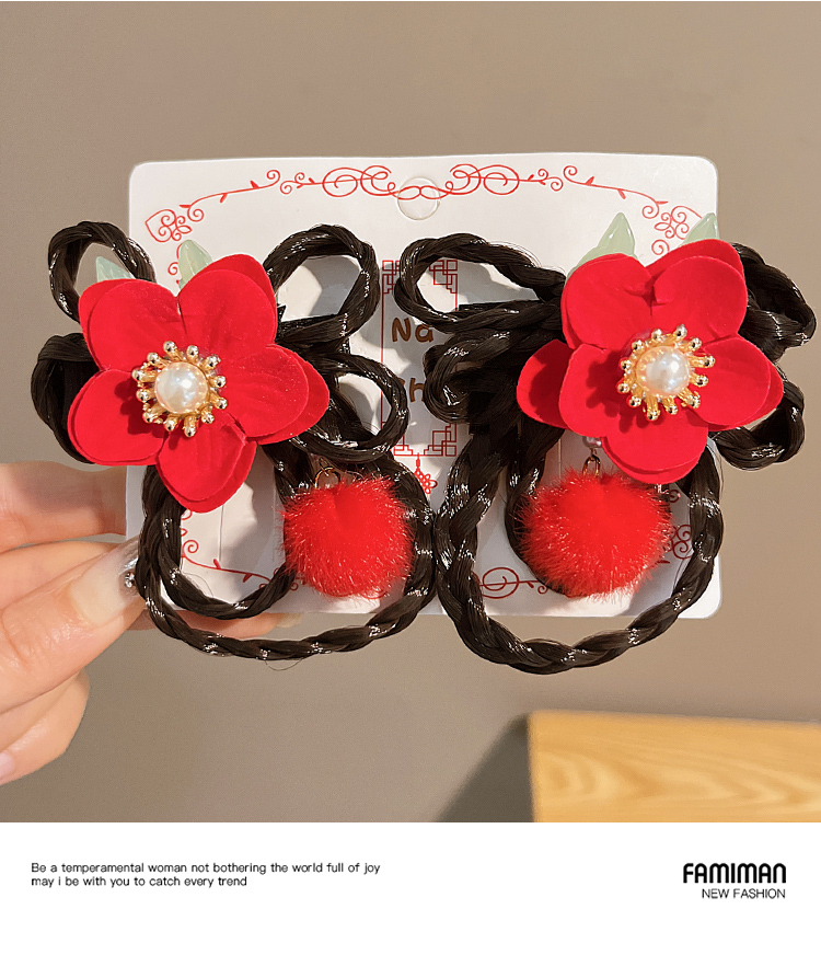 • ❤레드 퍼 볼 리본 태슬 가발 브레이드 쌍