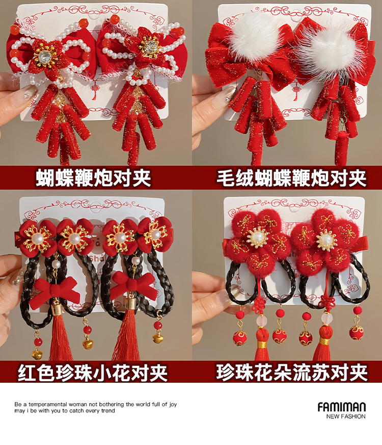 • ❤ 레드 퍼 볼 리본 브레이드 태슬 진주 머리핀(쌍)