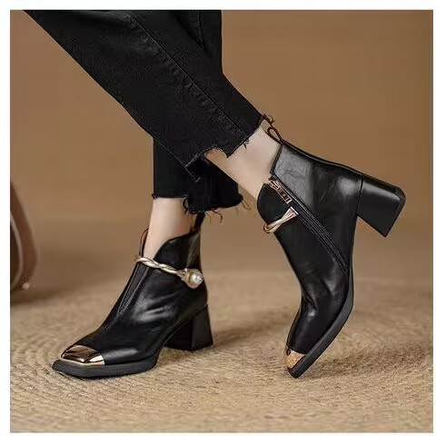봄과 가을 2024 새로운 리얼 소프트 가죽 영국 스타일 마틴 부츠 여성 짧은 배럴 스퀘어 발가락 짧은 부츠 여성용 두꺼운 힐 하이힐 부츠