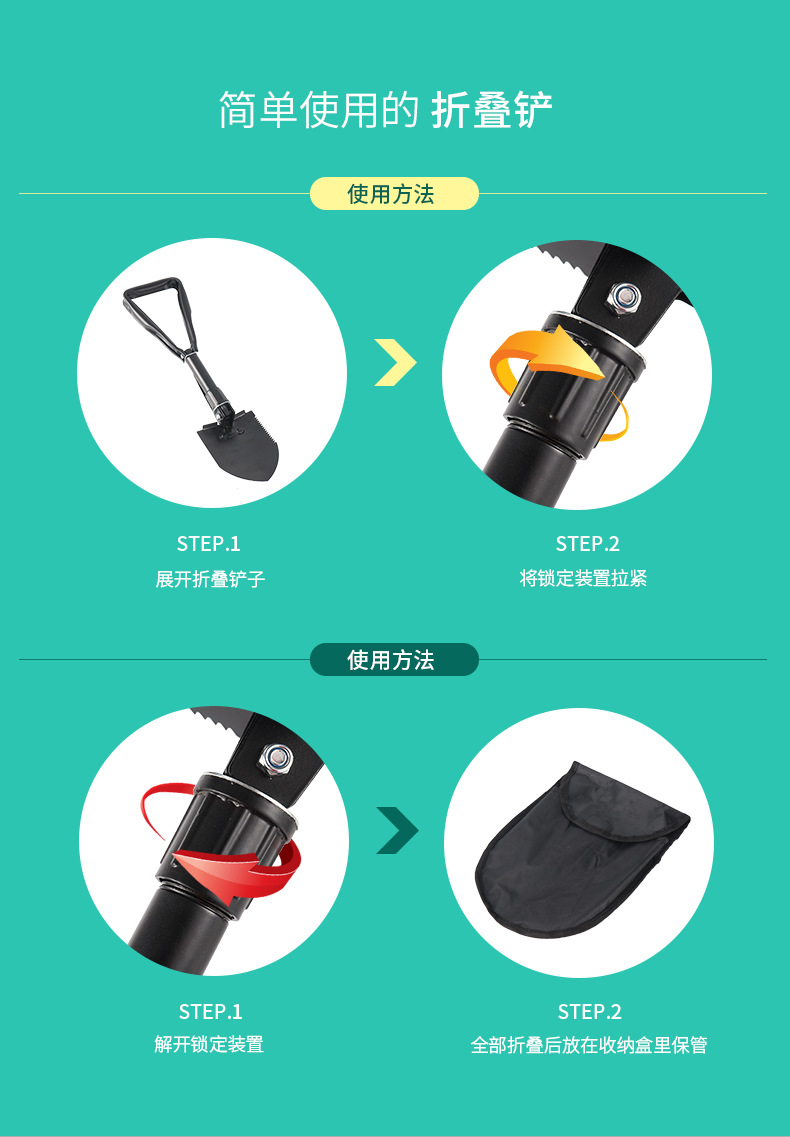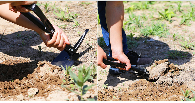 包装:黑色牛津布袋子,可拎,可挂腰上特点:多种用途,非常适野营、搭帐篷、登山、探险、旅游、整理居家花园、科考等户外活动的好帮手,具备锹、镐、锯、拔钉槽等功能。 特点:可以折叠,体积小,方便携带。展开后一头是铲,一头是镐。可弯曲,可折叠,手柄可横可竖,是户外野营活动的常备品,.