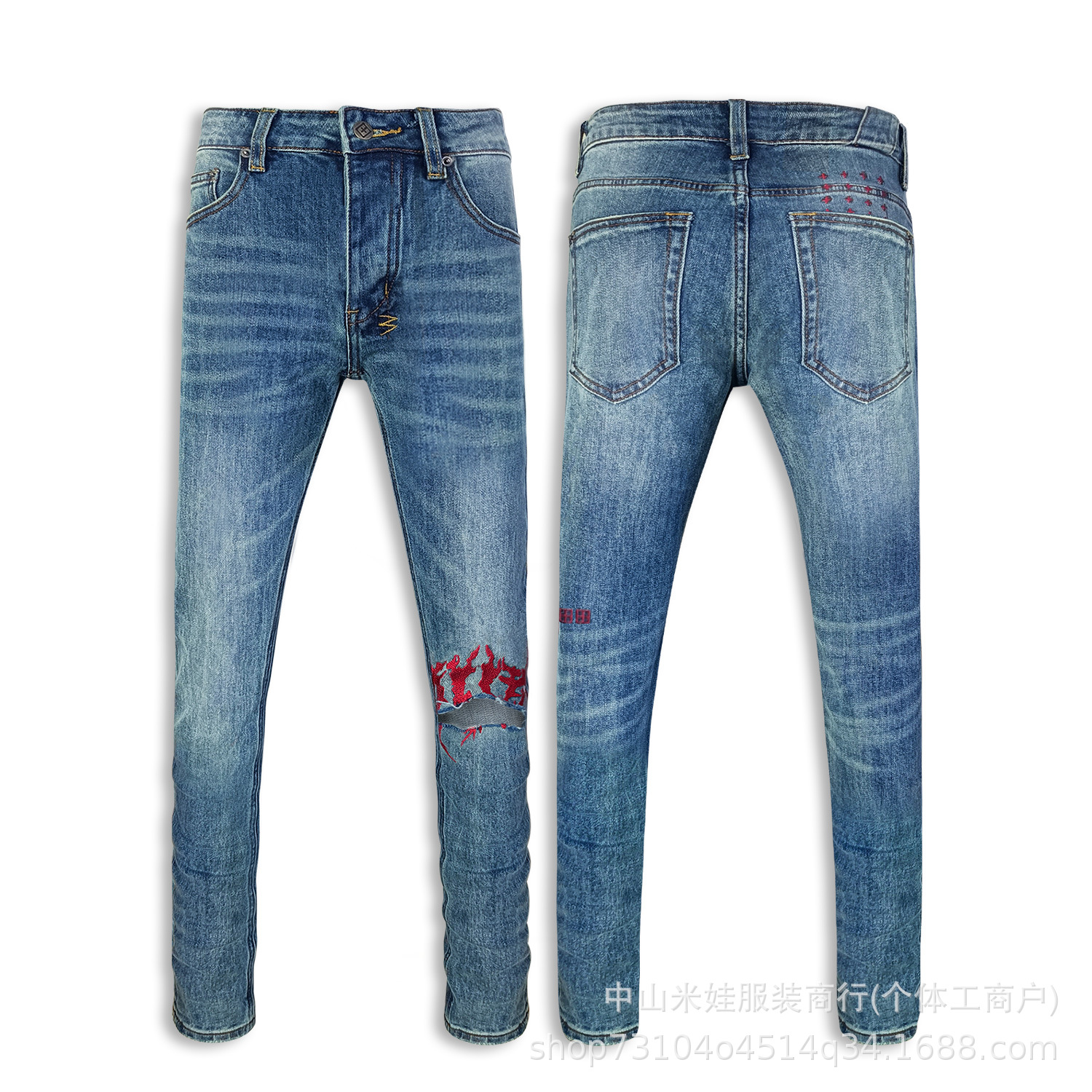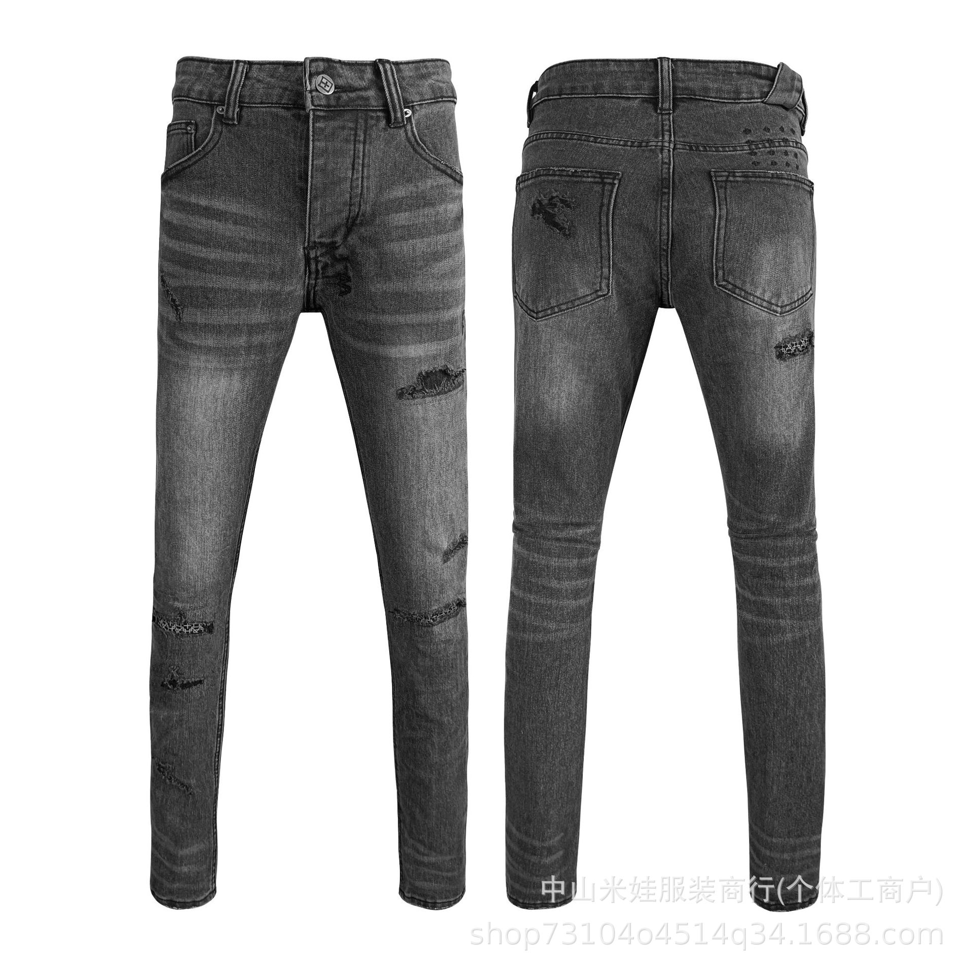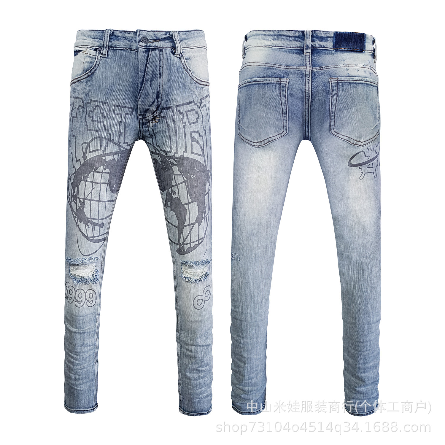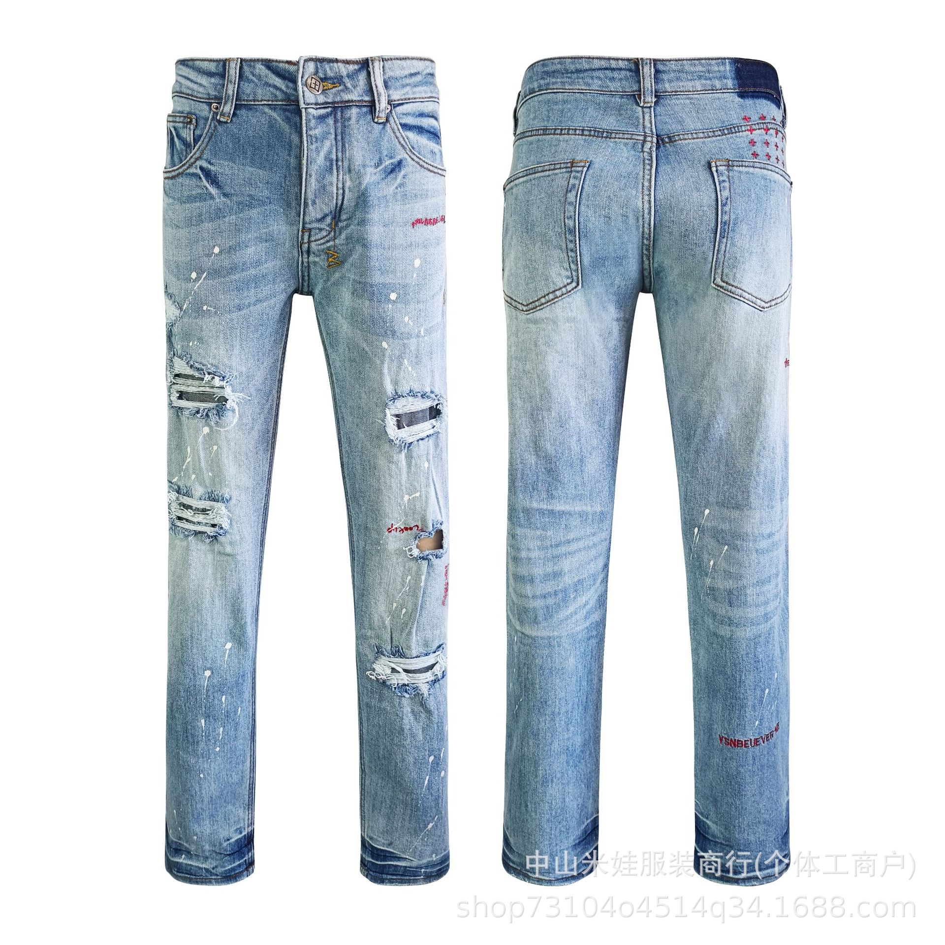 하이 엔드 브랜드 남성 KSB 청바지 스트레이트 리핑 스트레치 아메리칸 스타일 하이 스트리트 캐주얼 남성 청바지 재고