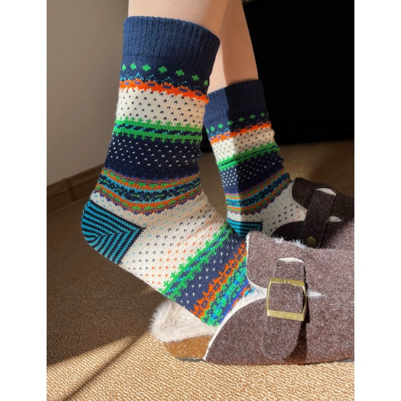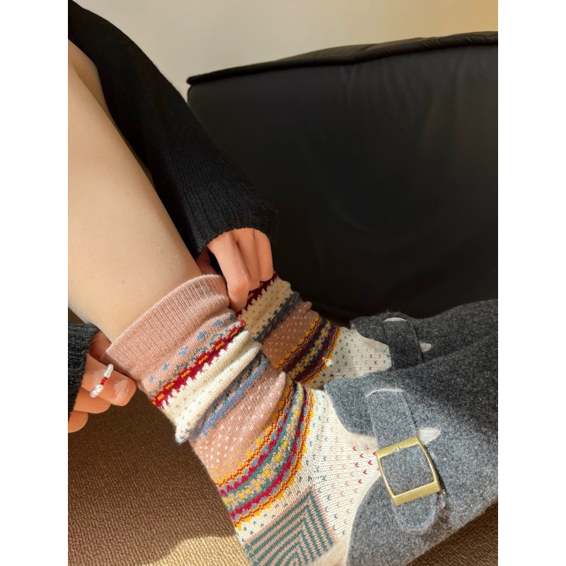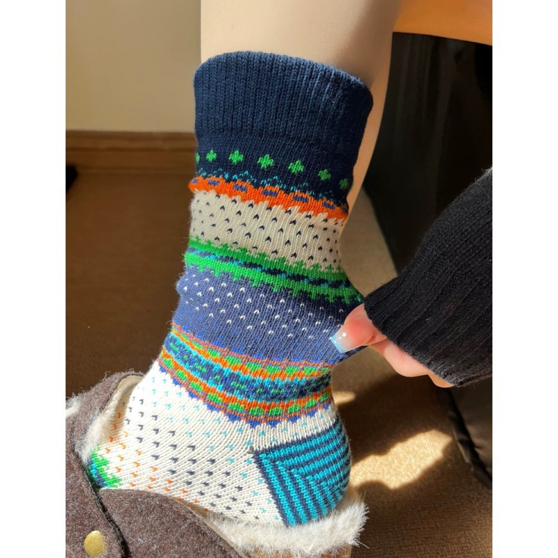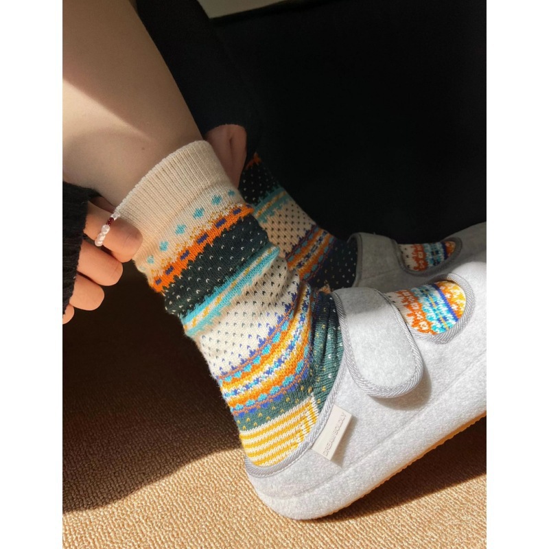 양말 여성 두꺼운 라인 카키 레트로 민족 스타일 Ins 트렌디 한 커플 아메리칸 스트리트 페어 아일랜드 미드 튜브 스택 양말스토어 가기