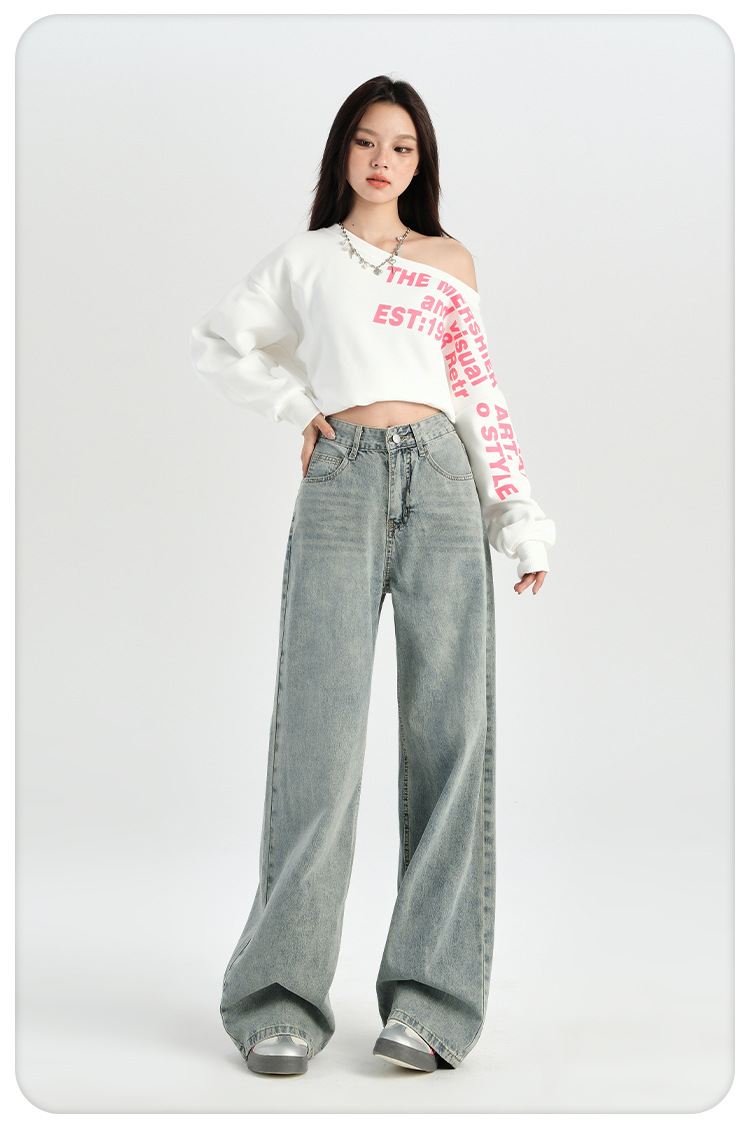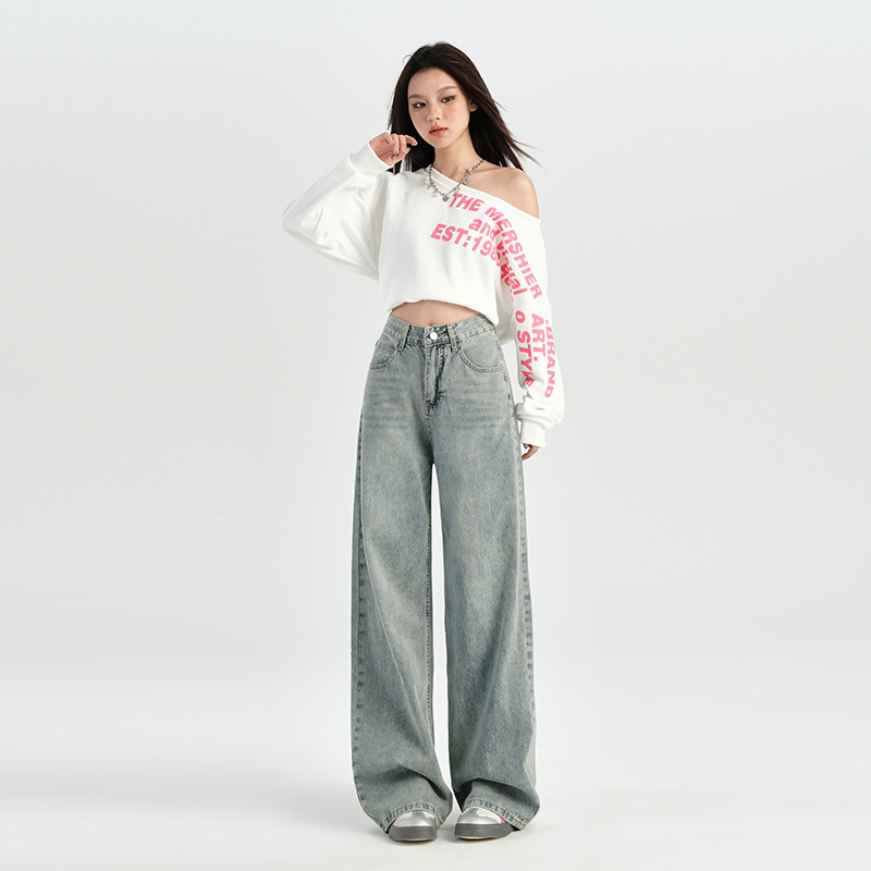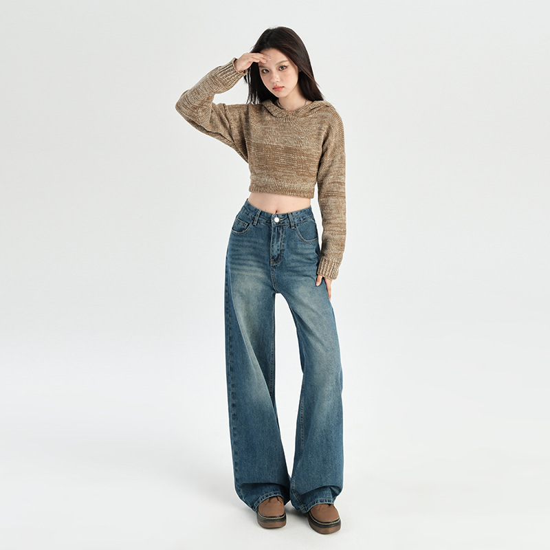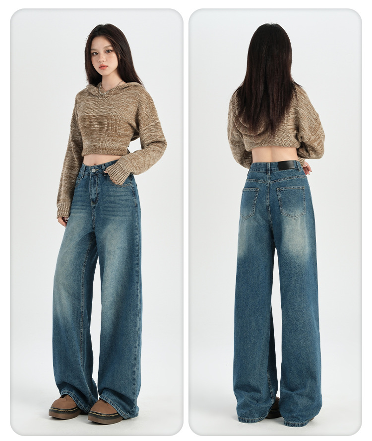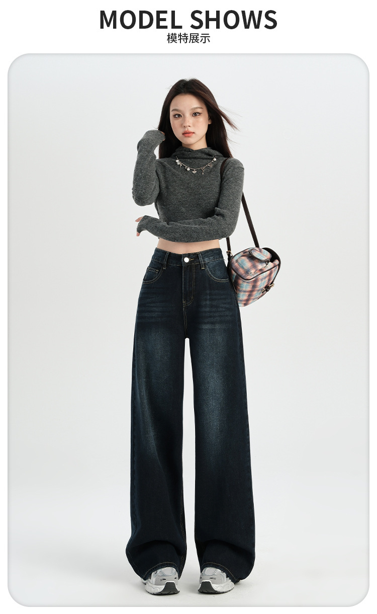 미국 레트로 높은 허리 넓은 다리 청바지 여성의 2024 가을과 겨울 기모 작은 느슨한 슬리밍 바지스토어 가기