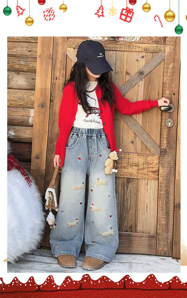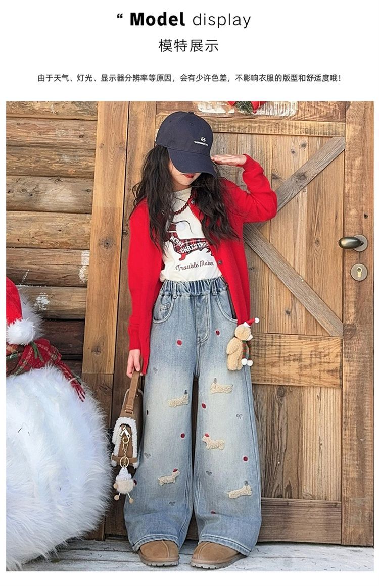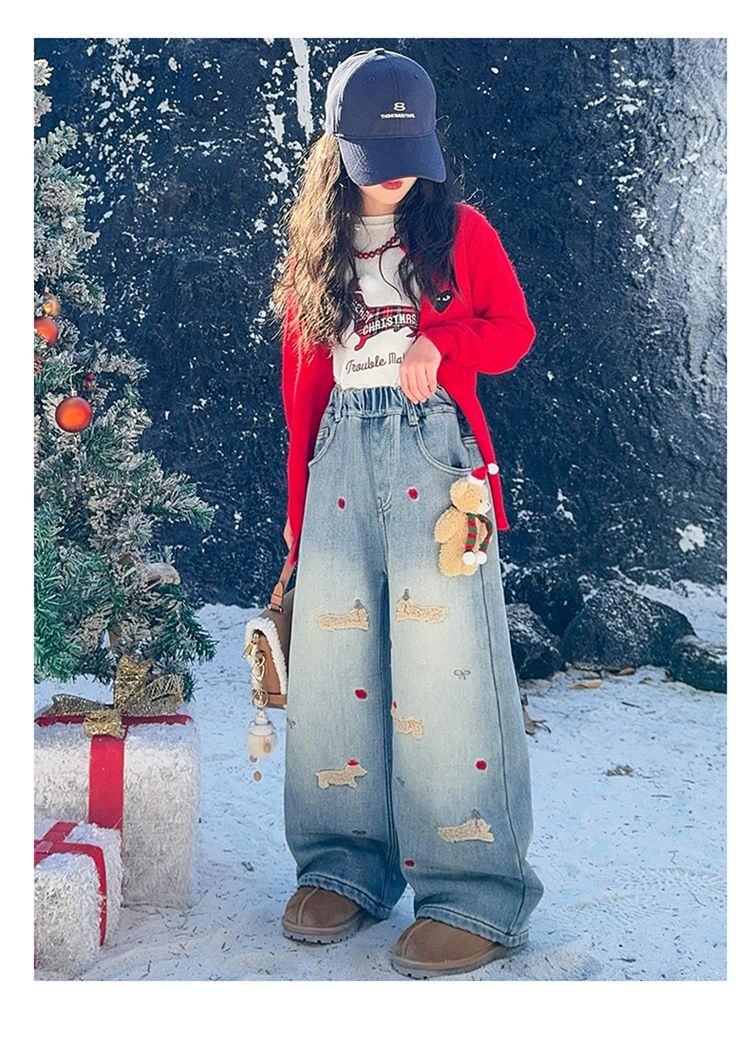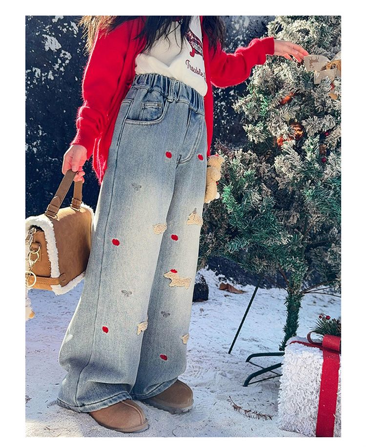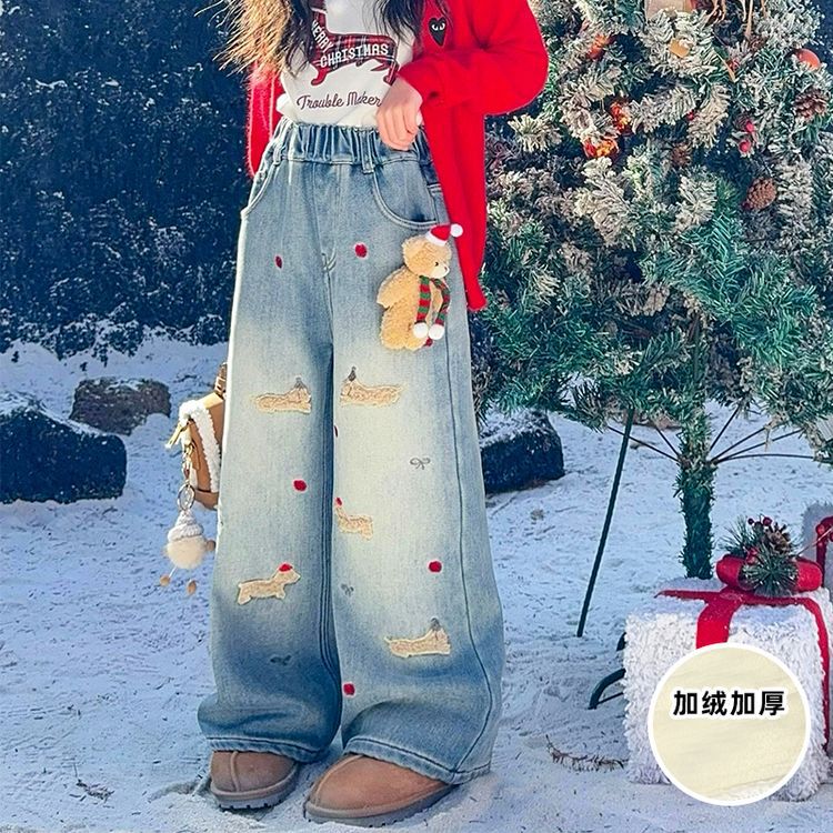 여자 청바지 겨울 기모 두꺼운 만화 캐주얼 넓은 다리 바지 한국 스타일 어린이 가을 겨울 연례 회의 바지