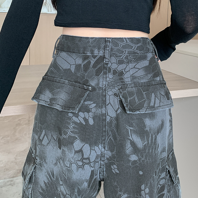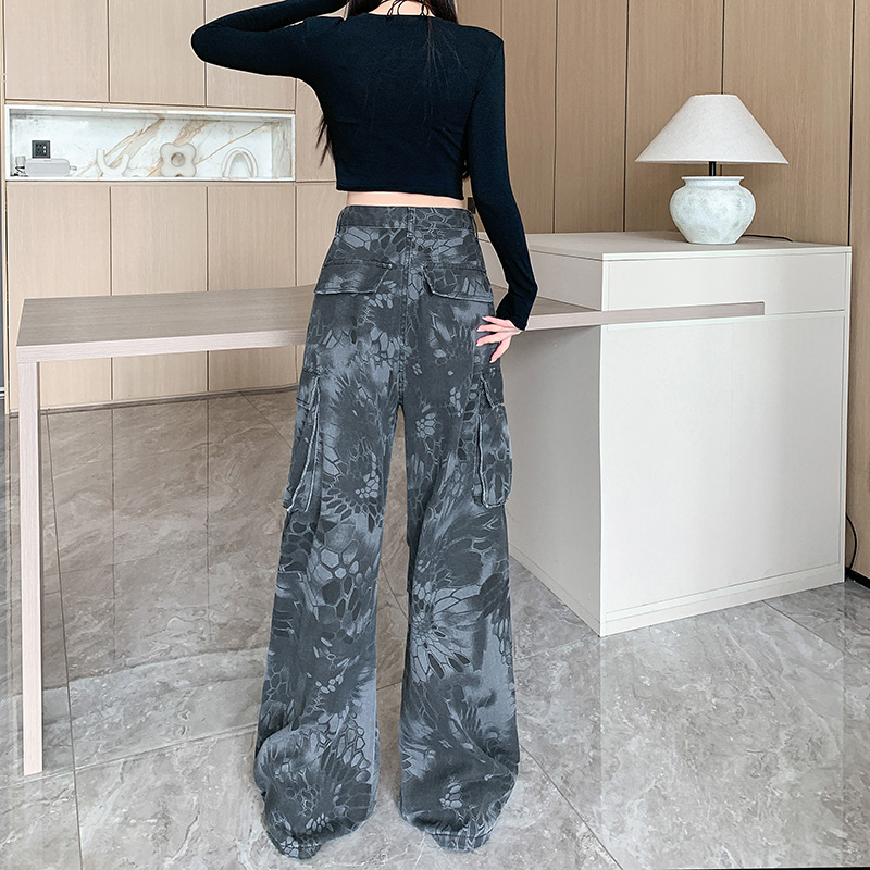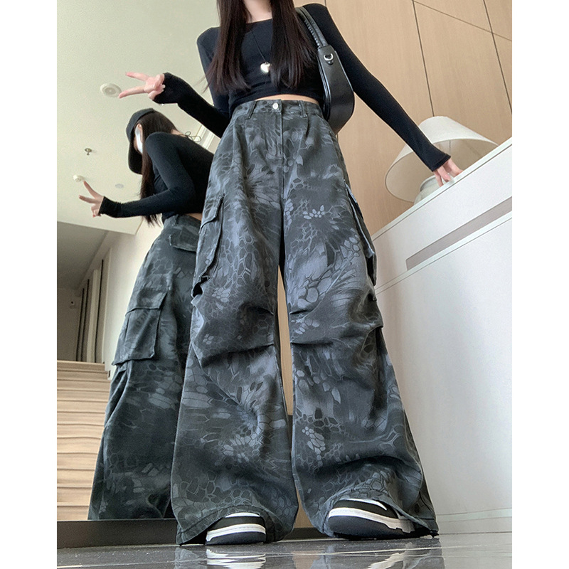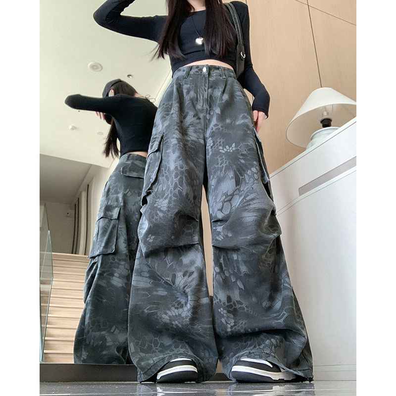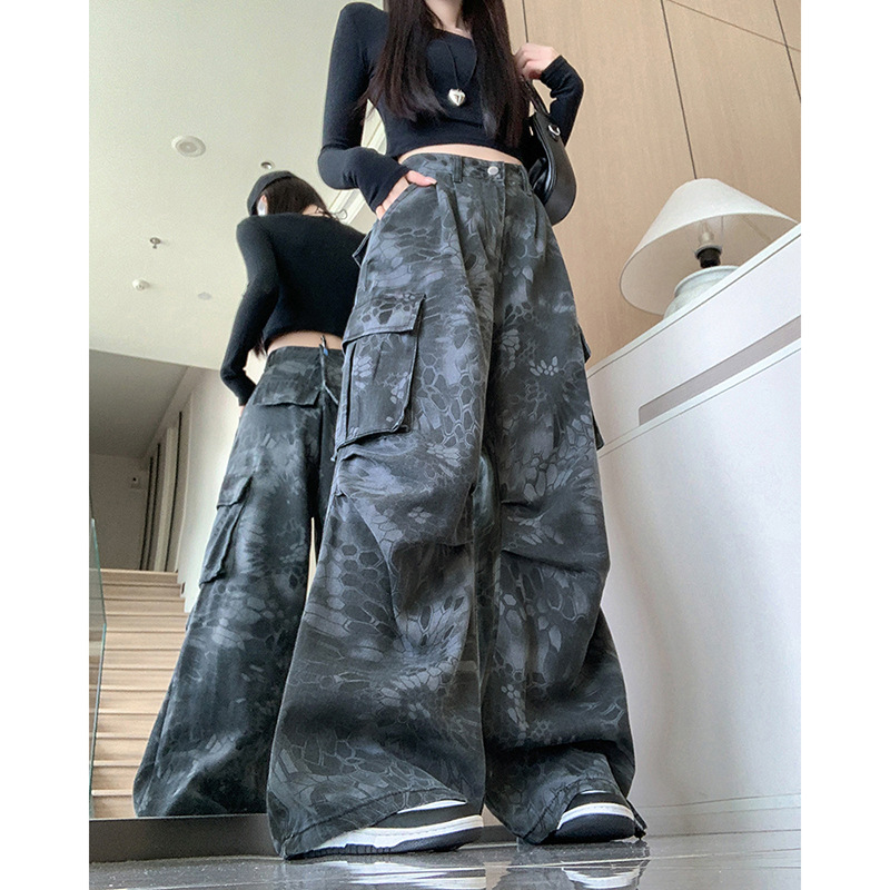 빈티지 틈새 골동품 위장 뱀 패턴 작업복 넓은 다리 바지 여성용 봄 아메리칸 스타일 스트리트 멀티 포켓 긴 바지 유행 여성스토어 가기