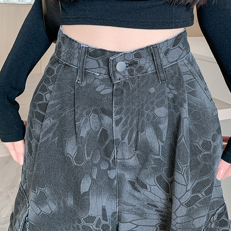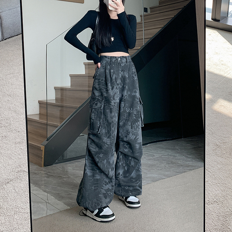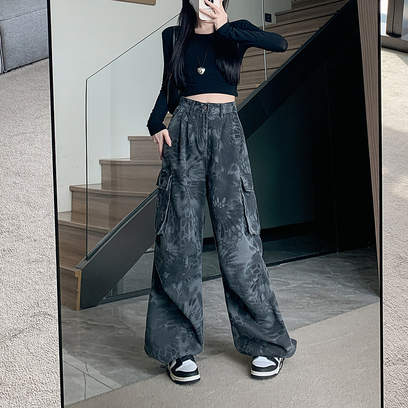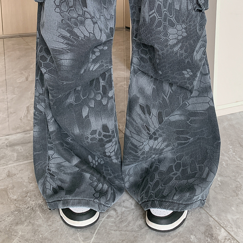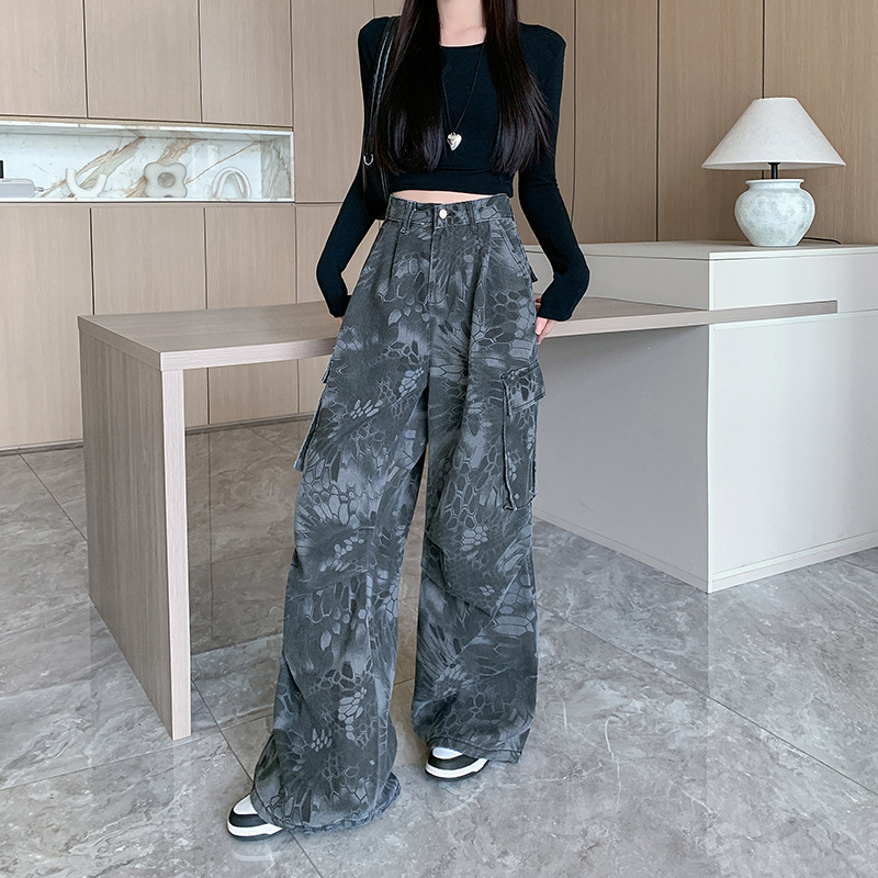 빈티지 틈새 골동품 위장 뱀 패턴 작업복 넓은 다리 바지 여성용 봄 아메리칸 스타일 스트리트 멀티 포켓 긴 바지 유행 여성스토어 가기
