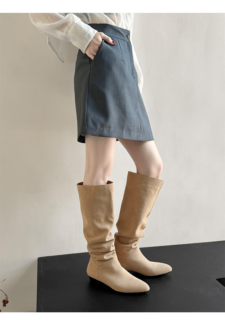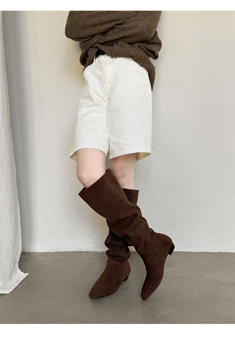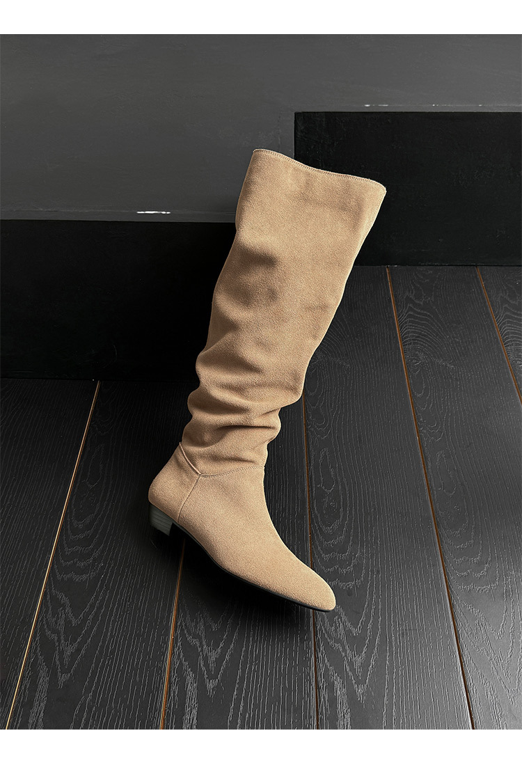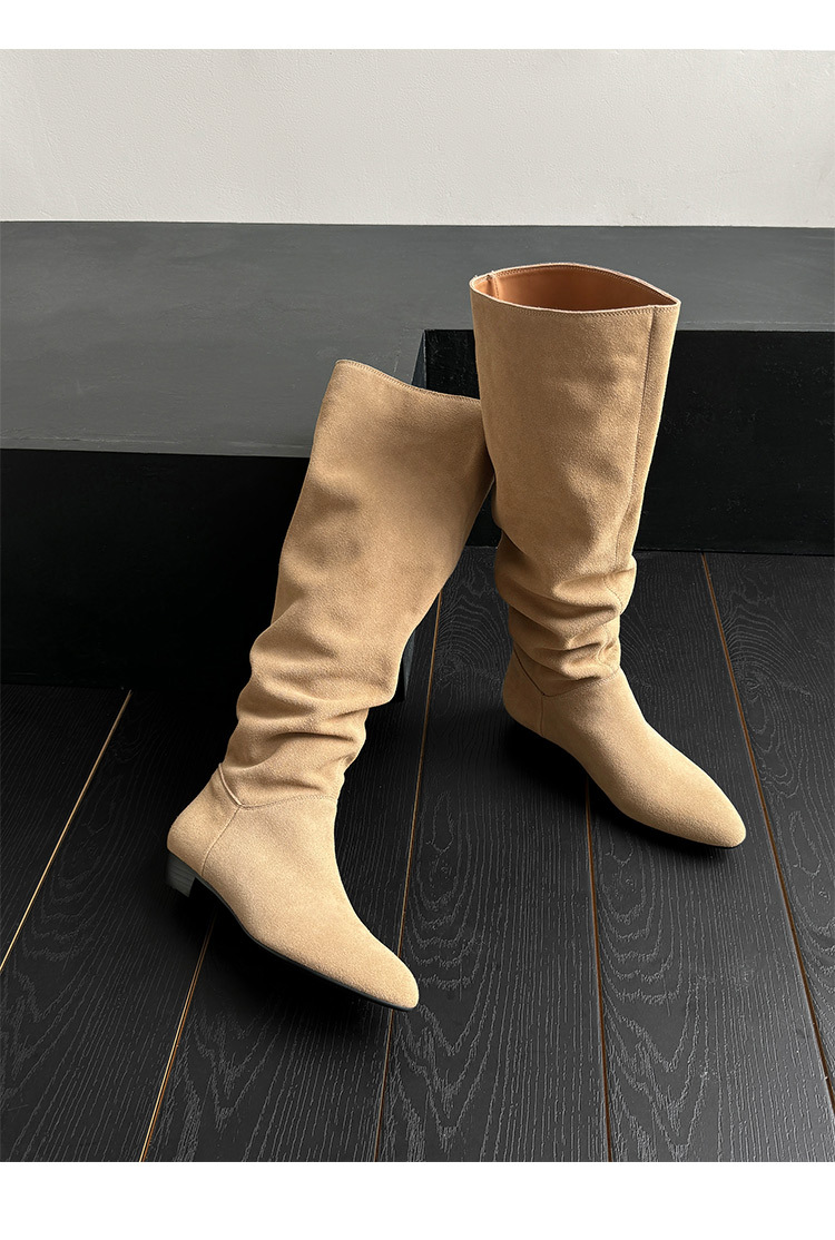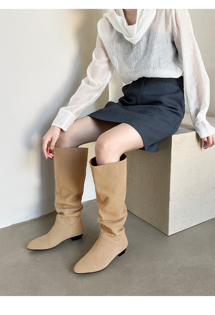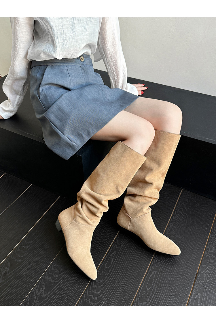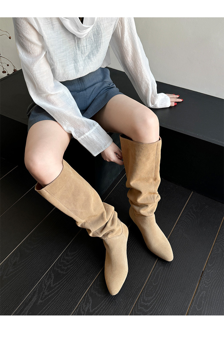 패션 트렌드 프로스트 가죽 힙 부츠 여성의 2024 가을과 겨울 새로운 포인팅 원핀 편안한 로우 힐 롱 부츠
