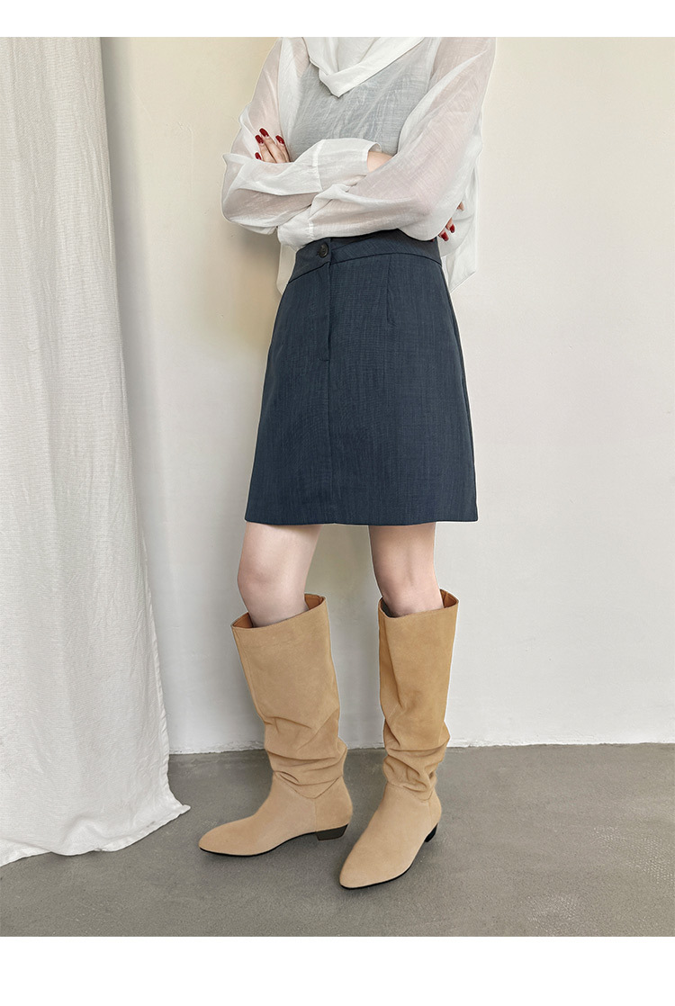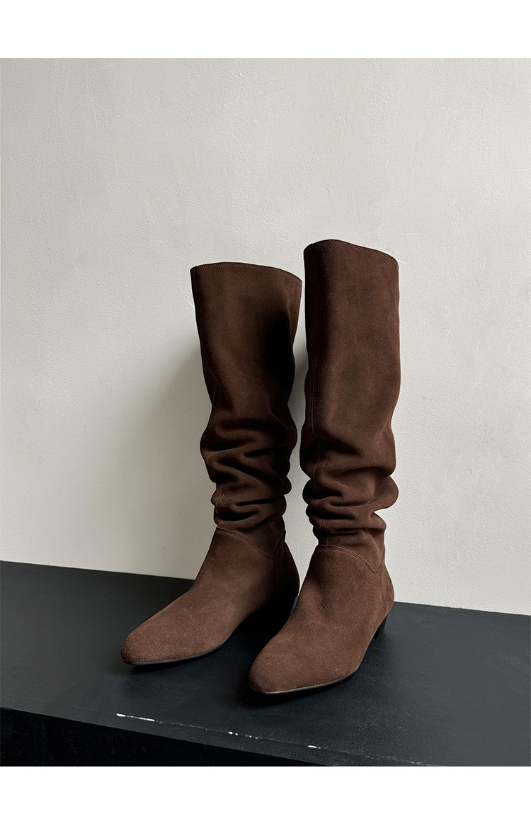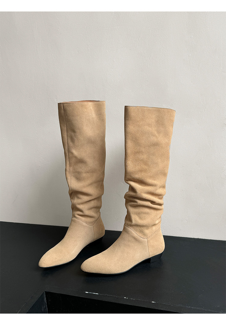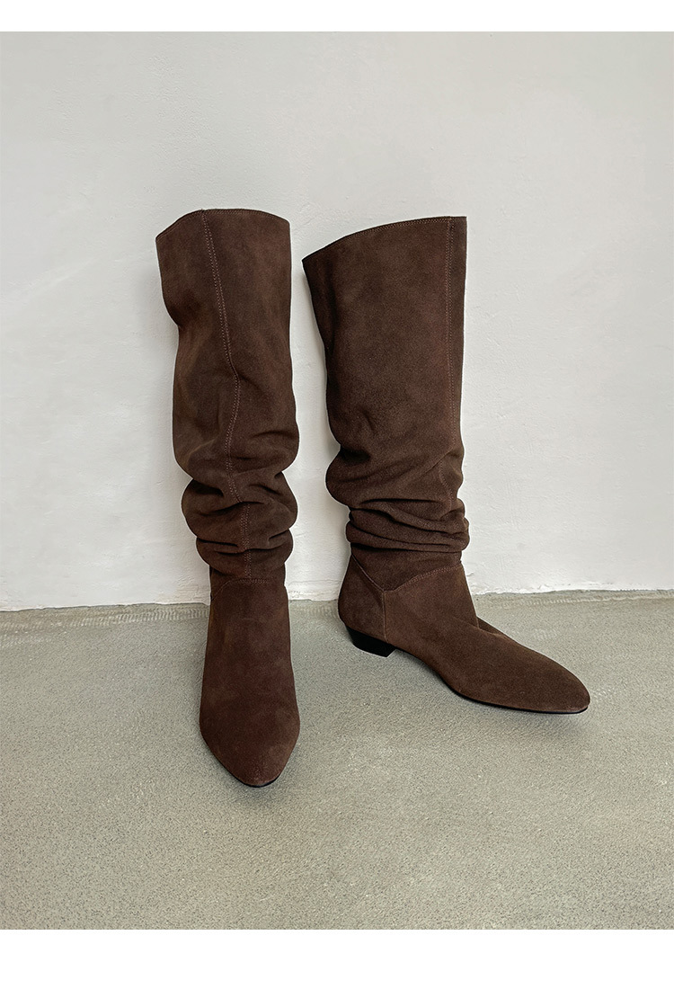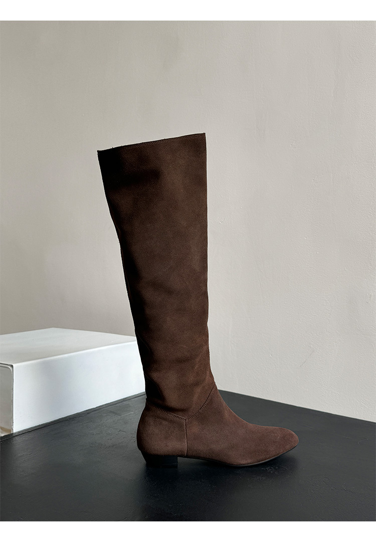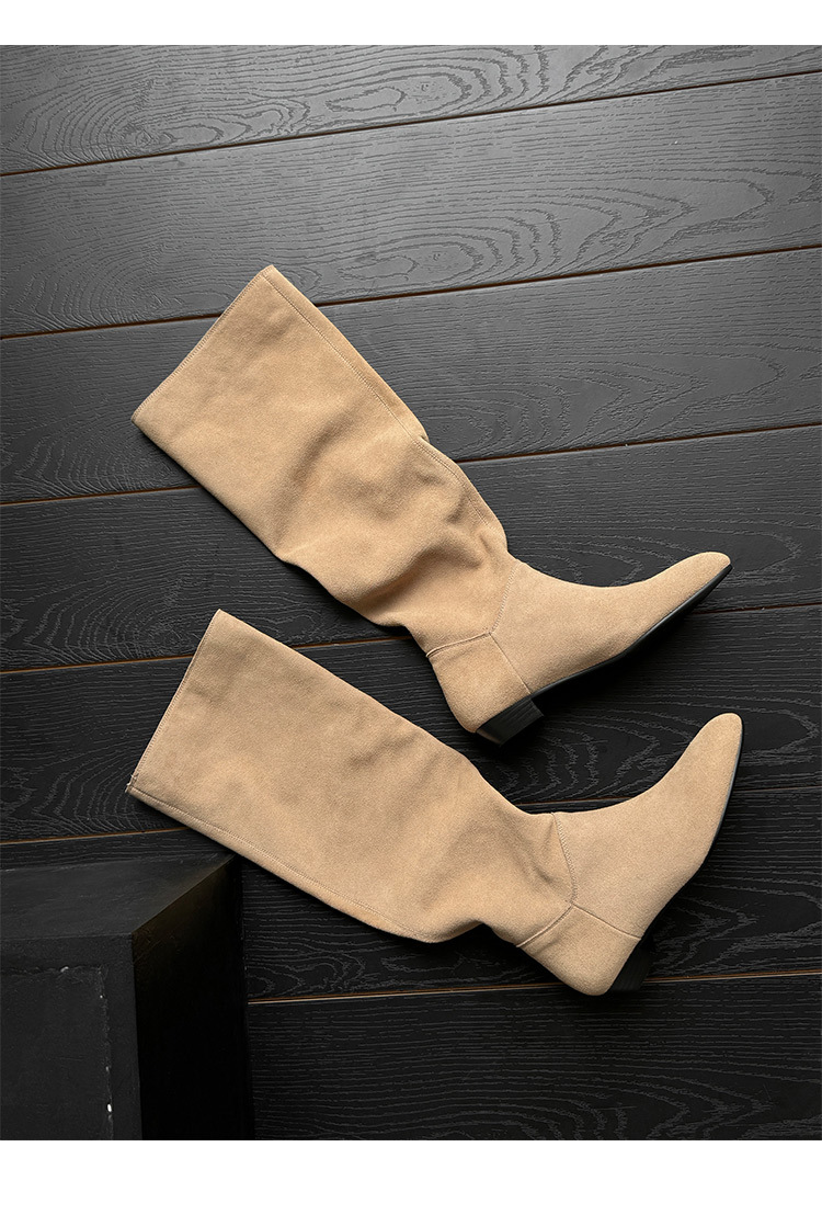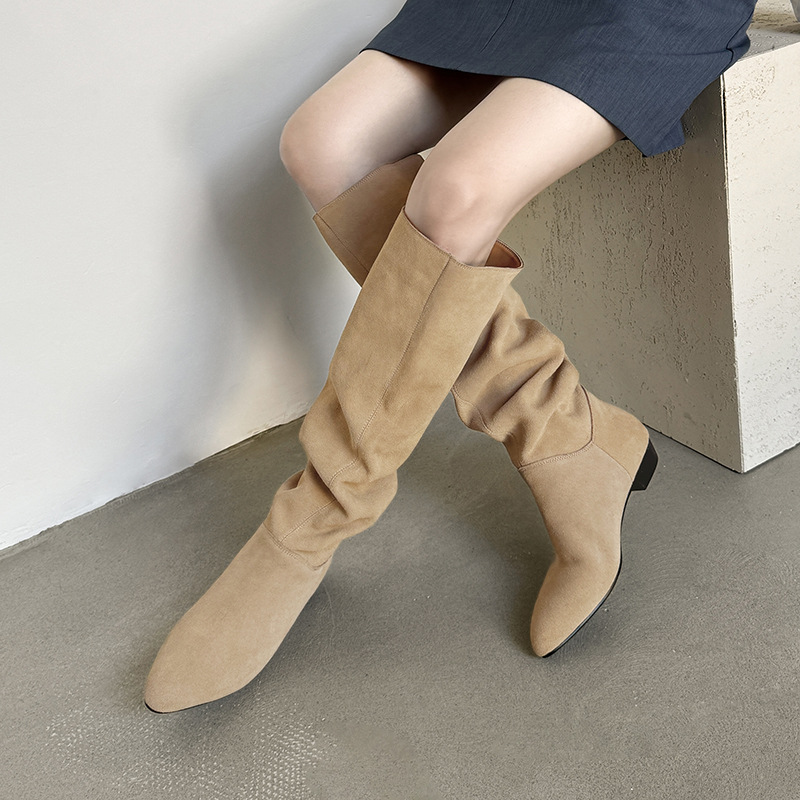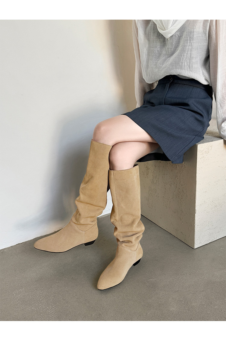 패션 트렌드 프로스트 가죽 힙 부츠 여성의 2024 가을과 겨울 새로운 포인팅 원핀 편안한 로우 힐 롱 부츠
