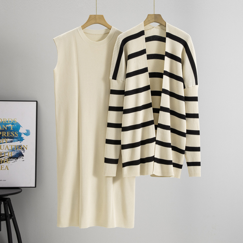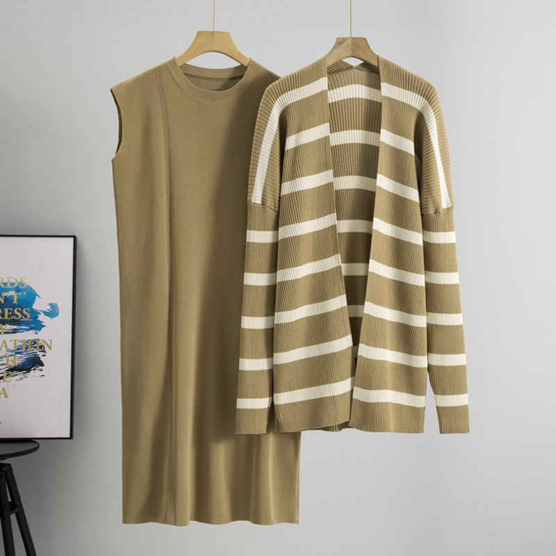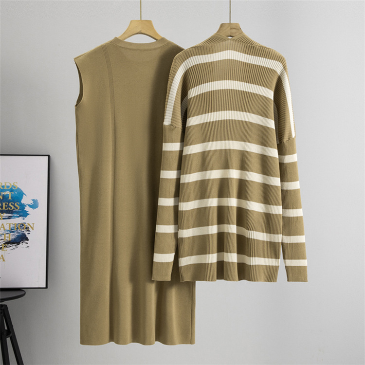여성용 가을 루즈핏 중간 길이 스트라이프 스웨터 스커트 니트 투피스 세트 (크로스보더 캐주얼 무역)