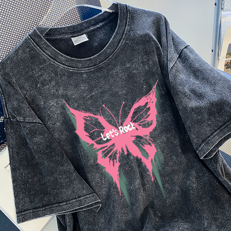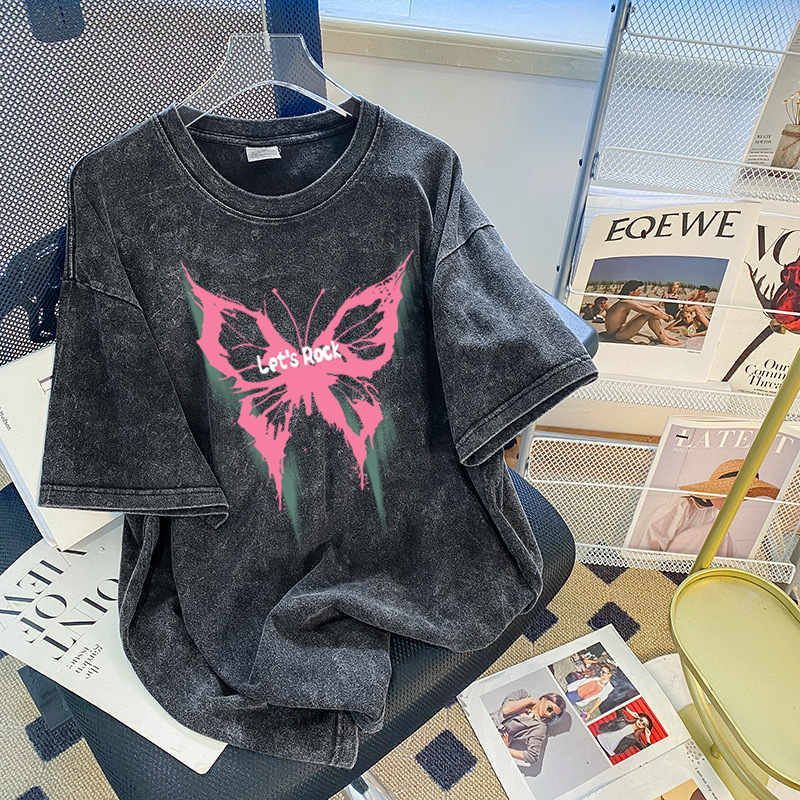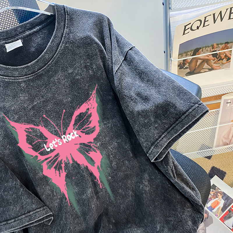 아메리칸 스타일 하이 스트리트 올드 세탁 반팔 티셔츠 남녀 여름 코튼 느슨한 나비 인쇄 올 매치 반소매 티 트렌디 브랜드스토어 가기