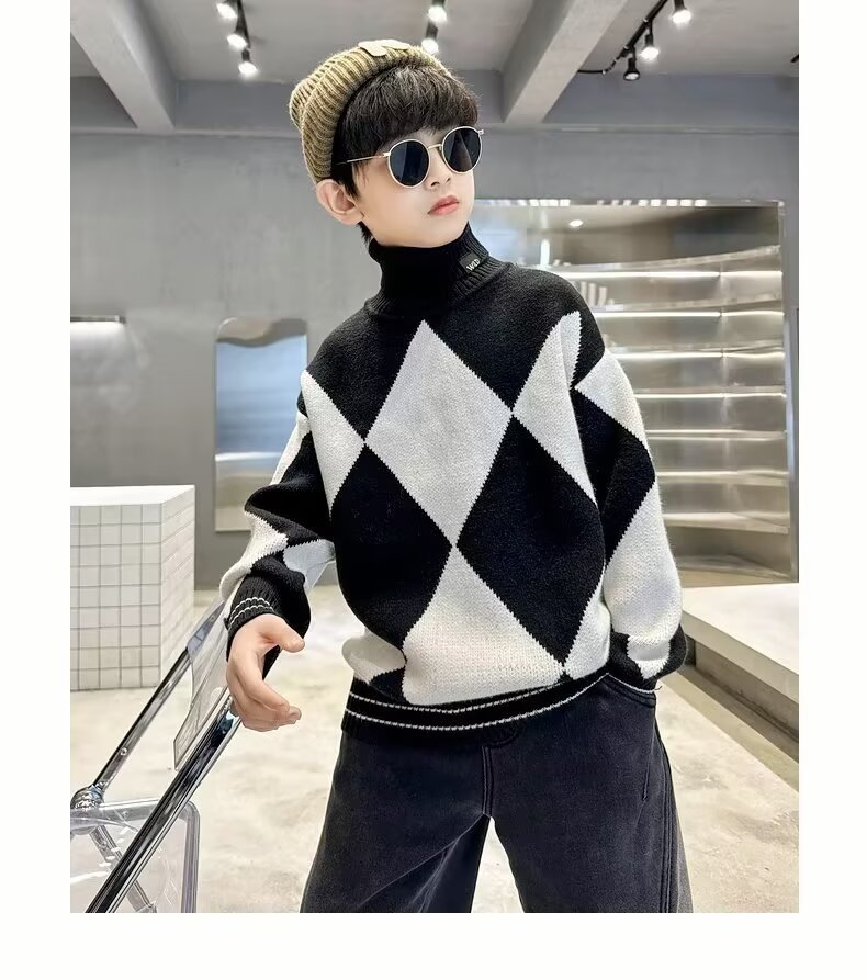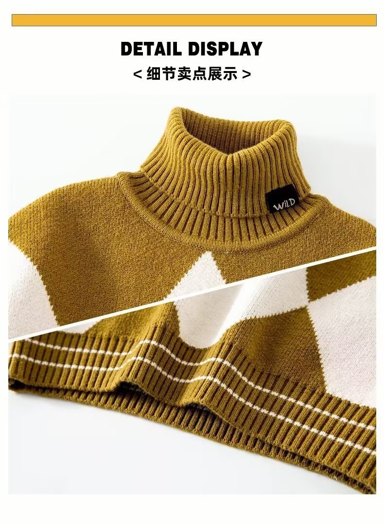 어린이 겨울복 소년 스웨터 2024 새로운 소년 가을과 겨울 높은 칼라 두꺼운 컬러 블록 니트 탑 큰 어린이 유행