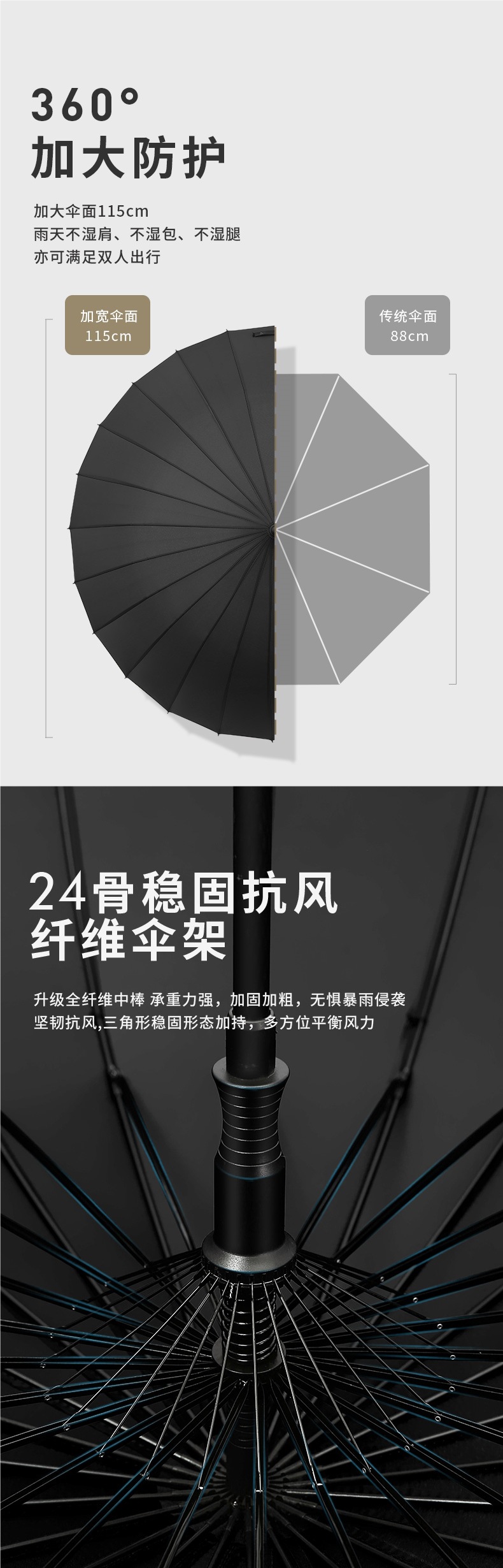 • [풀 파이버 미디엄 로드 + 방풍 섬유 뼈]⭐방수 케이스 24리브 확대 클래식 블랙 - 폭풍우 방지 우산