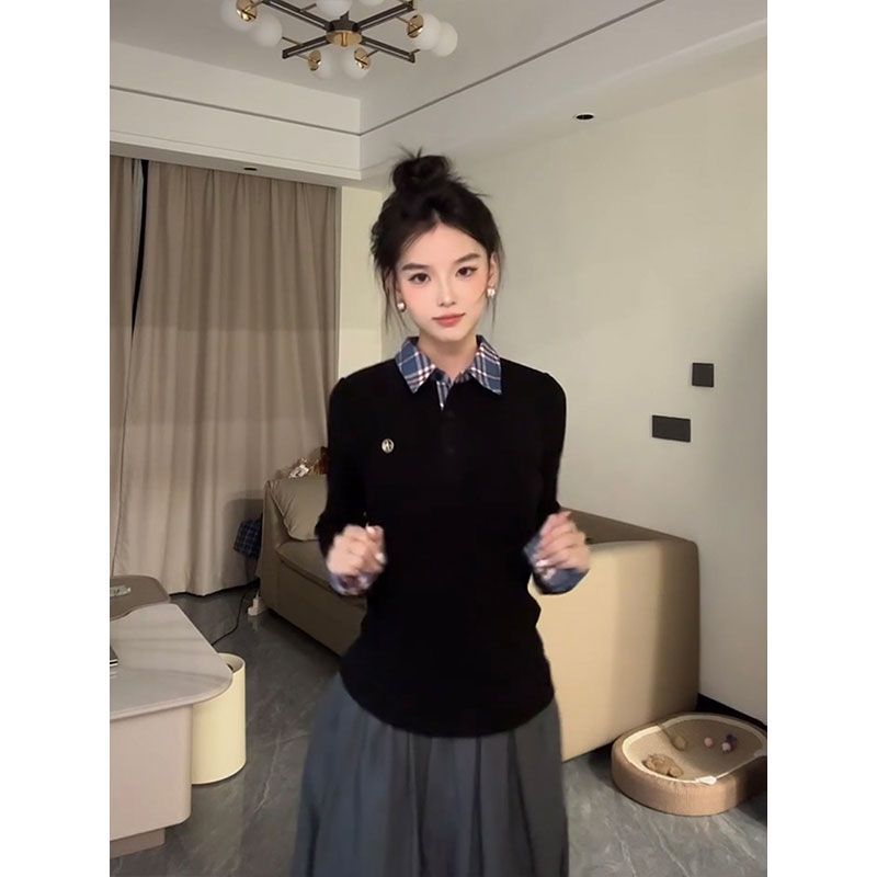 가짜 2 피스 격자 무늬 바느질 폴로 칼라 긴 소매 티셔츠 여성의 가을 및 겨울 디자인 감각 슬림-피트베이스 셔츠 최고 봄스토어 가기
