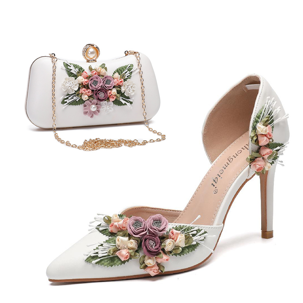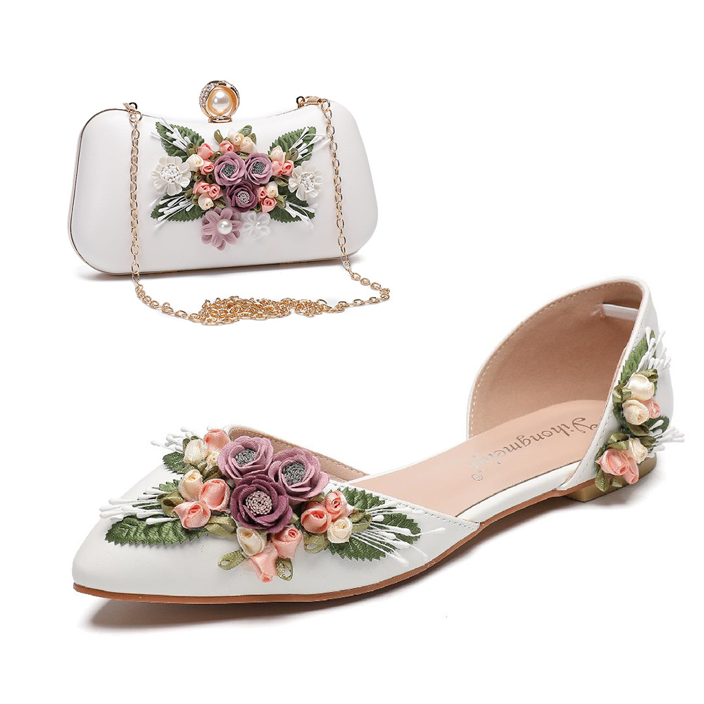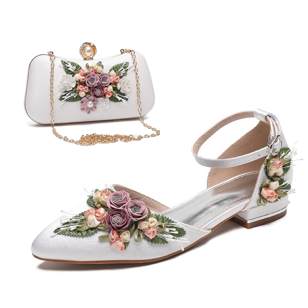 2025 새로운 스타일의 한국식 로우탑 솔리드 컬러 포인티드 토 데일리 웨딩 연회 플라워 슈즈와 가방 조합 여성 신발스토어 가기
