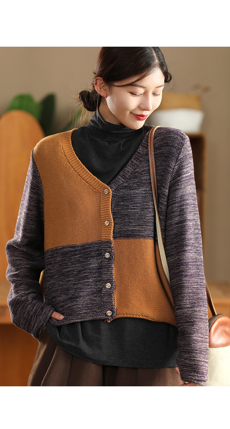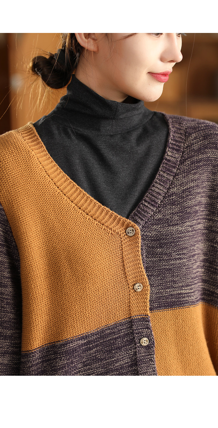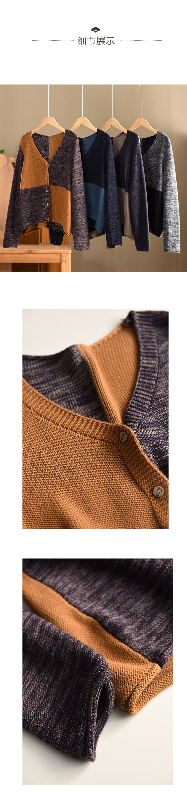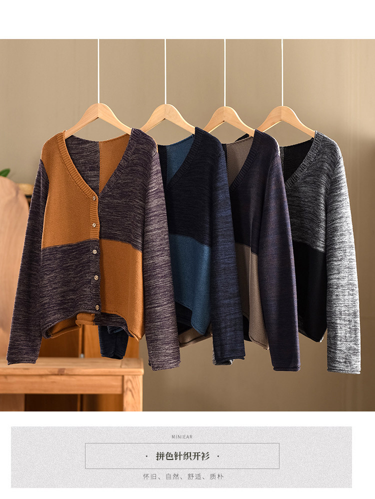 겨울 새로운 레트로 컬러 블록 니트 카디건 여성 예술 싱글 브레스트 V 넥 코튼 코트 탑 스웨터