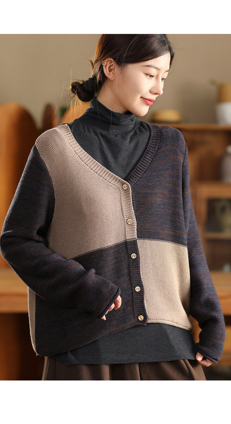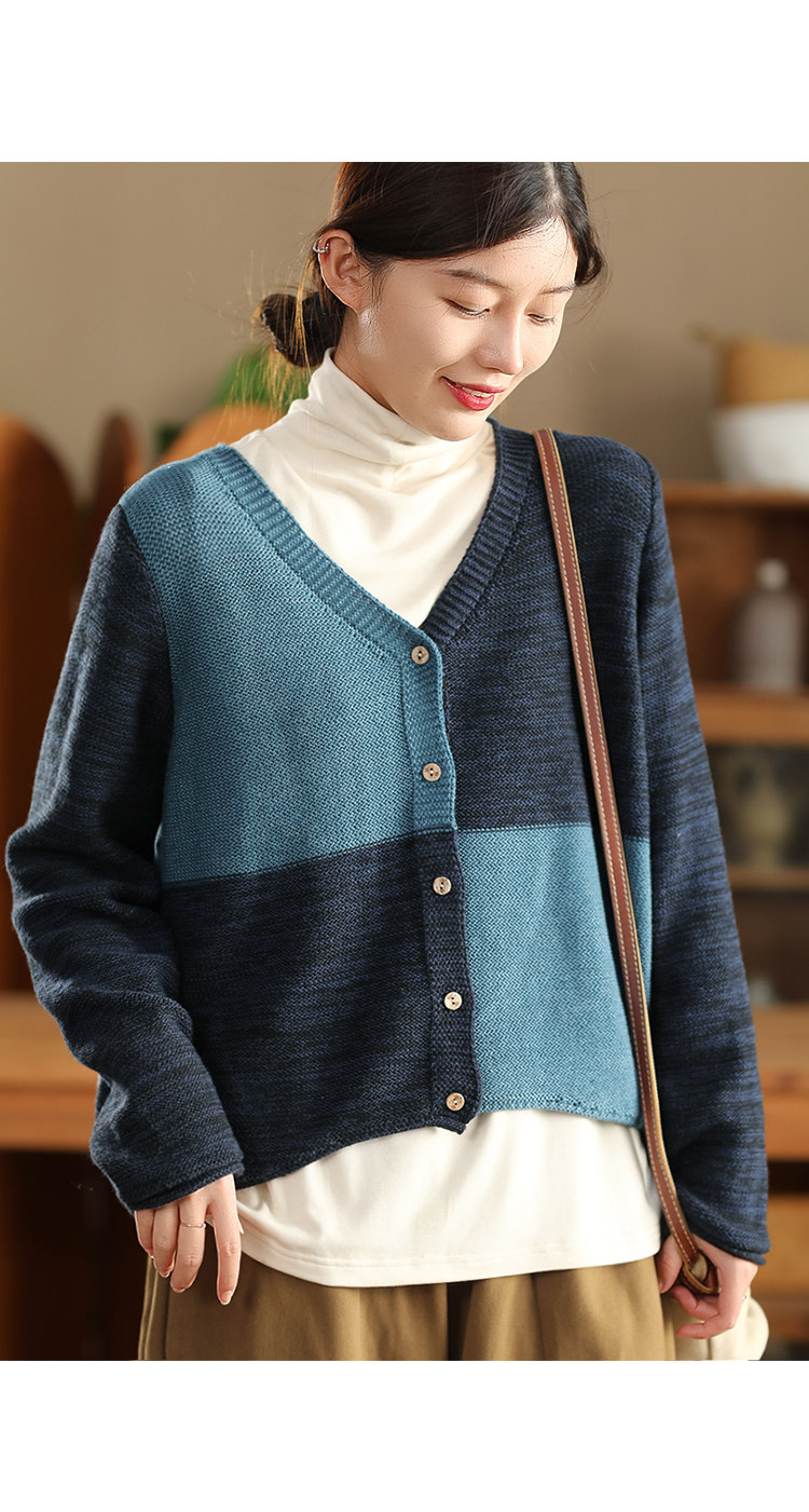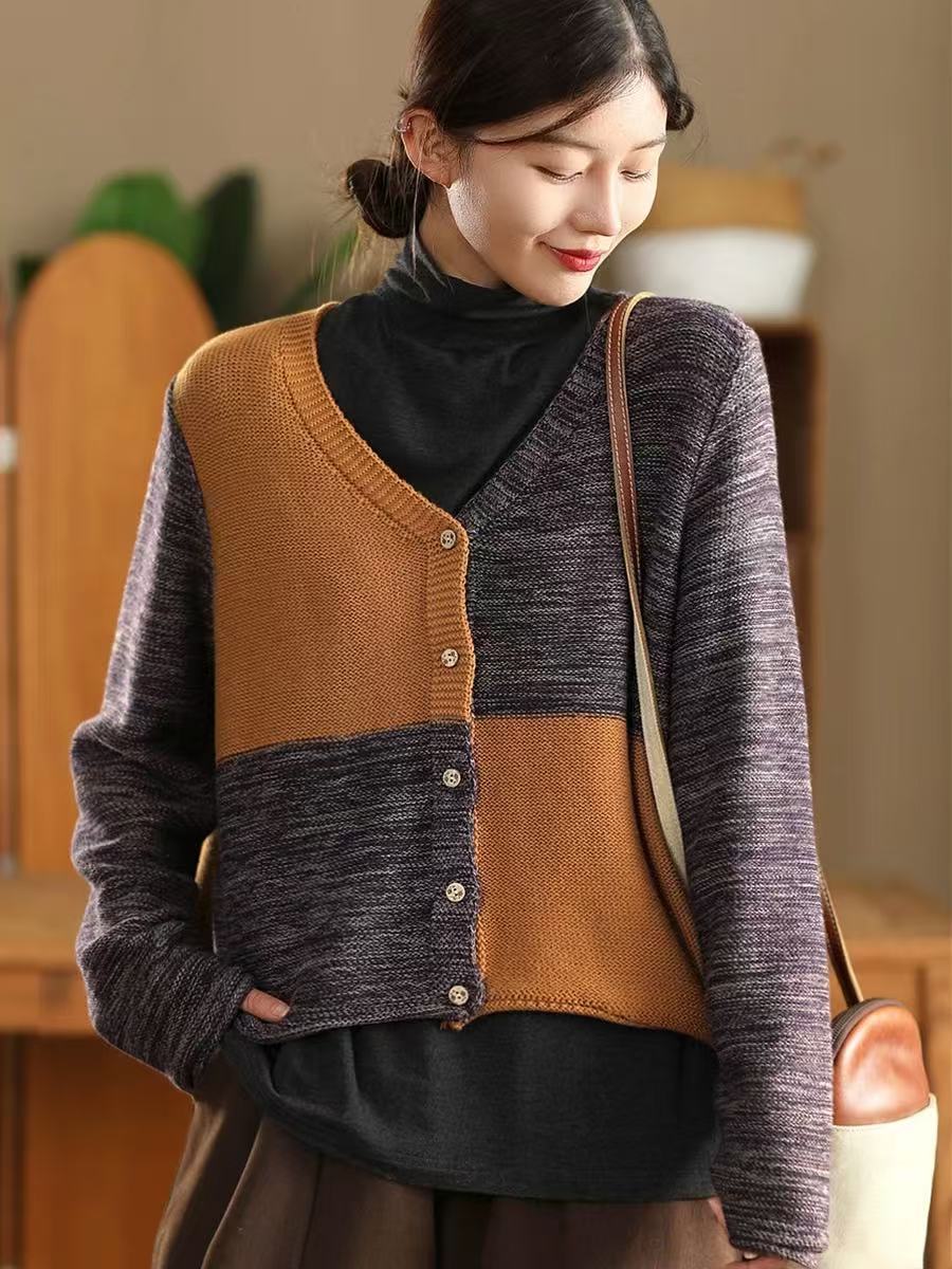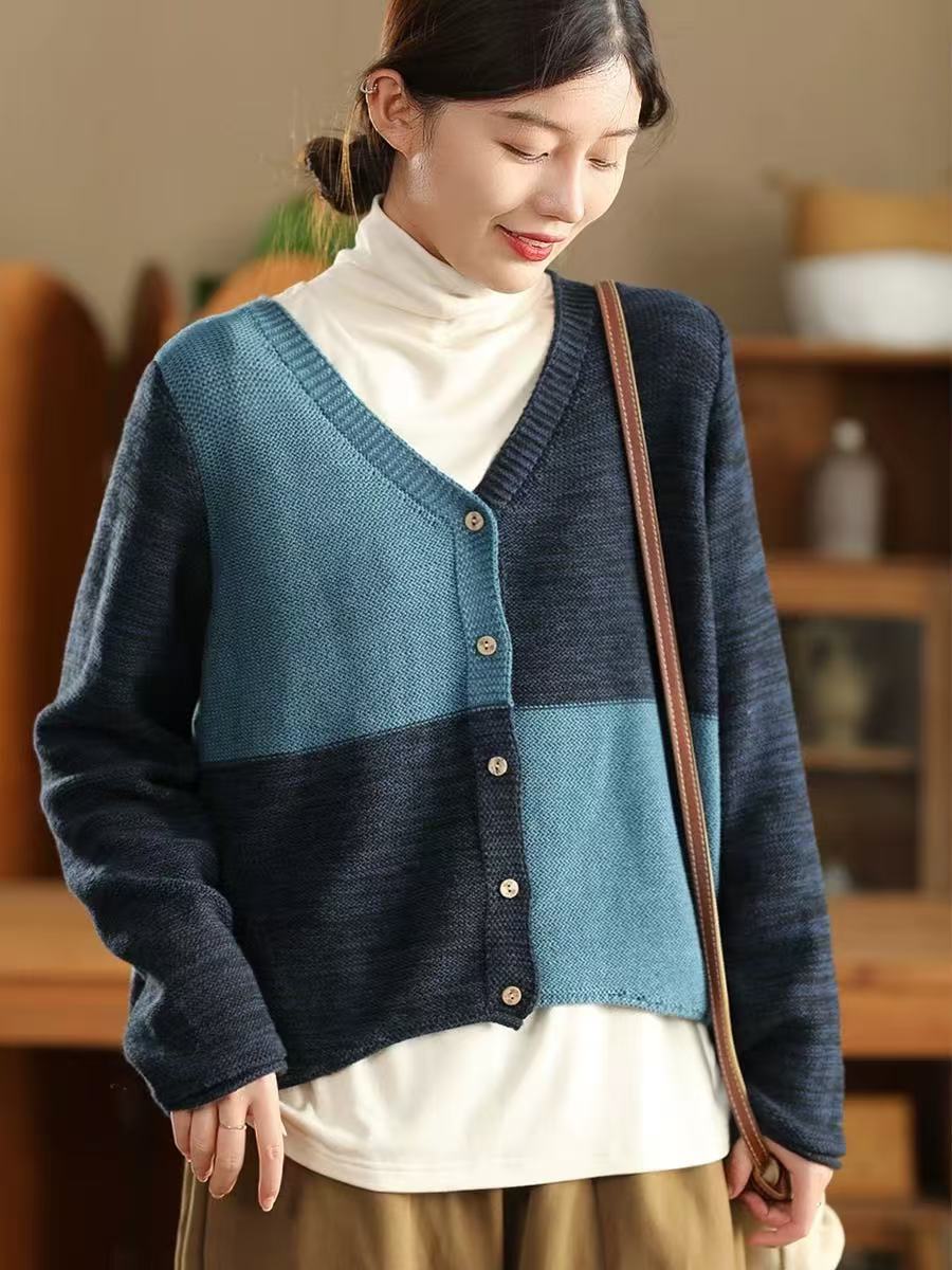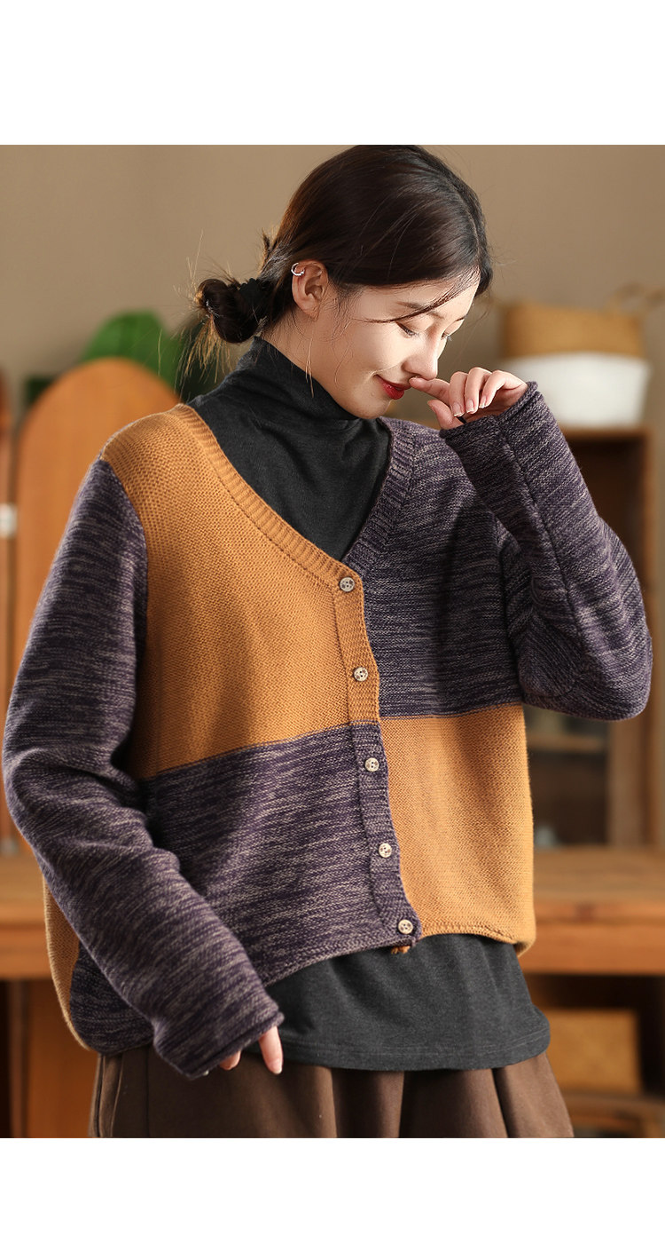 겨울 새로운 레트로 컬러 블록 니트 카디건 여성 예술 싱글 브레스트 V 넥 코튼 코트 탑 스웨터