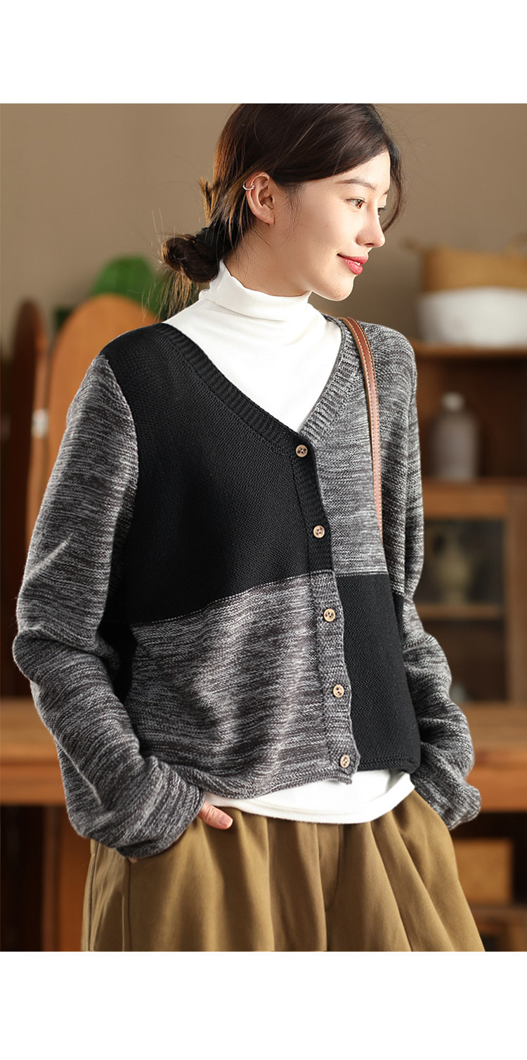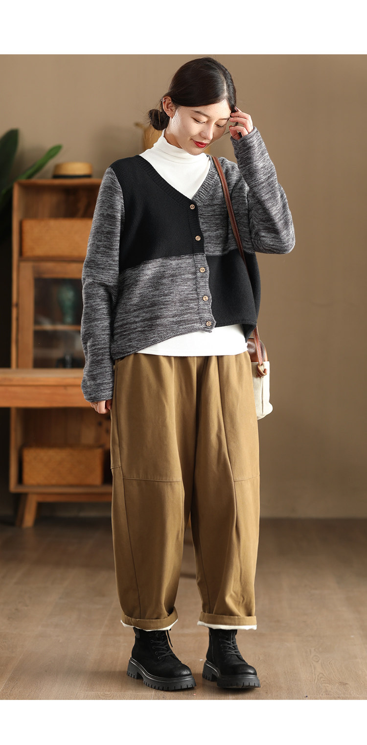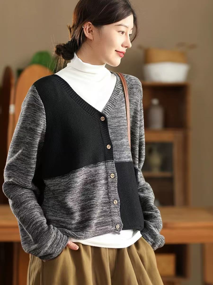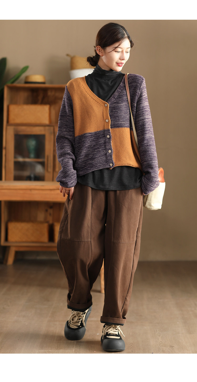 겨울 새로운 레트로 컬러 블록 니트 카디건 여성 예술 싱글 브레스트 V 넥 코튼 코트 탑 스웨터