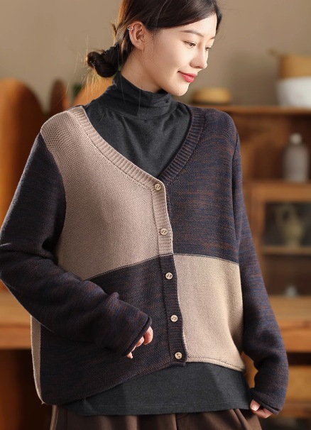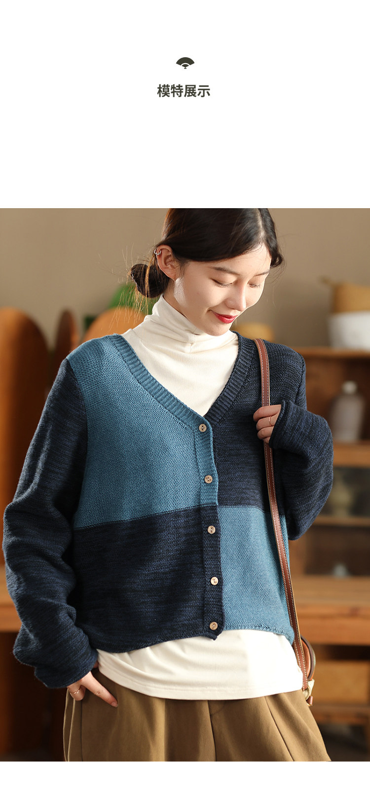 겨울 새로운 레트로 컬러 블록 니트 카디건 여성 예술 싱글 브레스트 V 넥 코튼 코트 탑 스웨터스토어 가기