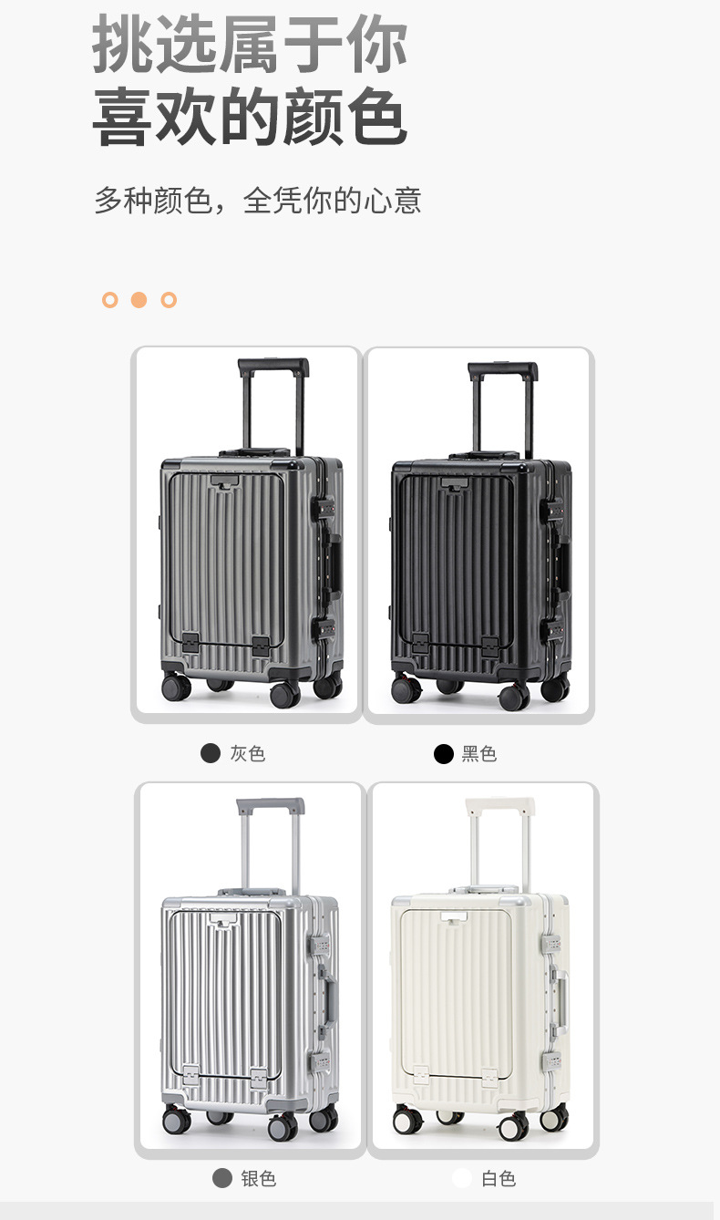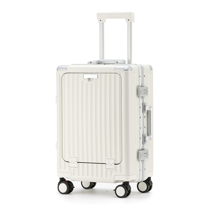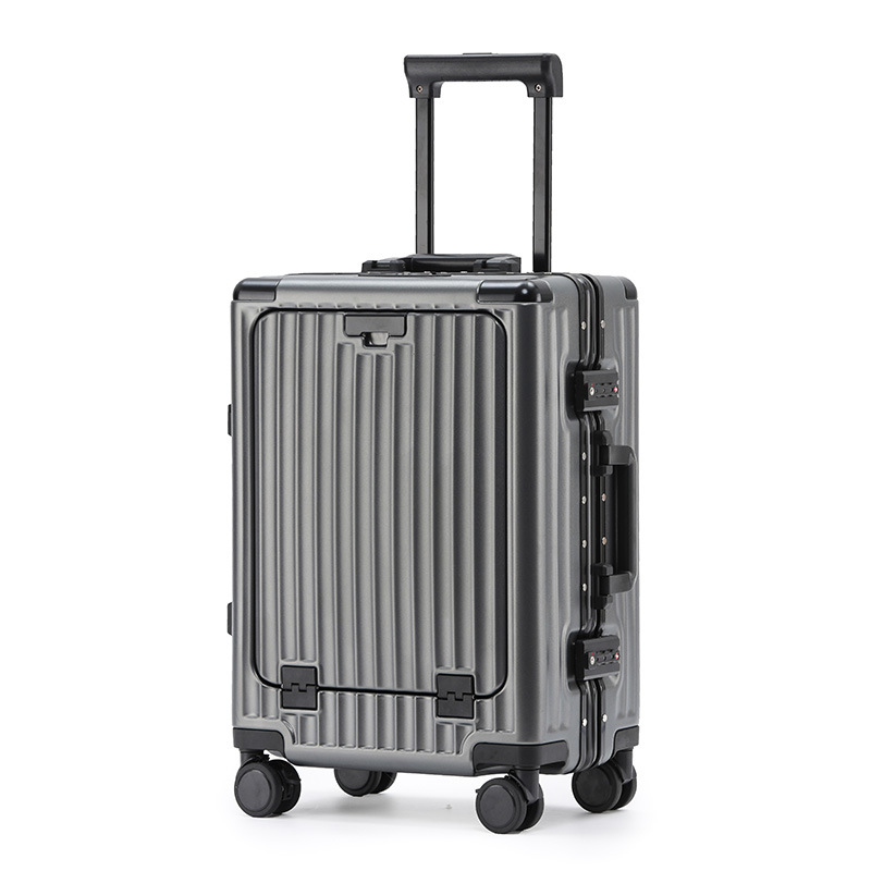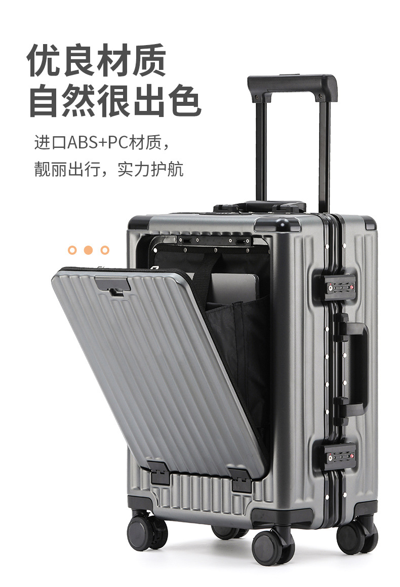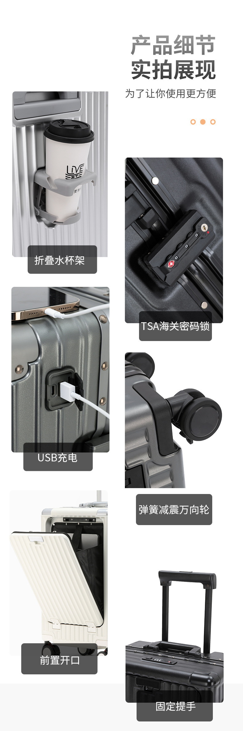 USB 충전 범용 휠 새로운 여행 가방 전면 오픈 커버 다기능 수하물 알루미늄 프레임 트롤리 케이스