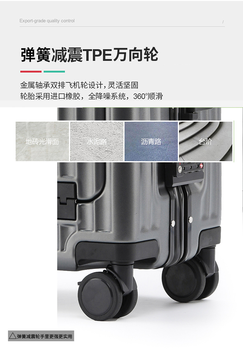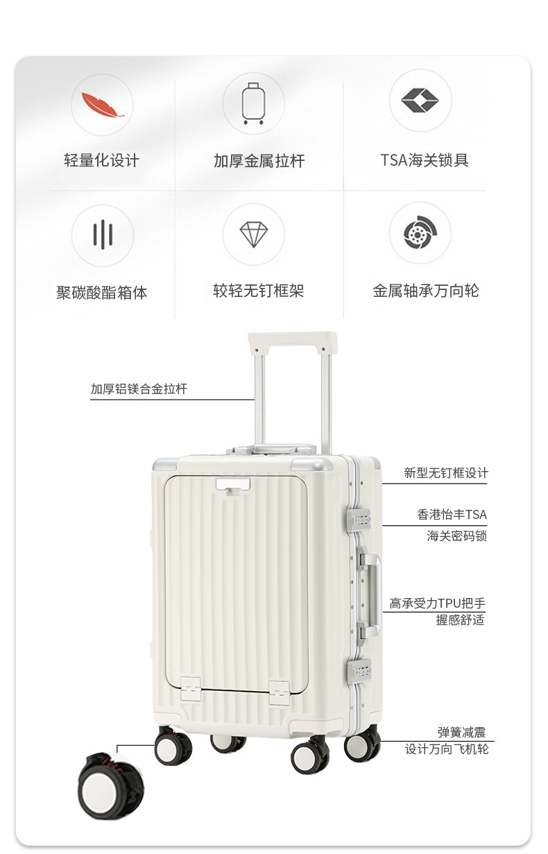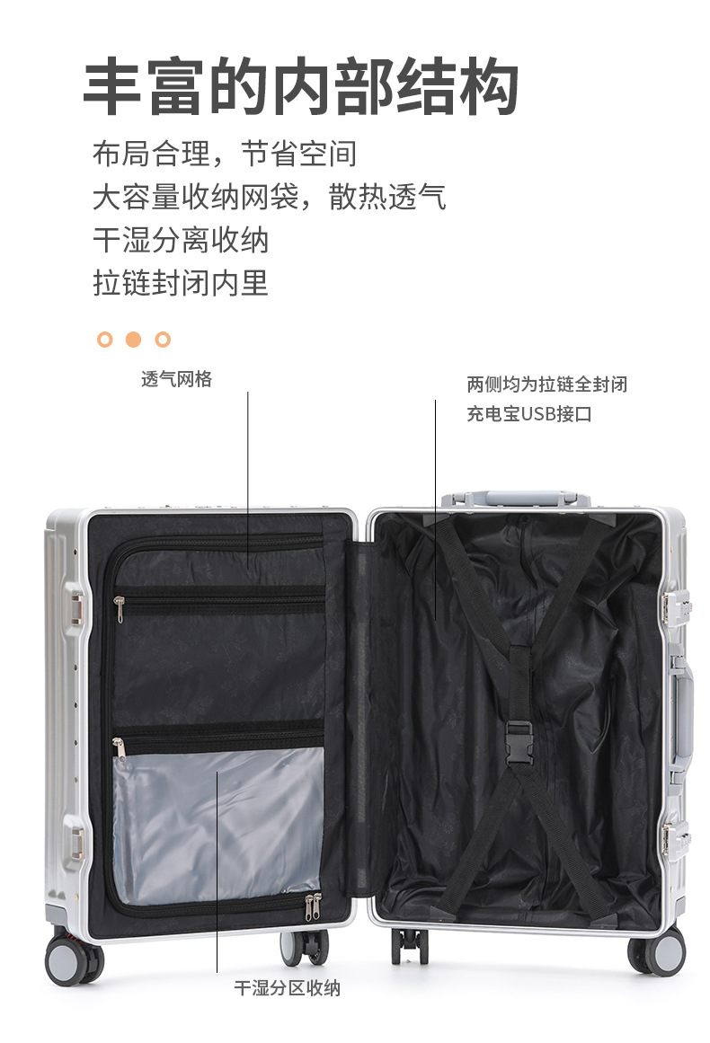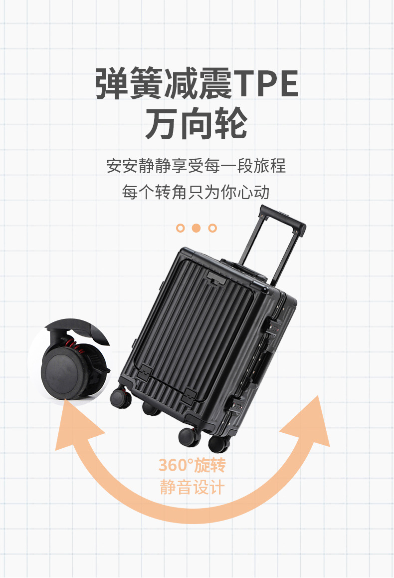 USB 충전 범용 휠 새로운 여행 가방 전면 오픈 커버 다기능 수하물 알루미늄 프레임 트롤리 케이스