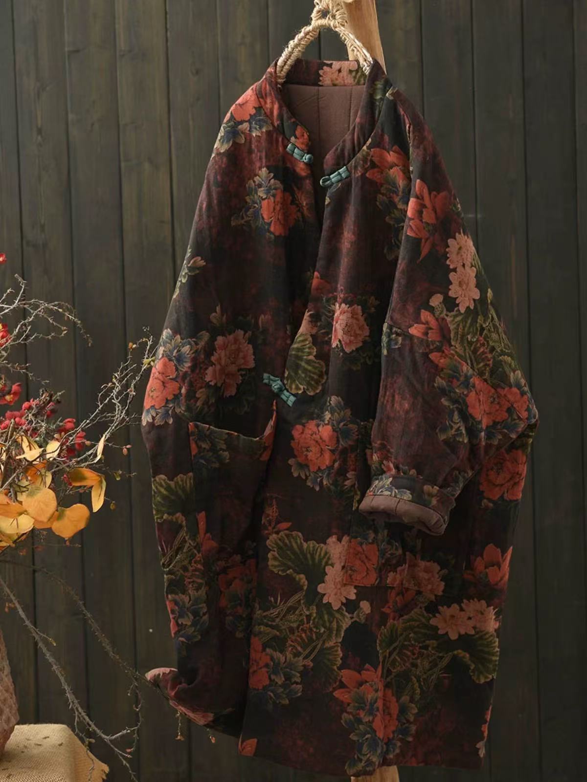 겨울 새로운 빈티지 민족 스타일 인쇄 경사 라켓 플레이트 버클 코튼 중간 길이 가운 최고 여성용 면화 패딩 코트스토어 가기