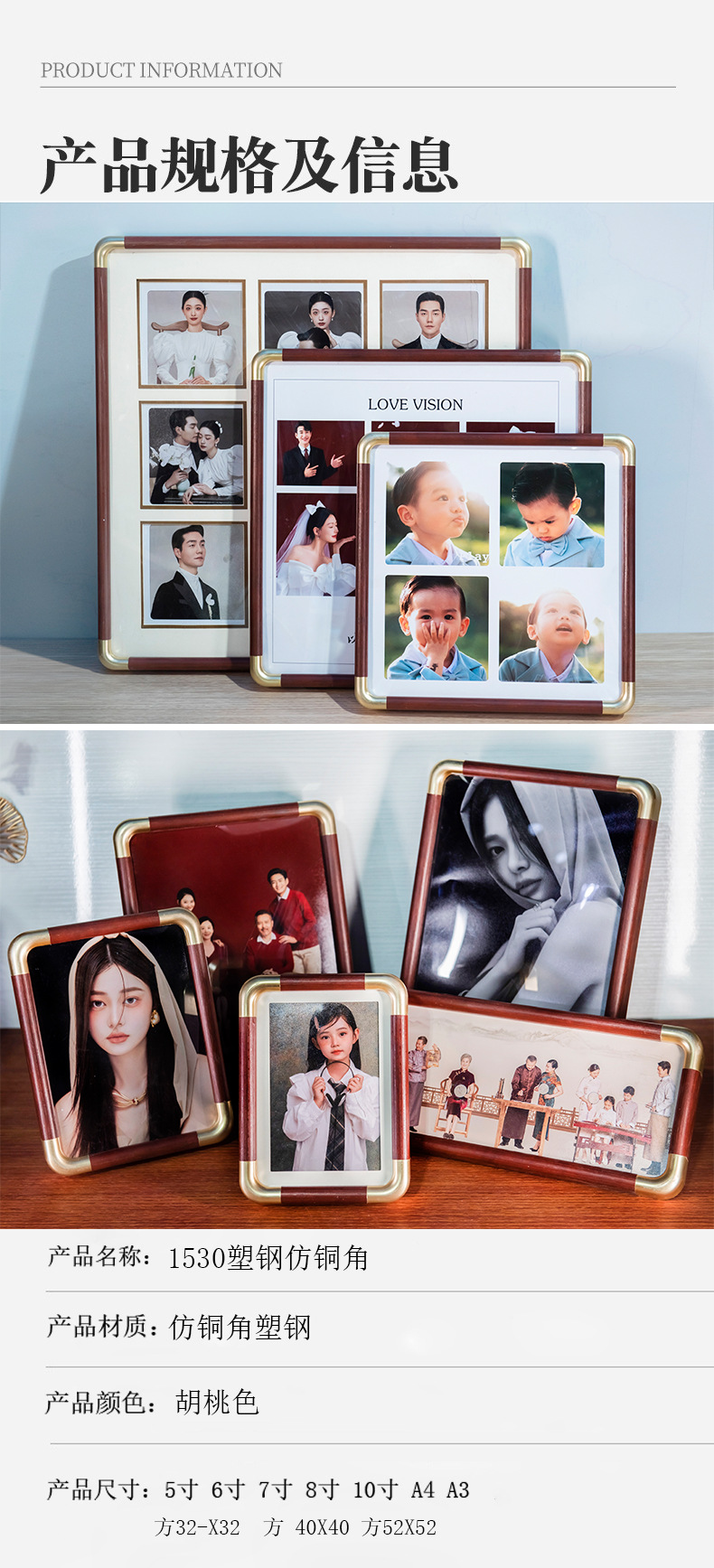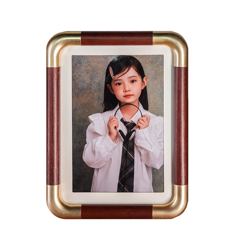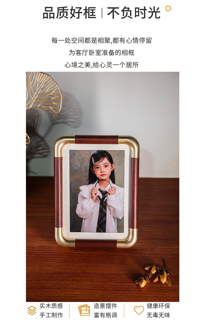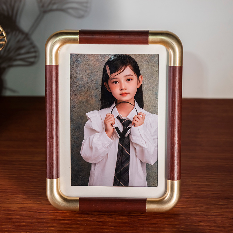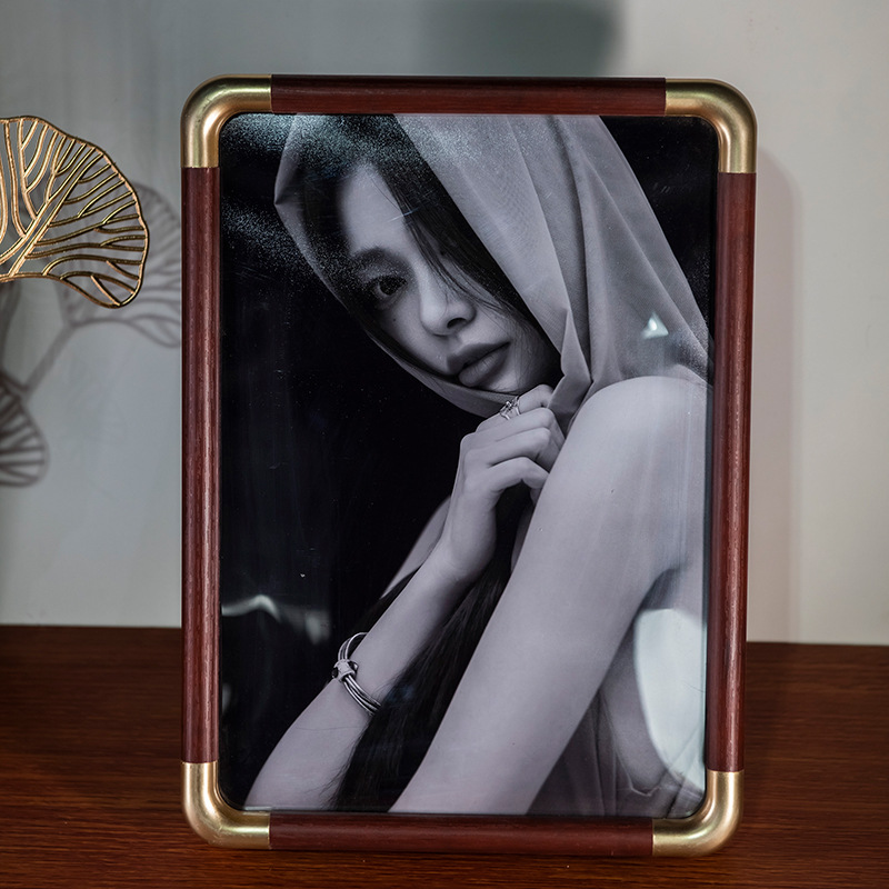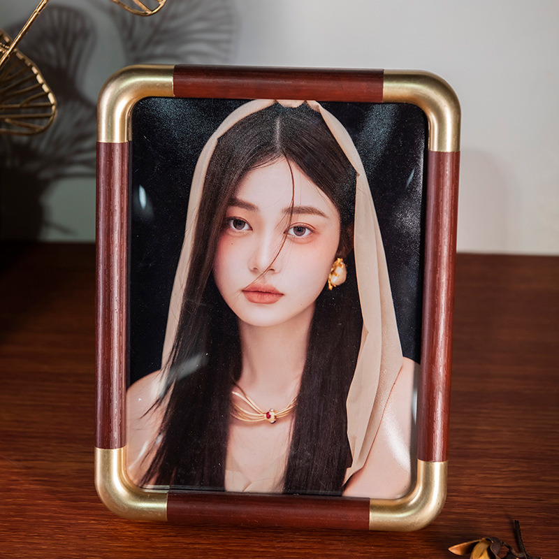 모조 구리 코너 둥근 그림 프레임 단단한 나무 질감 사진 프레임 테이블 도매 하이 엔드 데스크탑 장식 부티크 사진 프레임 제조 업체
