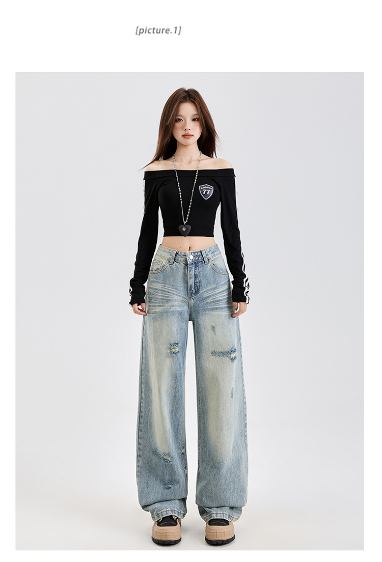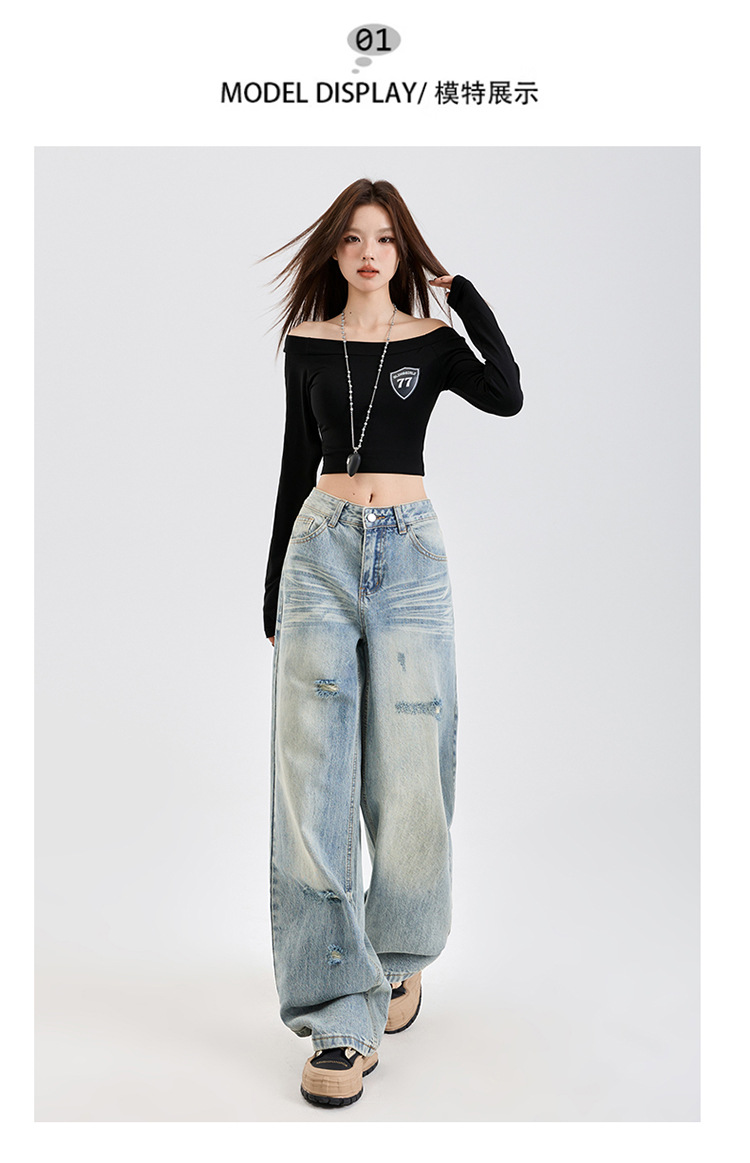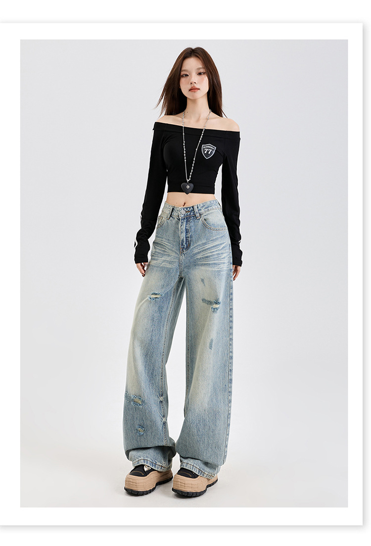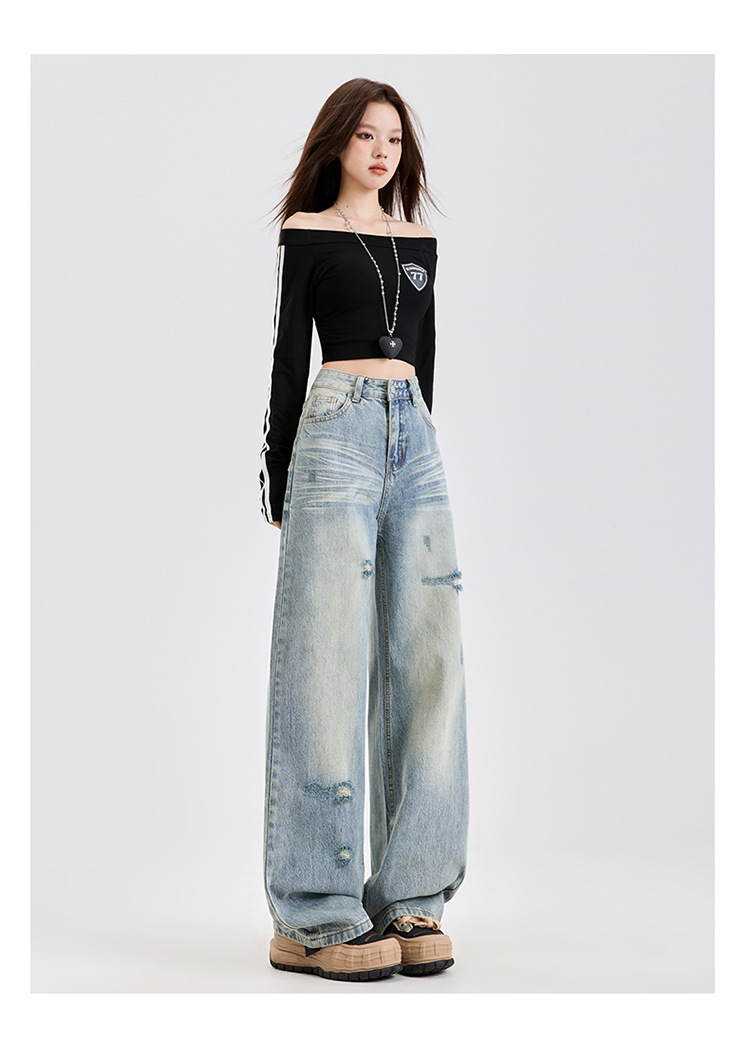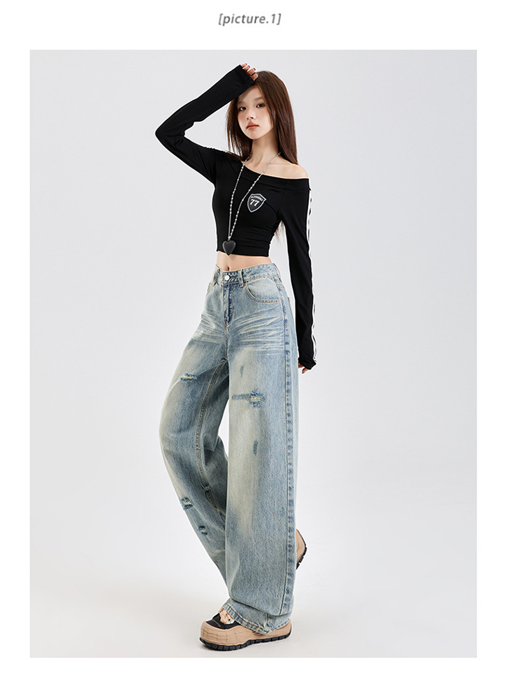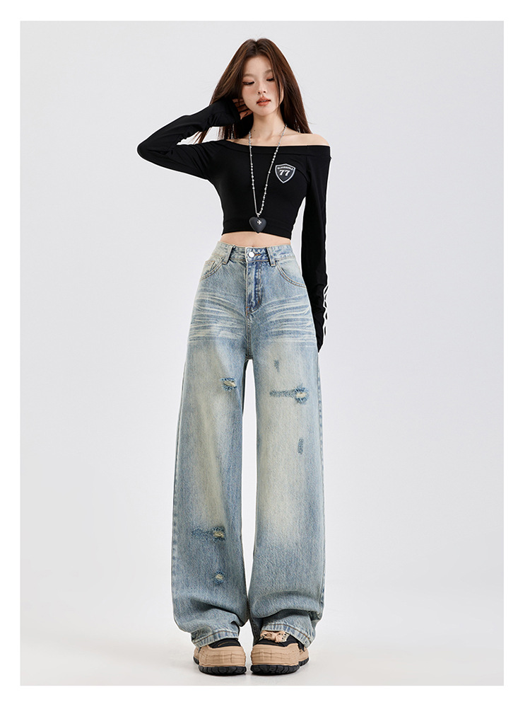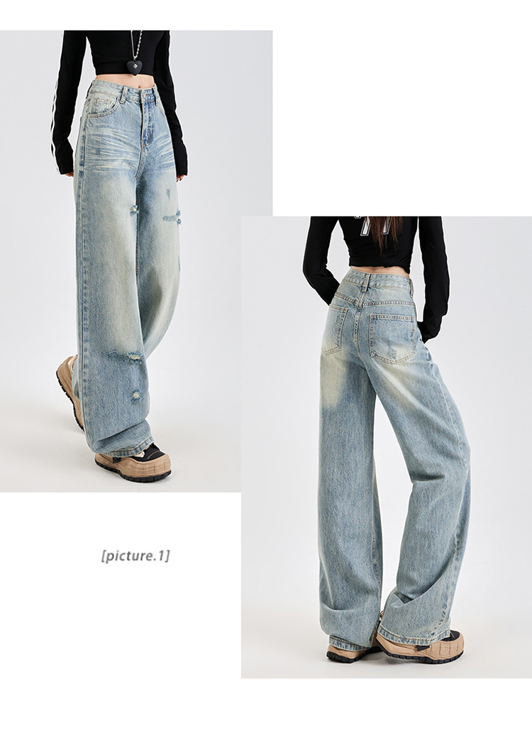 미국식 하이 스트리트 스트레이트 레그 청바지 여성의 2025 년 봄 새로운 파괴 세척 오래된 느슨한 슬리밍 바지