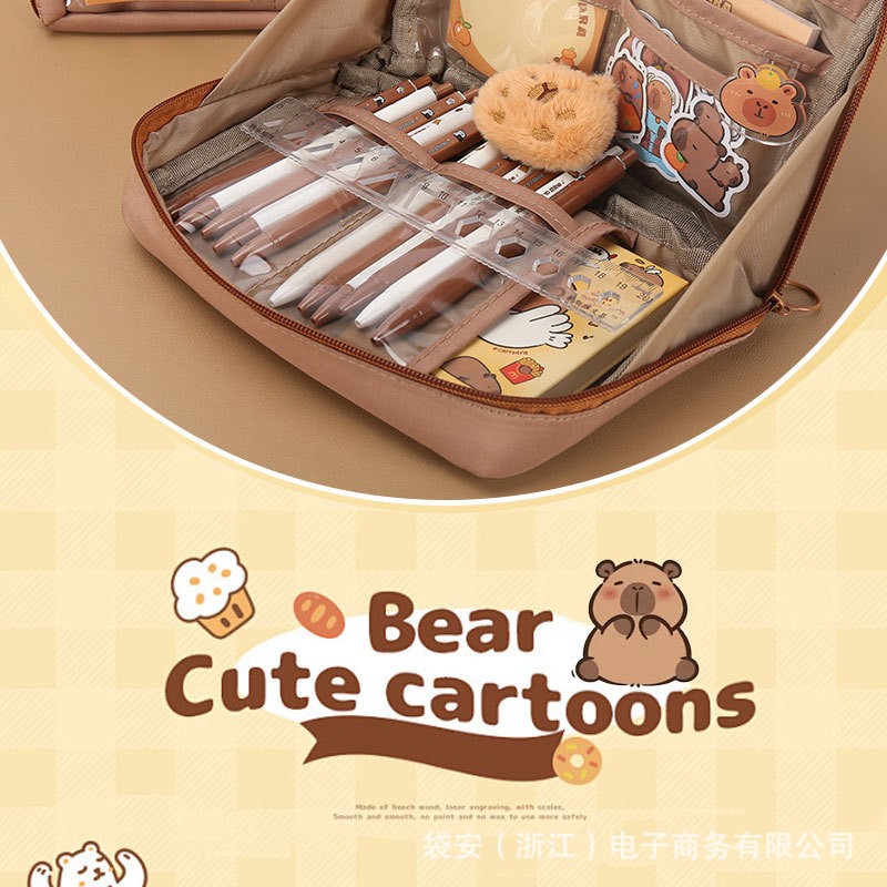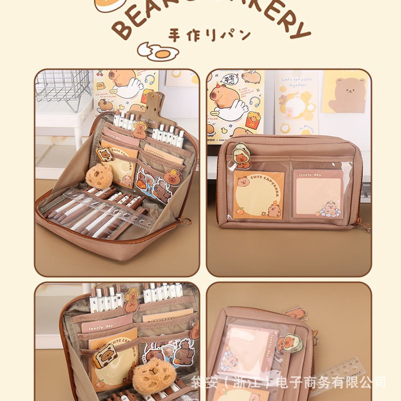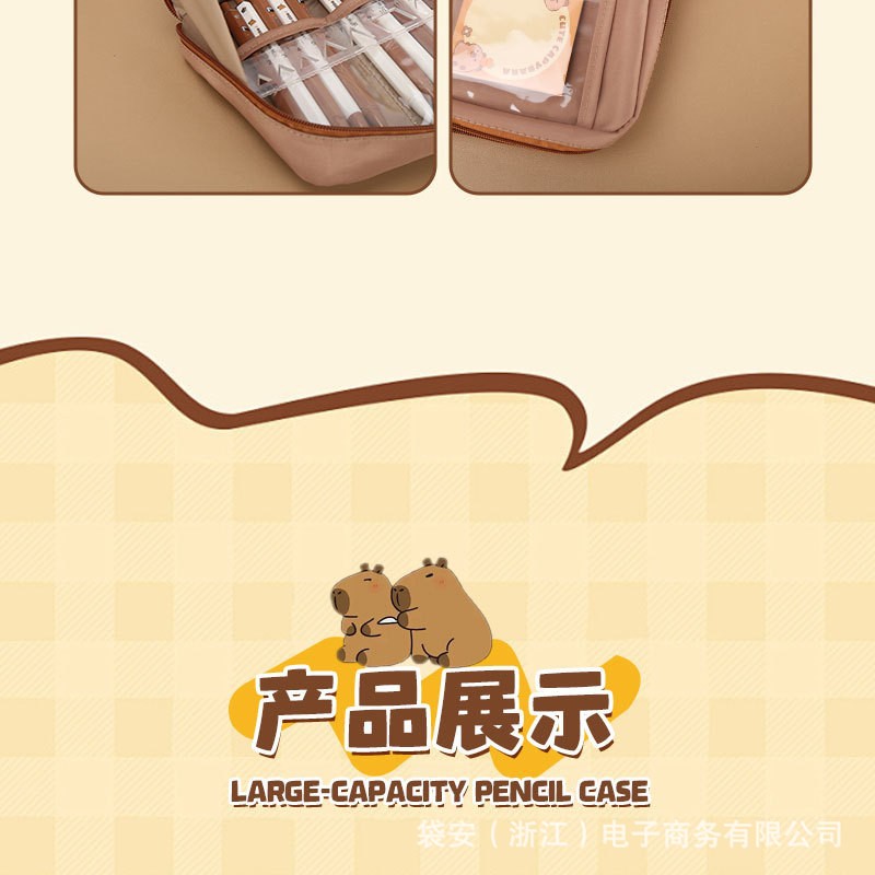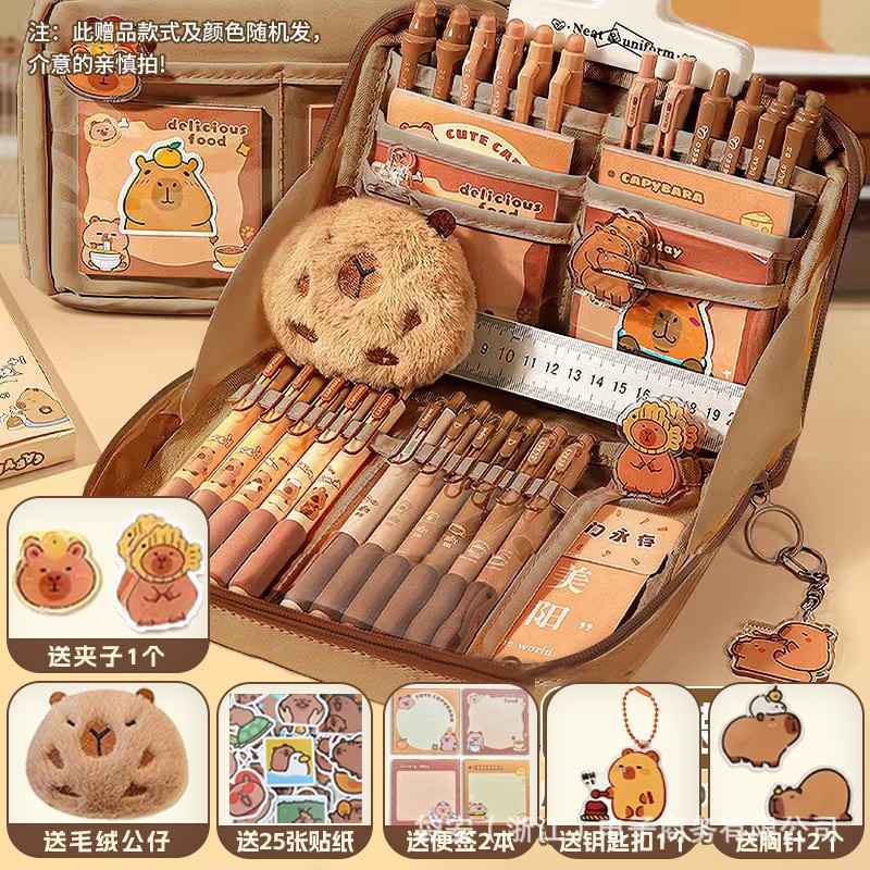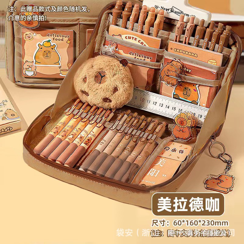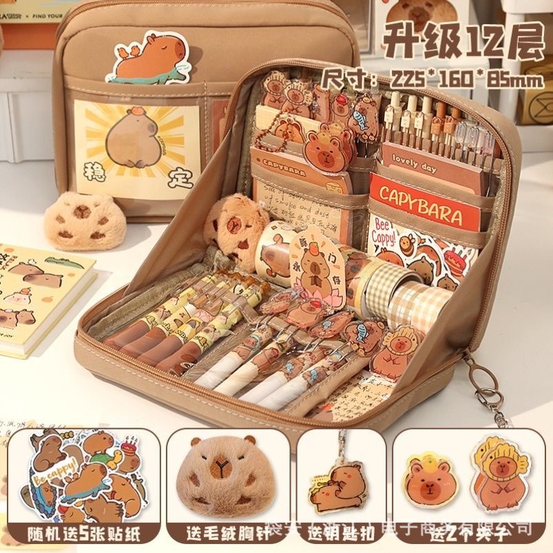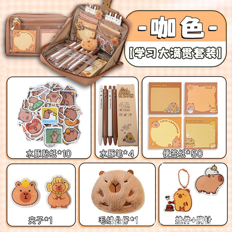 • 다층 스탠딩 필통 - 커피 + 카피바라 스티커 20개 + 브로치 2개 + 펜던트 + 노트 + 카피바라 인형