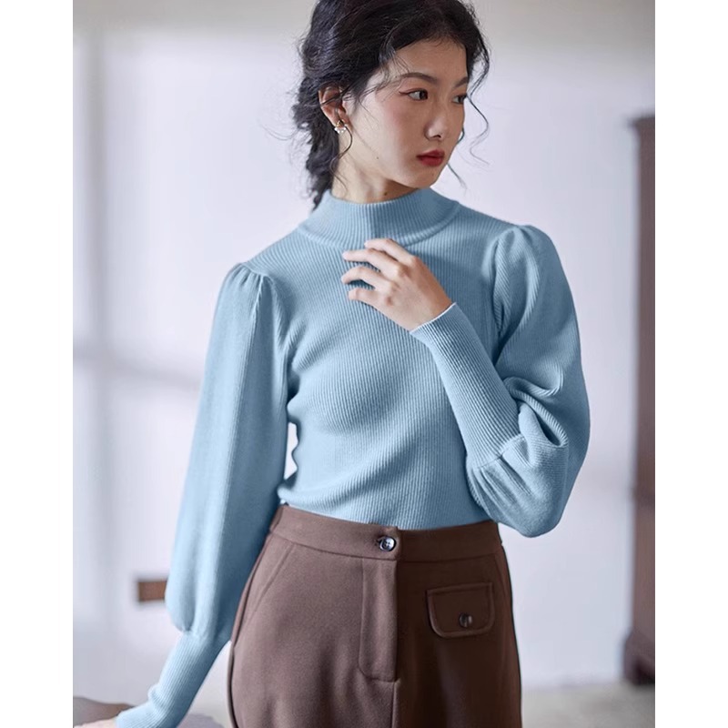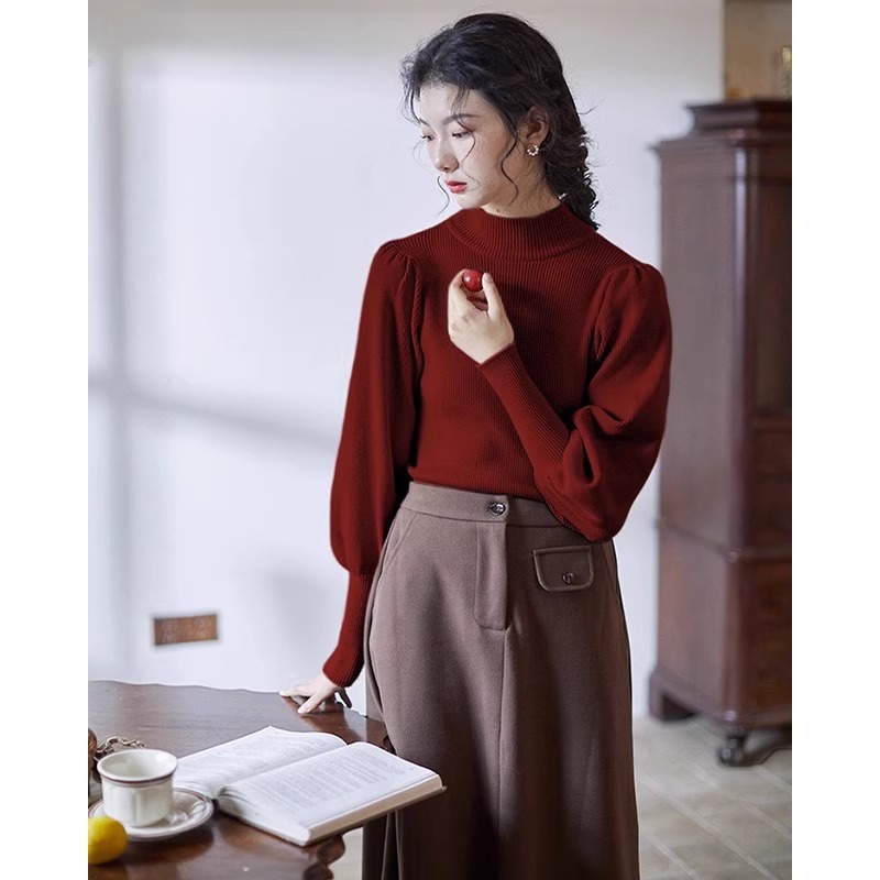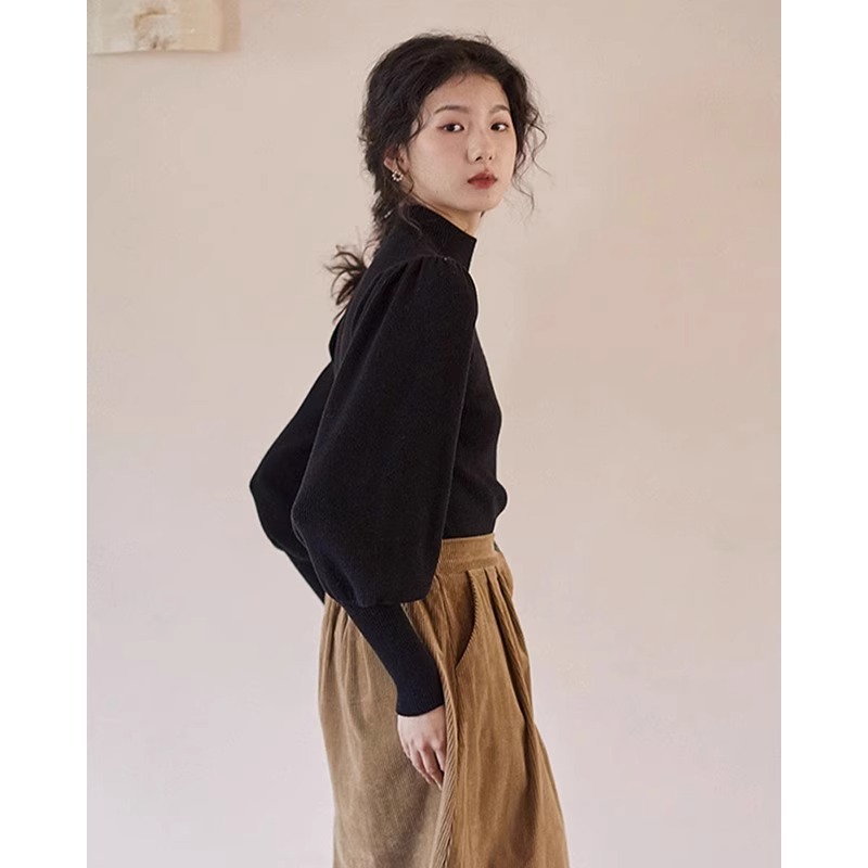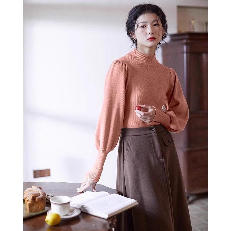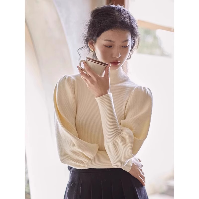 가을과 겨울 프랑스 복고풍 세미 하이 칼라 스웨터 여성 하이 엔드 센스 랜턴 슬리브 내베이스 스웨터 디자인 센스 탑스토어 가기
