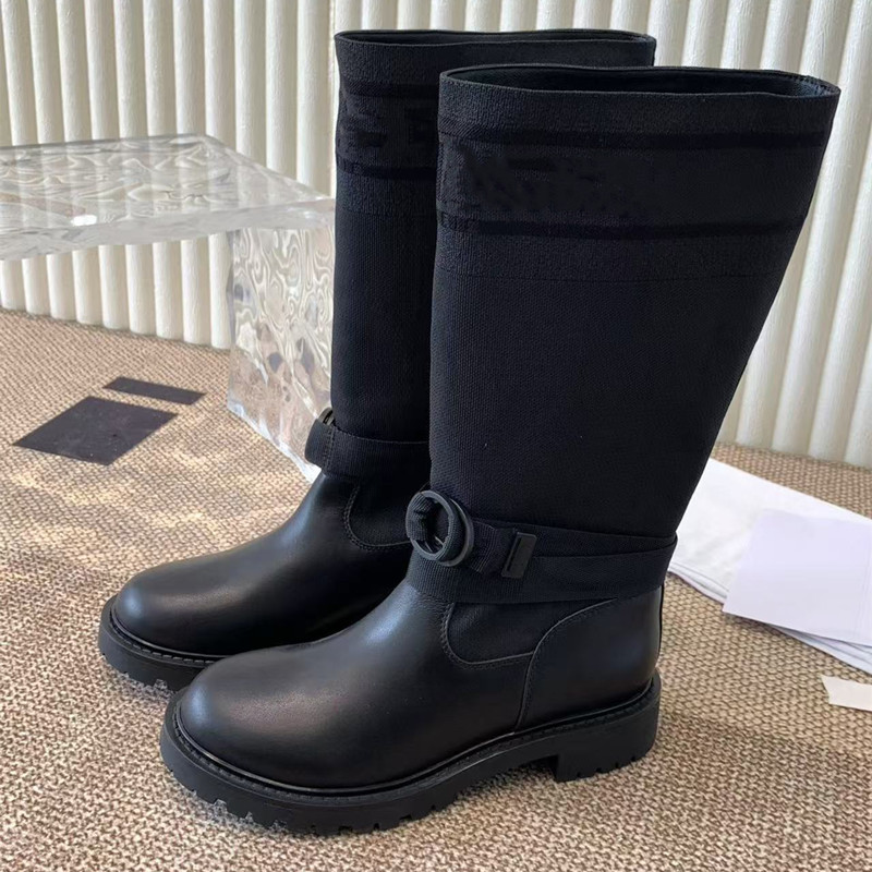하이 에디션 D 홈 레터 자수 양말 부츠 정품 가죽 컬러 접합 무릎 긴 부츠 두꺼운 하단 기사 부츠 여성을위한 얇은 부츠