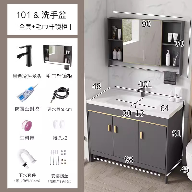 • 1m 그레이 골드 완전 밀폐형 바닥 + 수건 걸이 거울 캐비닛 고온 세라믹 세면대