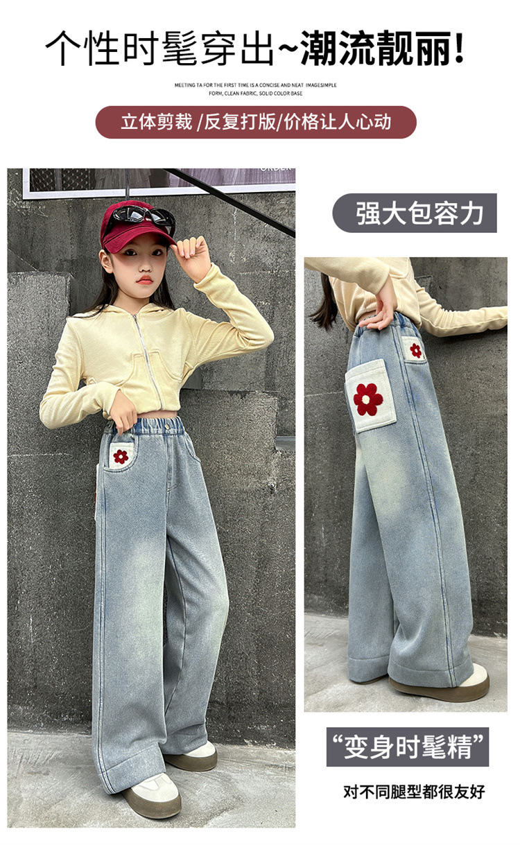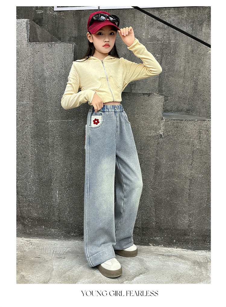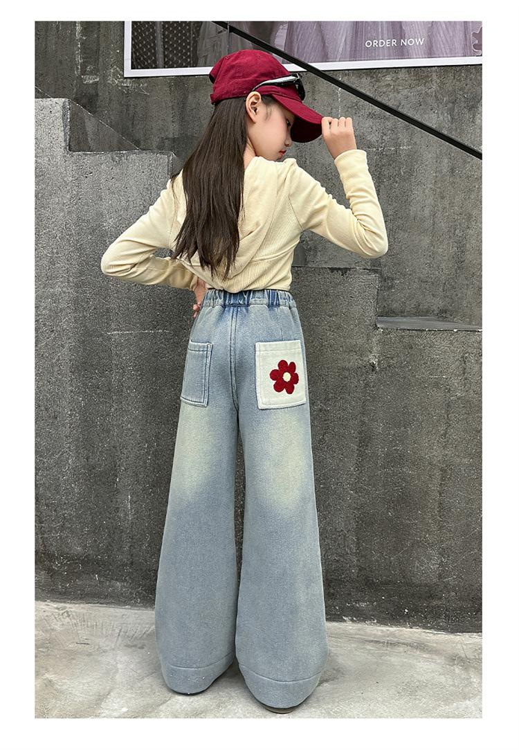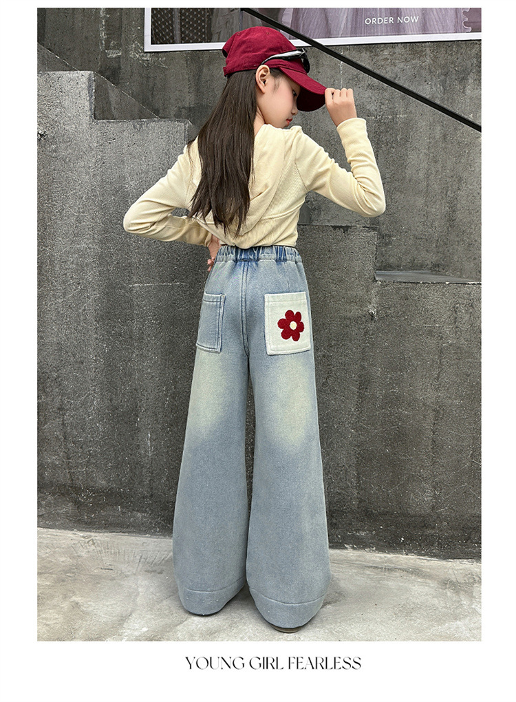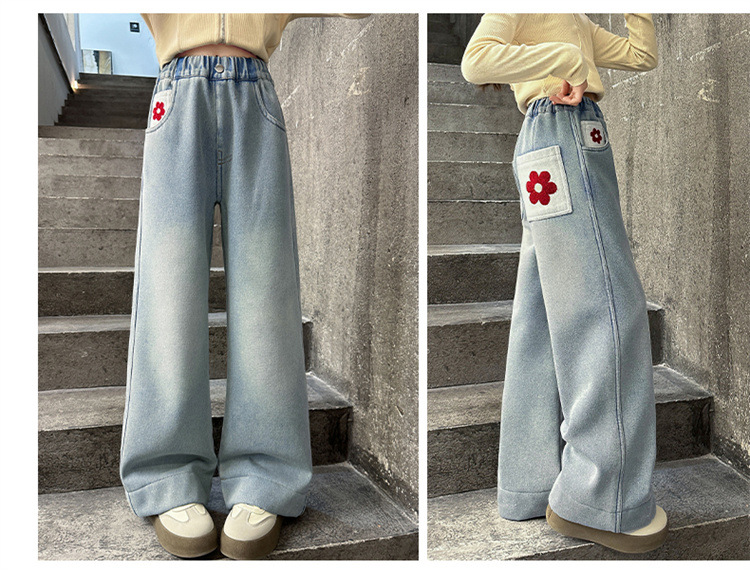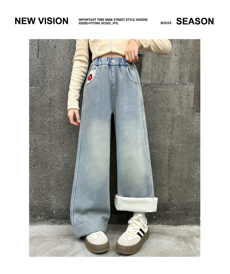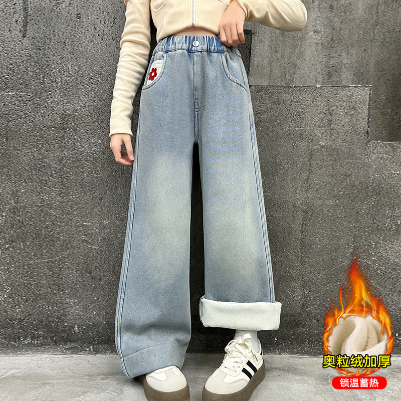소녀 청바지 가을 겨울 바지 기모 두꺼운 어린이 서양식 겨울 느슨한 따뜻한 넓은 다리 바지