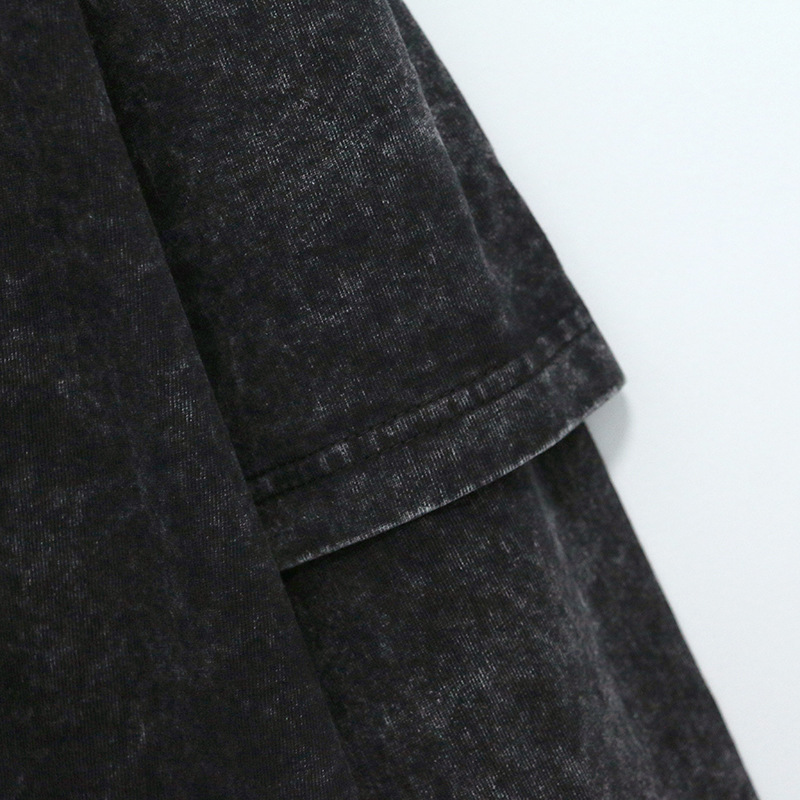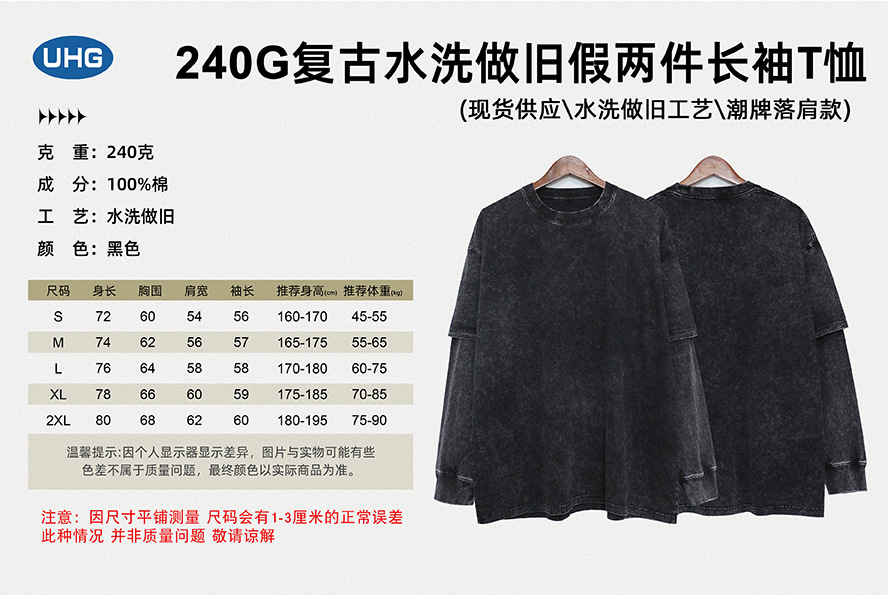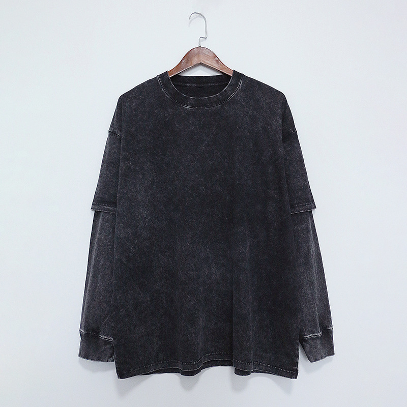 트렌디 한 브랜드 오버 사이즈 헤비 워시 올드 페이크 투피스 긴팔 티셔츠 남성용 세련된 미국식 하이 스트리트 보투 밍 탑스토어 가기