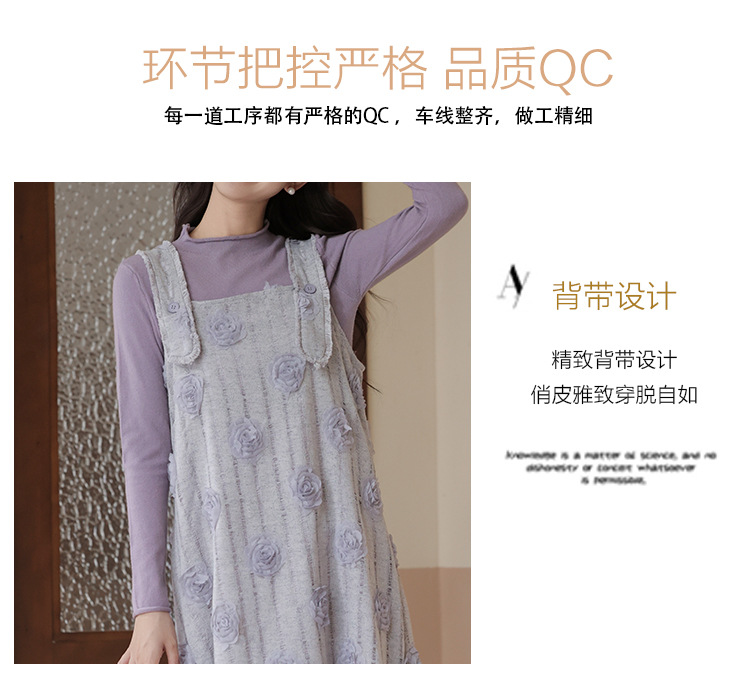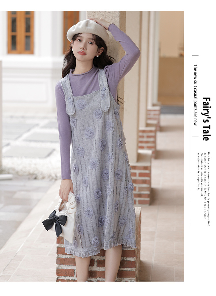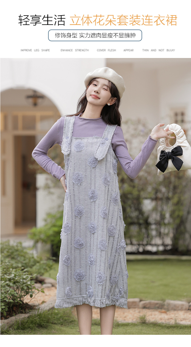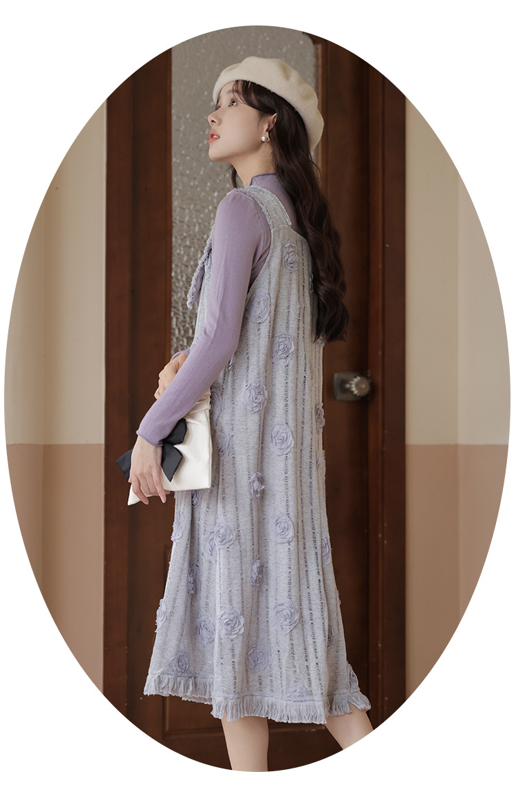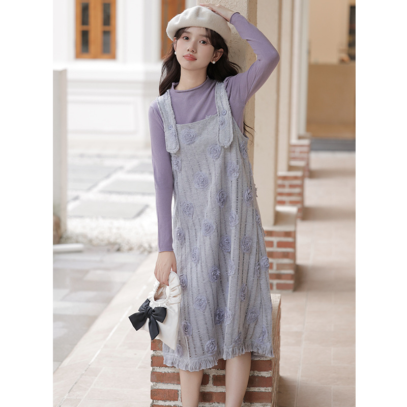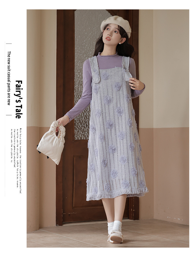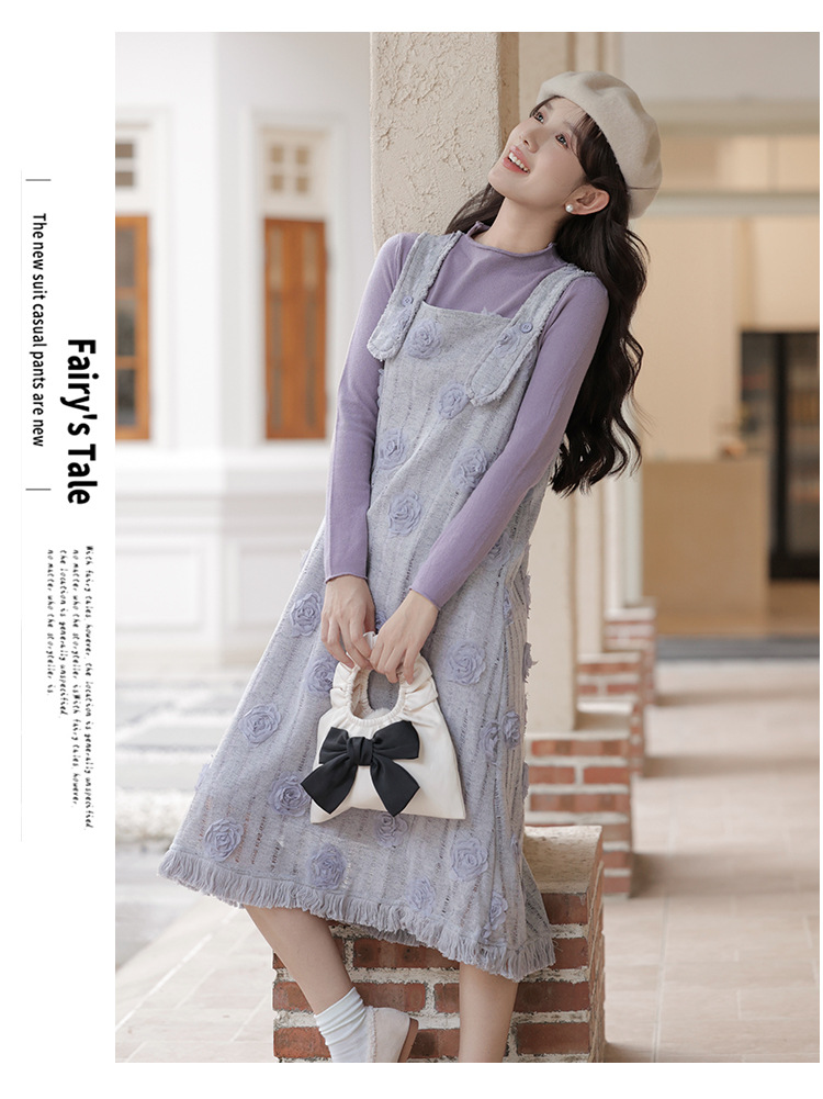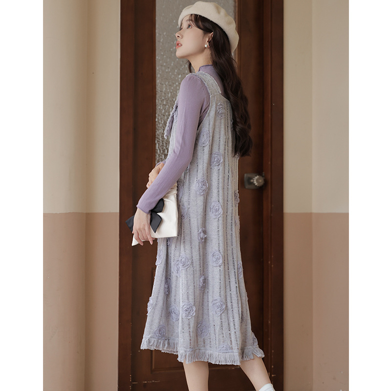 작은 프랑스 스타일 치마 세트 여성의 2024 겨울 새로운 스타일 차 시리즈 보라색 3 차원 꽃 니트 스트랩 원피스스토어 가기