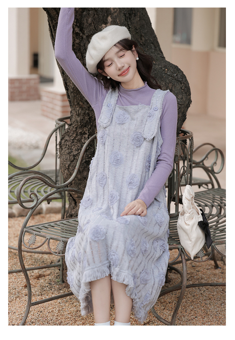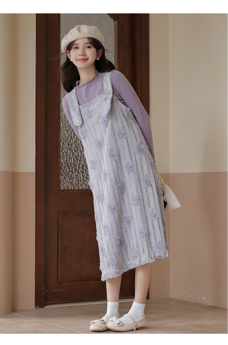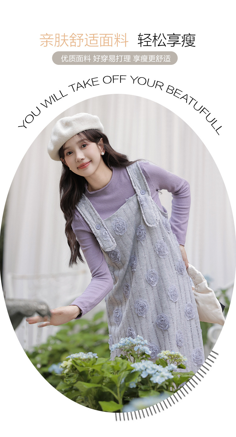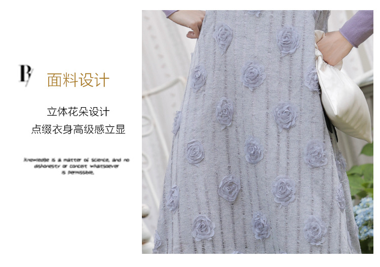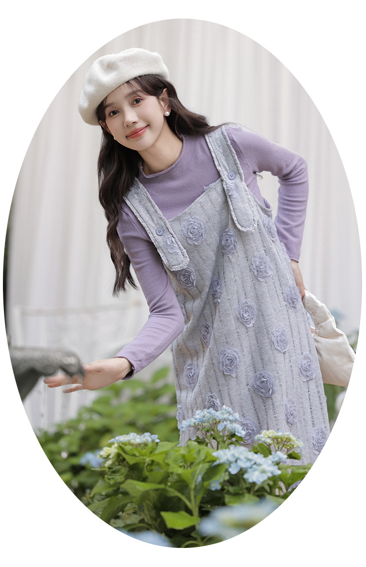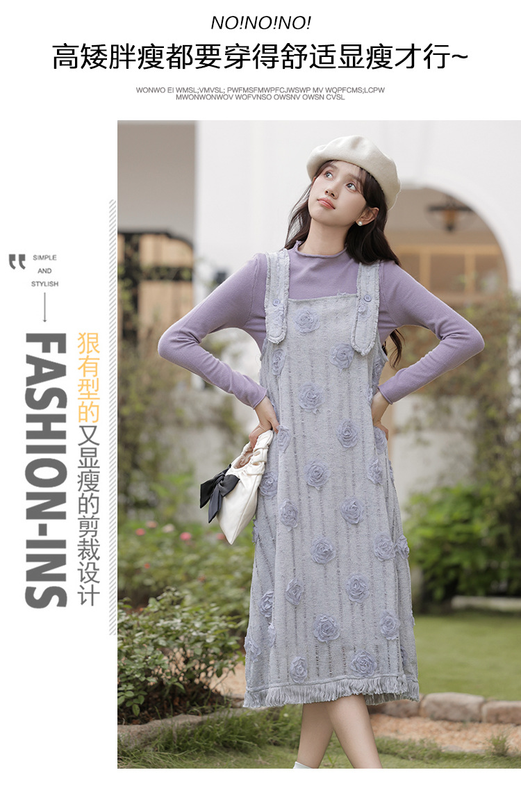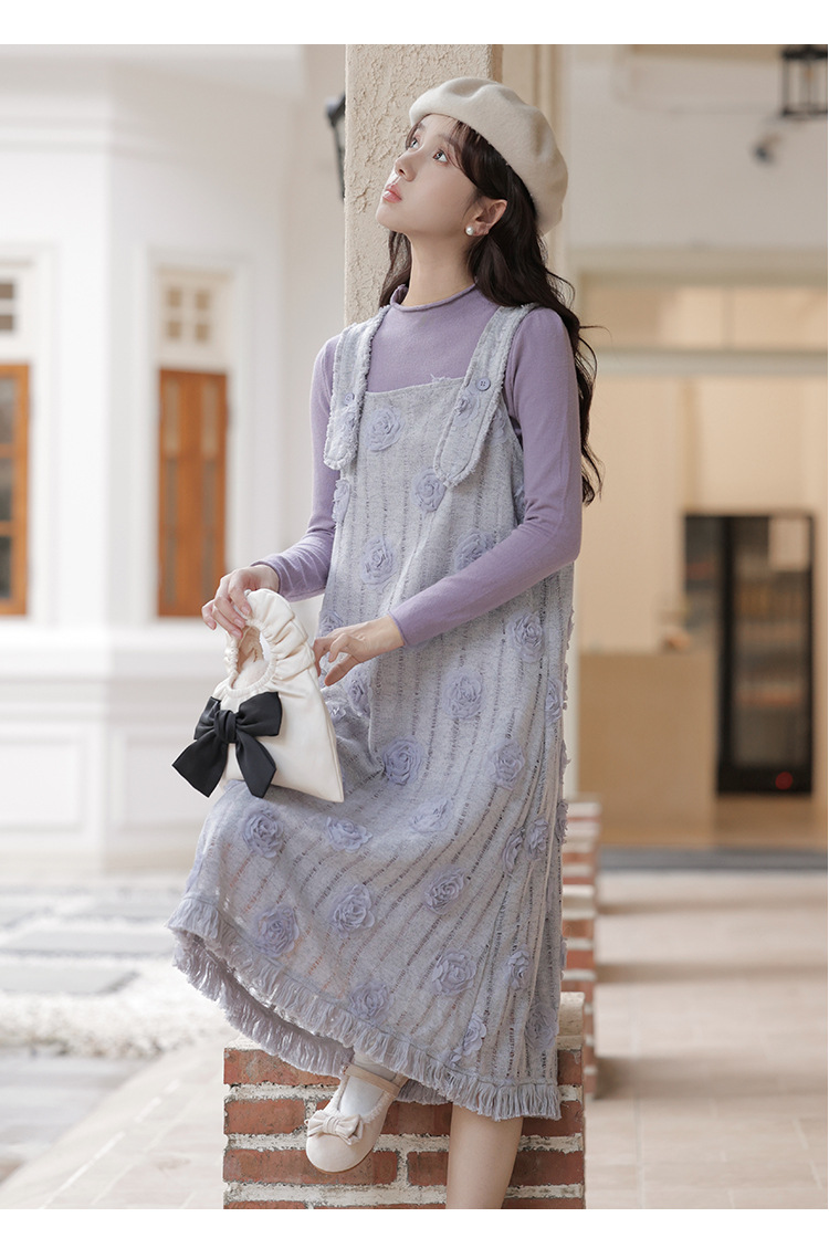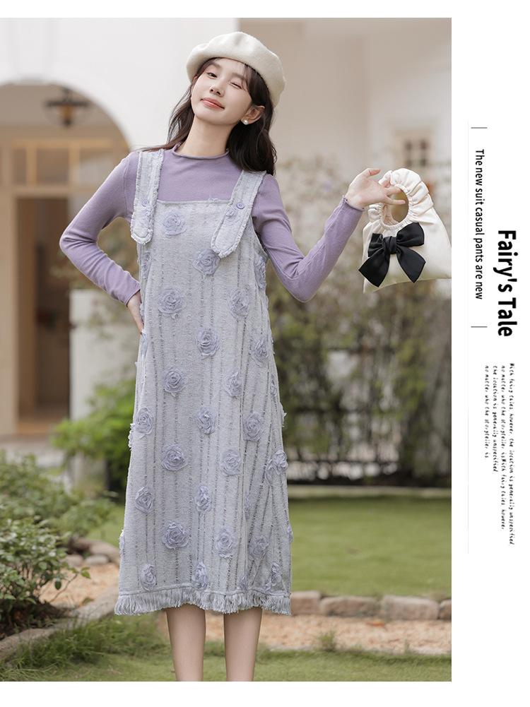 작은 프랑스 스타일 치마 세트 여성의 2024 겨울 새로운 스타일 차 시리즈 보라색 3 차원 꽃 니트 스트랩 원피스스토어 가기