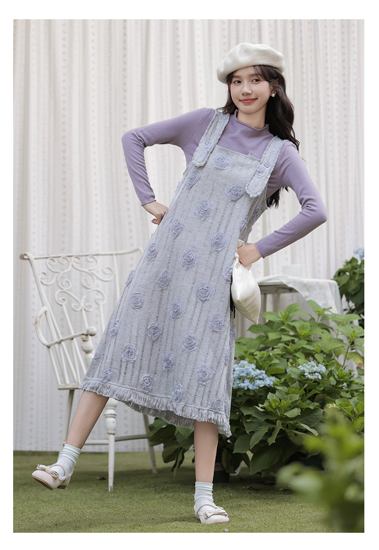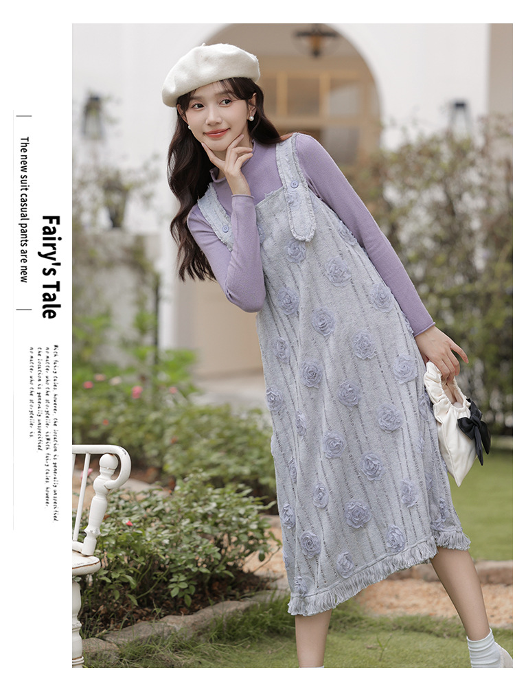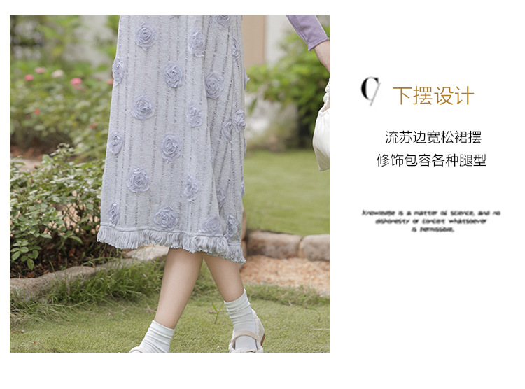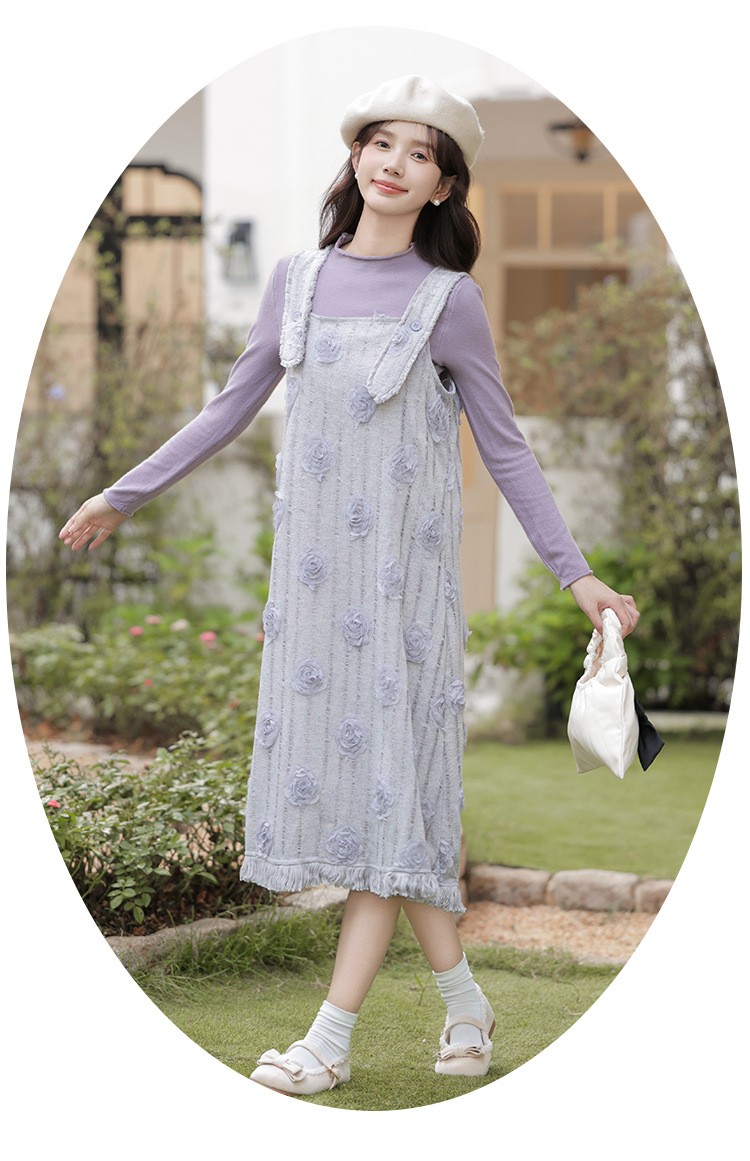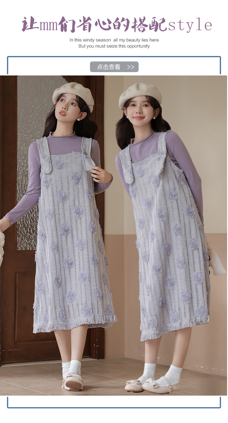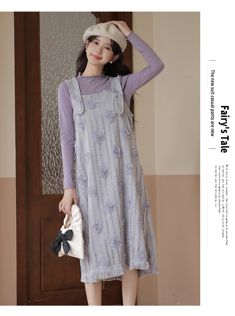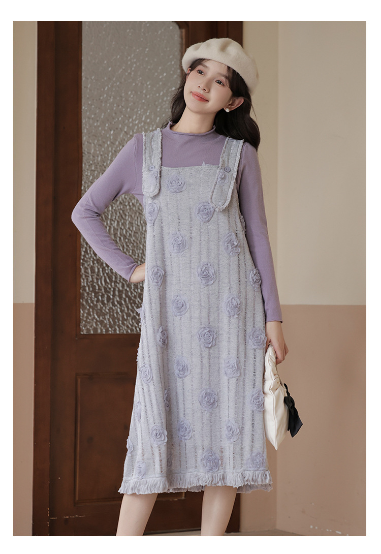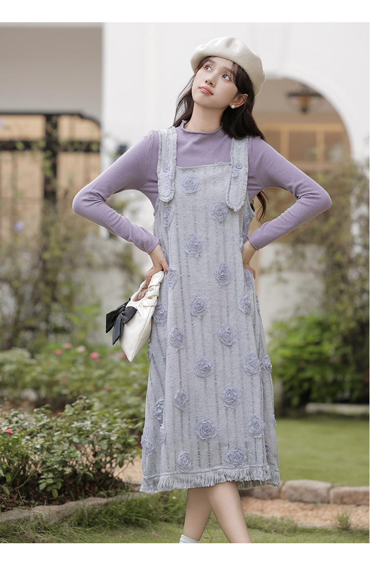 작은 프랑스 스타일 치마 세트 여성의 2024 겨울 새로운 스타일 차 시리즈 보라색 3 차원 꽃 니트 스트랩 원피스스토어 가기