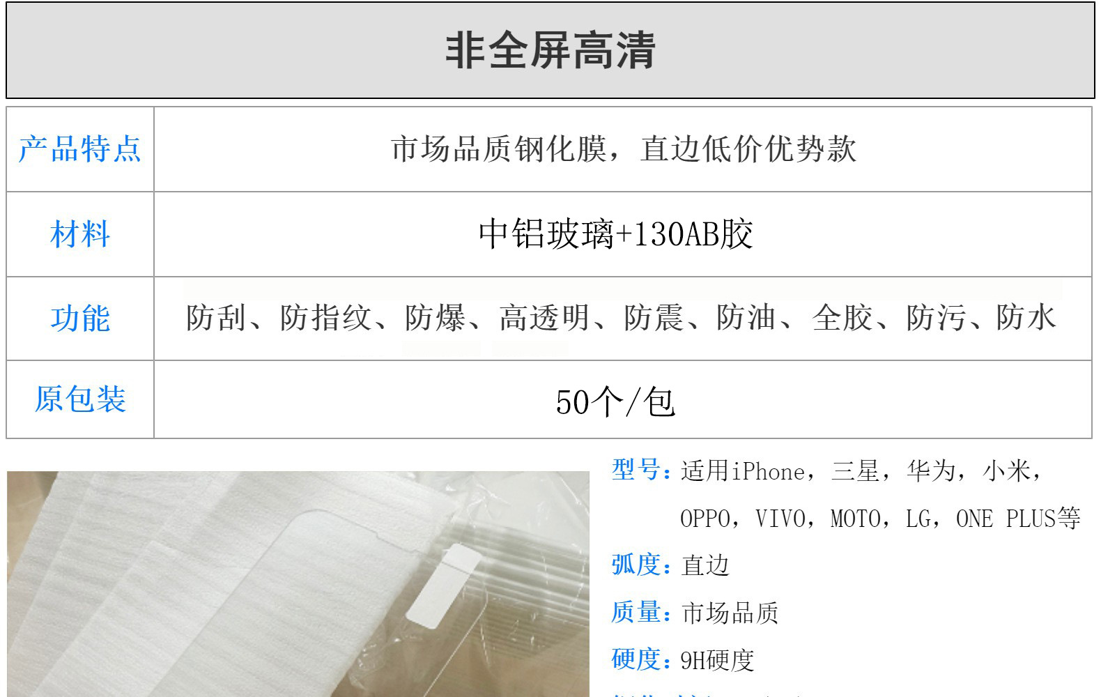 • 일반 하프 스크린 고화질-직선 엣지(단일 모델의 경우 최소 배치 크기는 50/패키지 배수입니다)