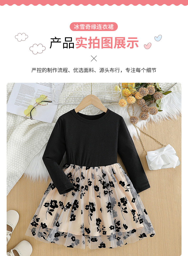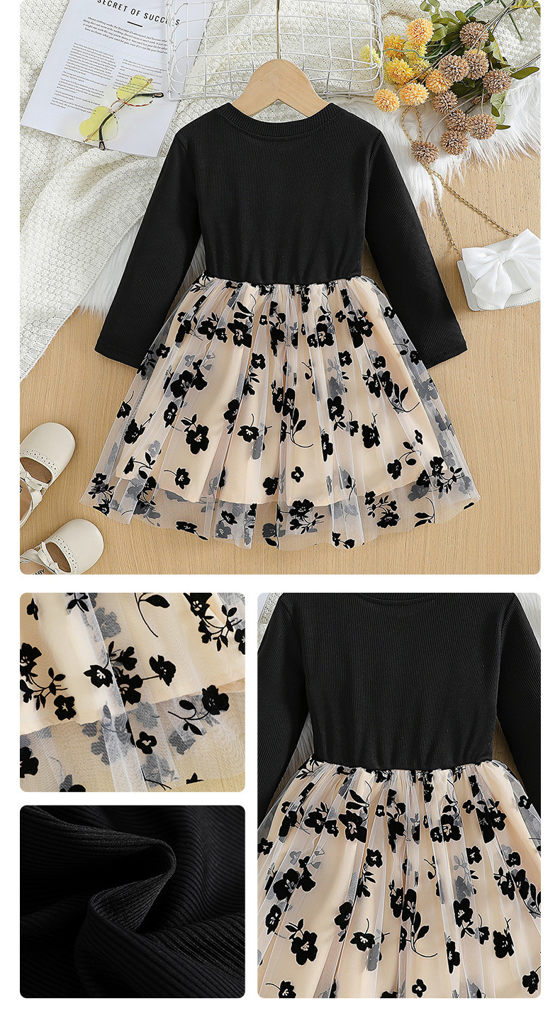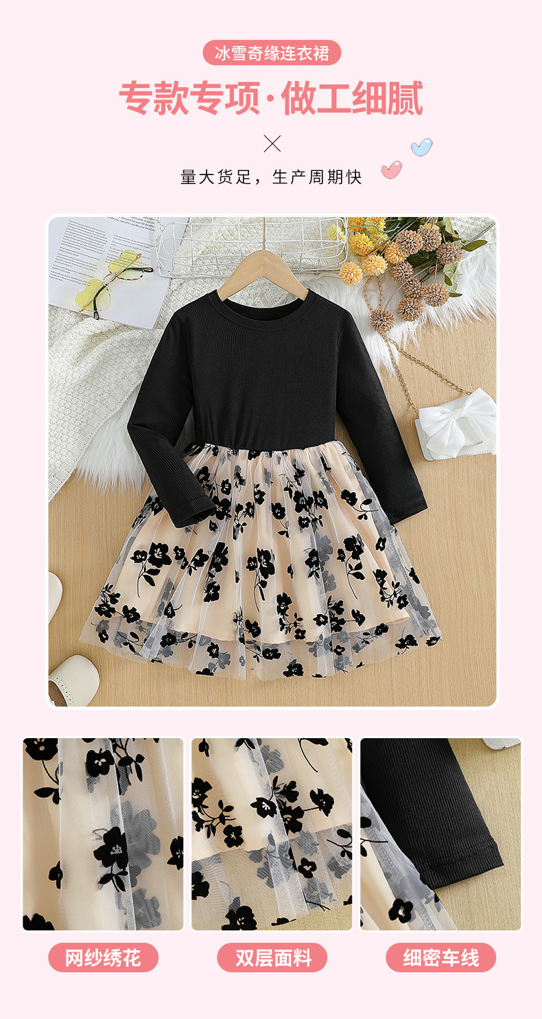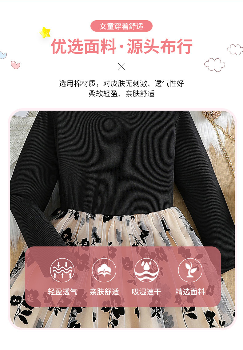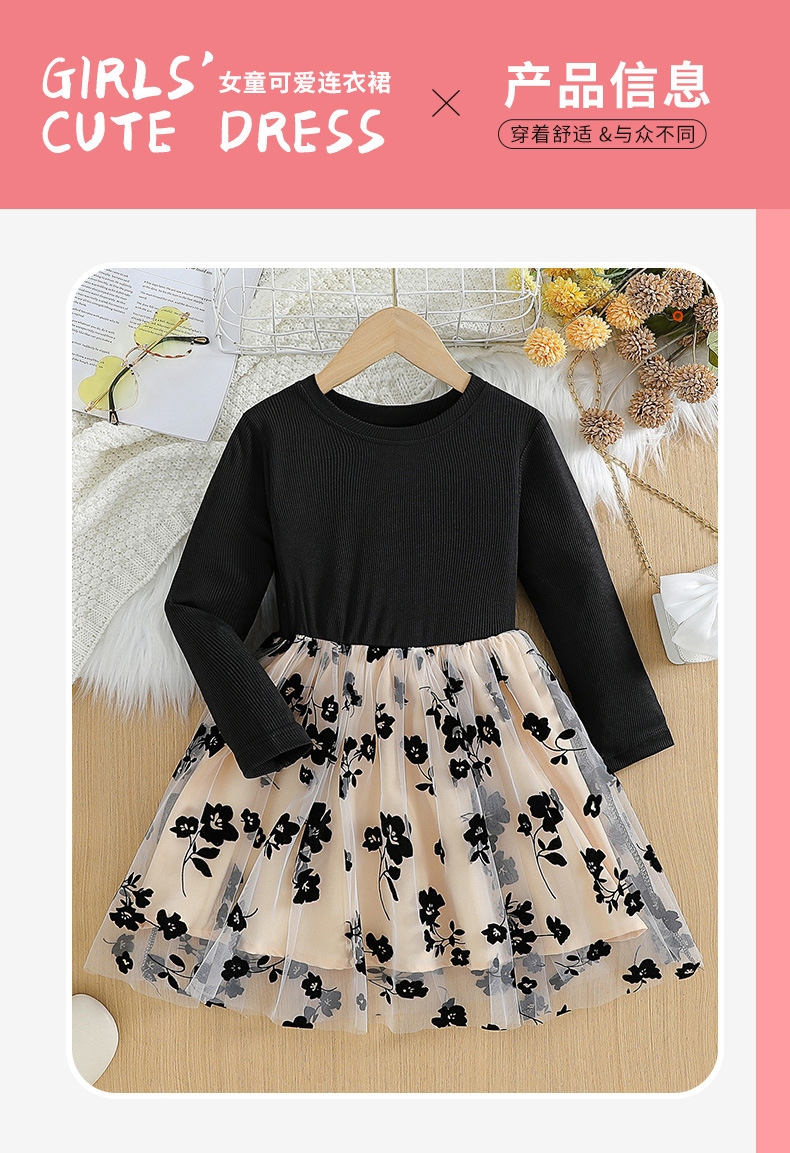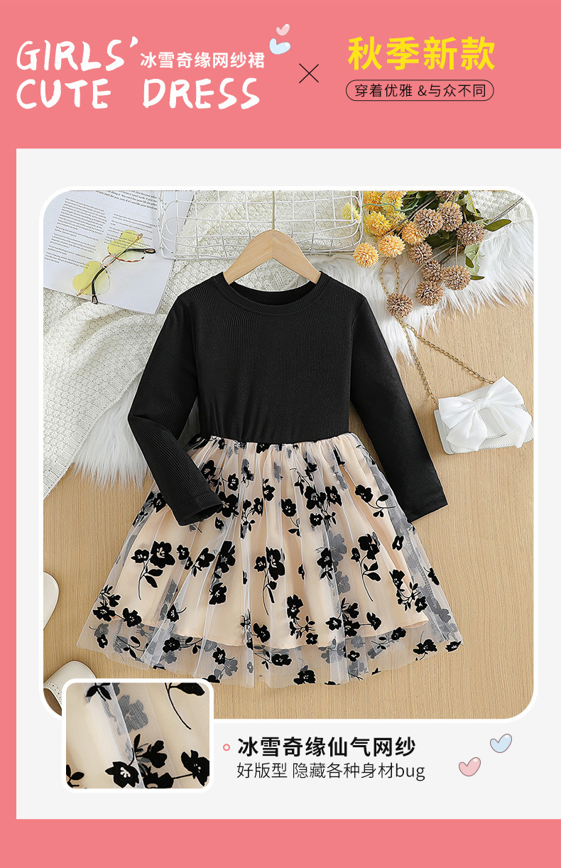 2024 봄과 가을 대외 무역 폭발 소녀 단색 구덩이 스트립 긴 소매 크루 넥 블랙 로즈 메쉬 공주 원피스스토어 가기