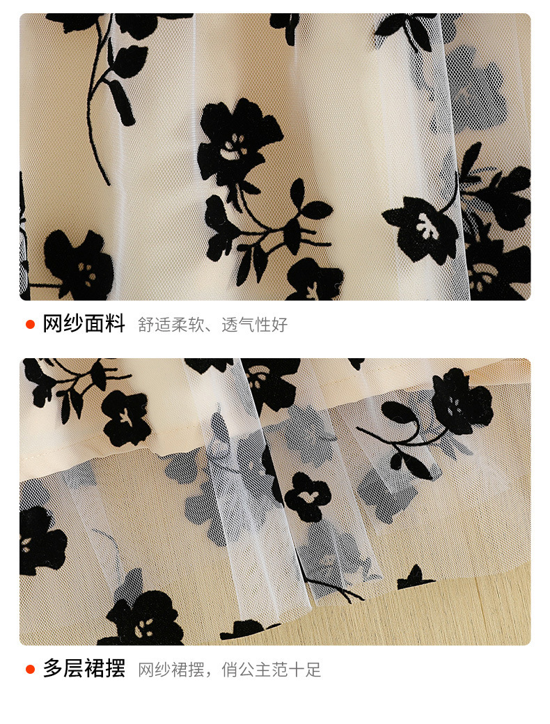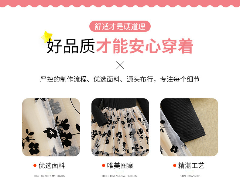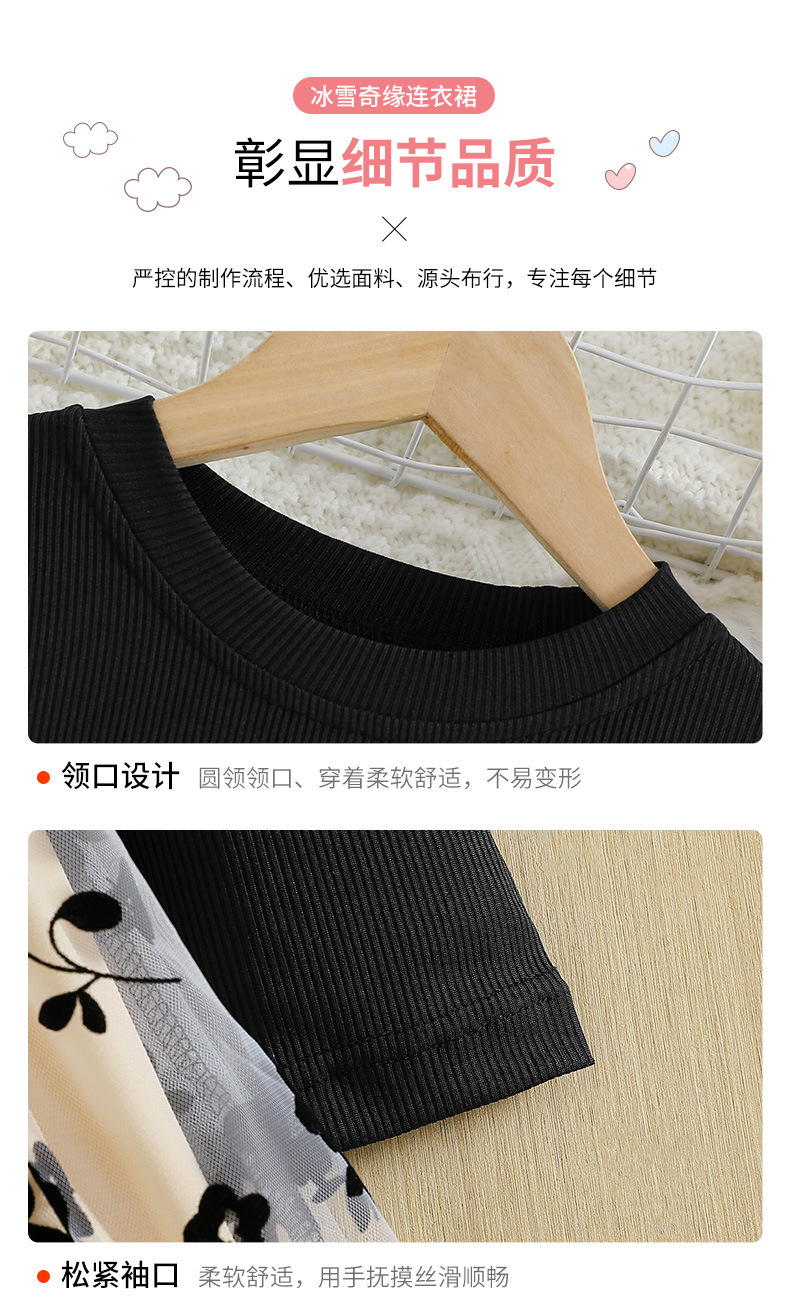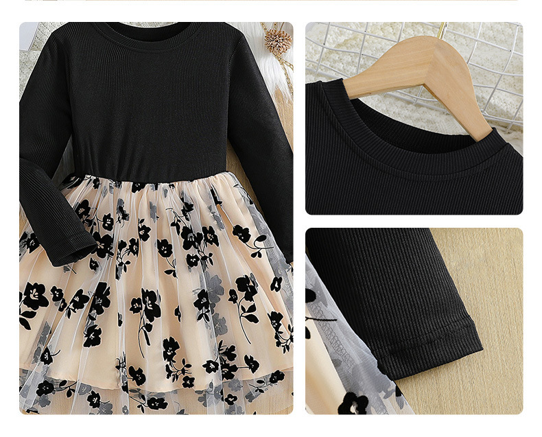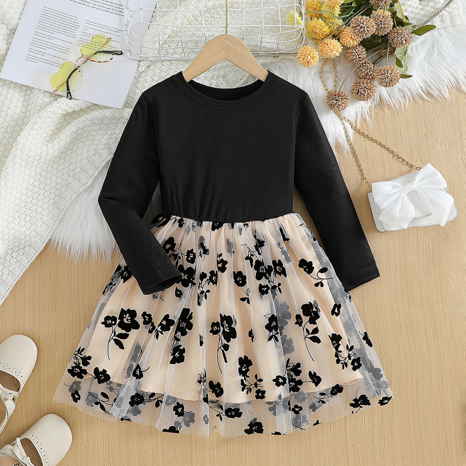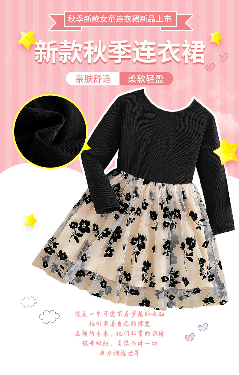 2024 봄과 가을 대외 무역 폭발 소녀 단색 구덩이 스트립 긴 소매 크루 넥 블랙 로즈 메쉬 공주 원피스스토어 가기