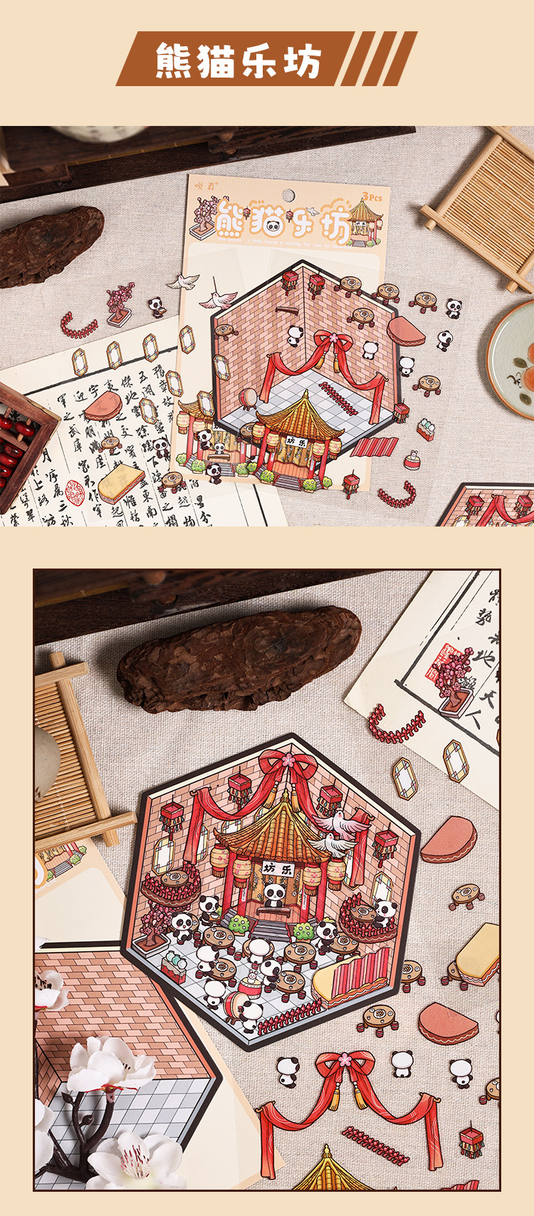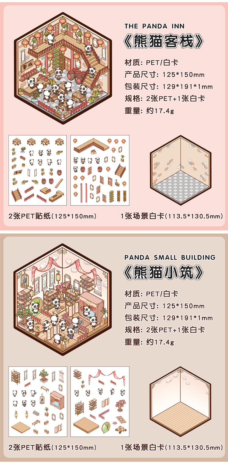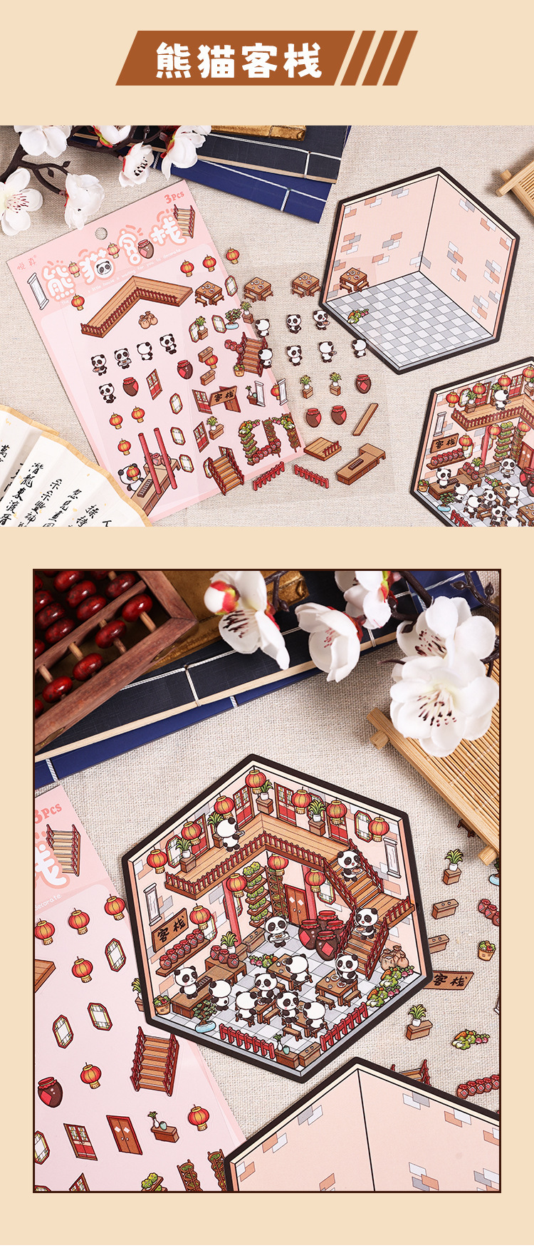 팬더 하우스 스태킹 마이크로 장면 풍경 스티커 어린이 교육 스티커 3D 헛 감압 작은 장난감스토어 가기