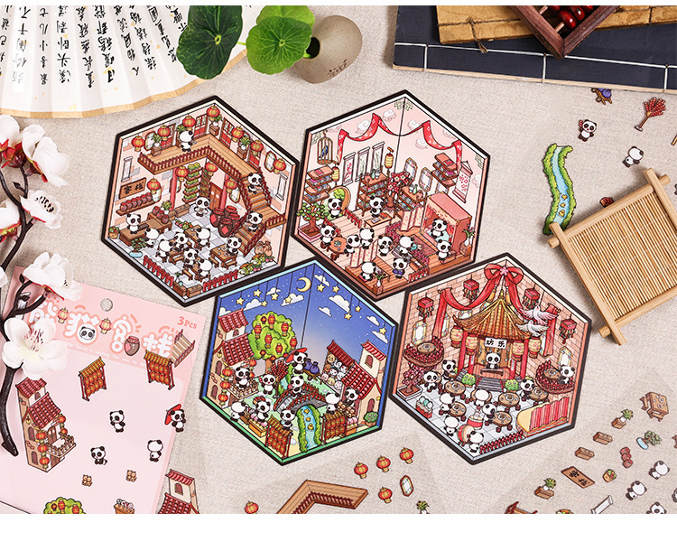 팬더 하우스 스태킹 마이크로 장면 풍경 스티커 어린이 교육 스티커 3D 헛 감압 작은 장난감