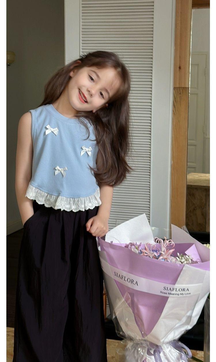 소녀 한국 스타일 활 작은 조끼 여름 새로운 어린이 달콤한 바느질 레이스 소매 티셔츠 탑 트렌디