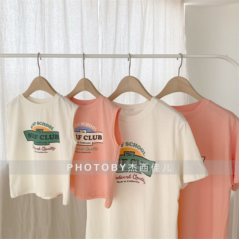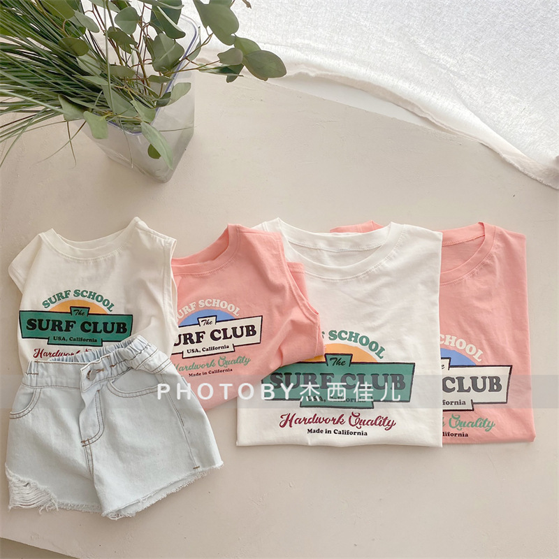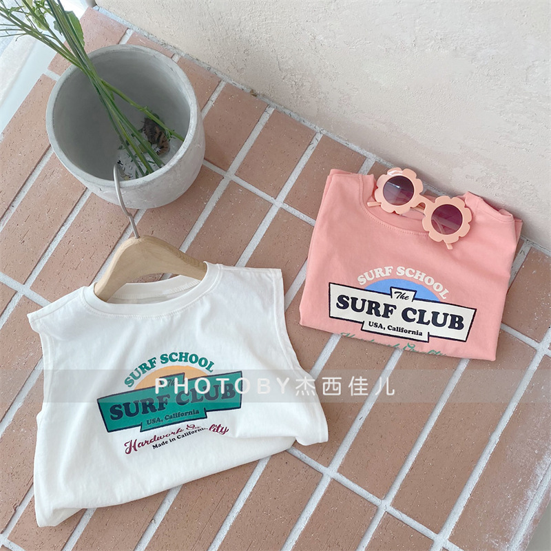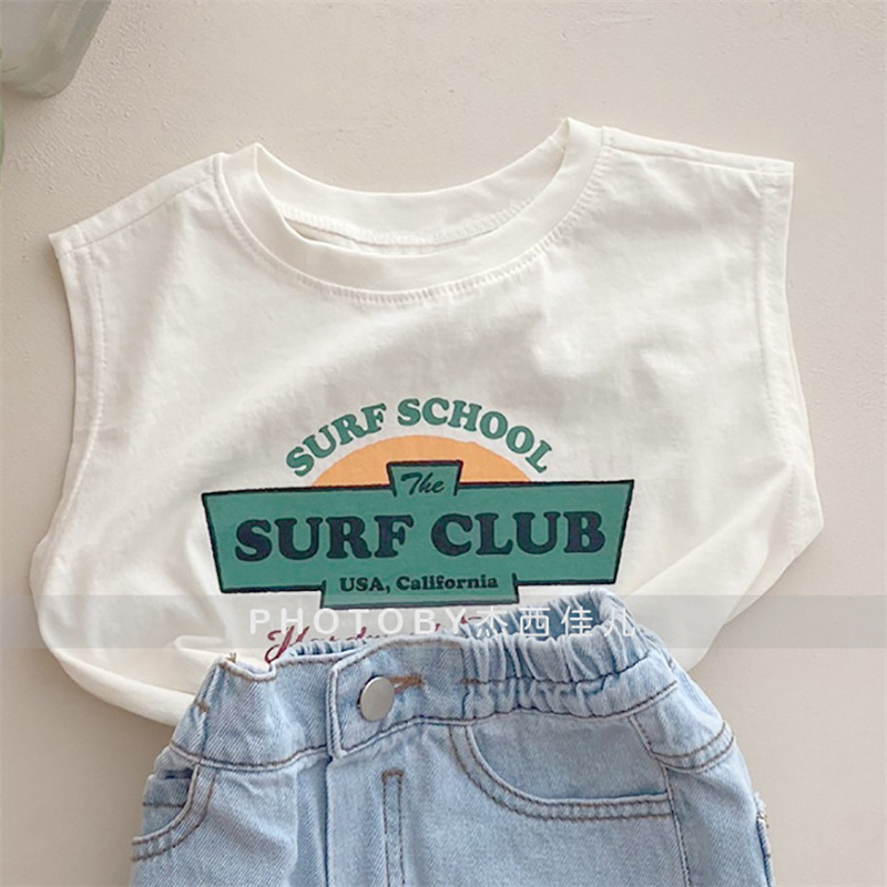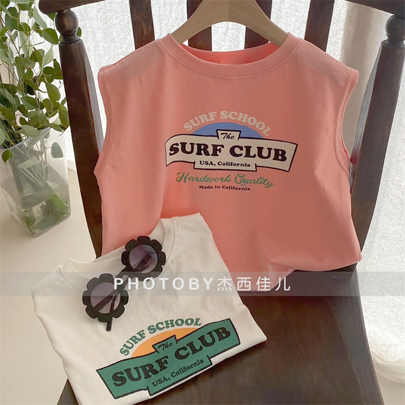2025 한국식 어린이 여름 새로운 민소매 조끼 간단한 개성 편지 인쇄 캐주얼 탑 국경 머리스토어 가기