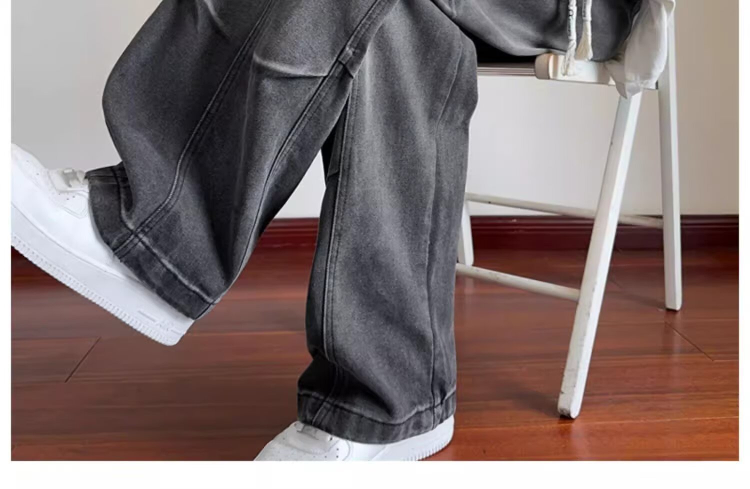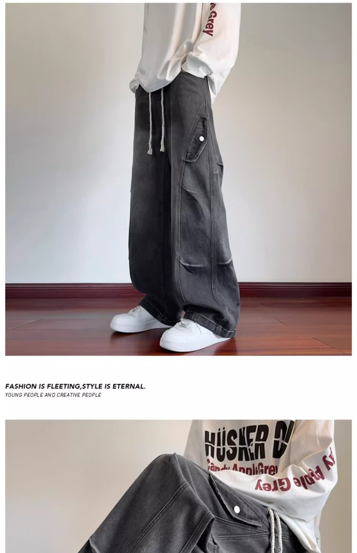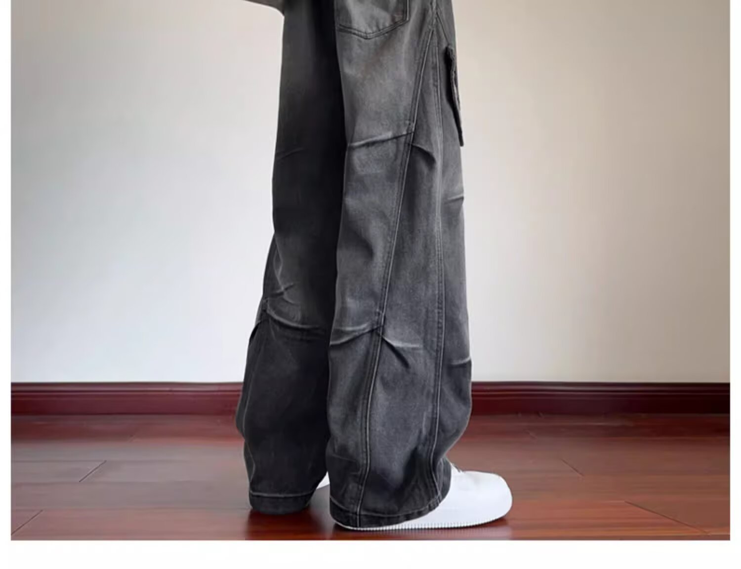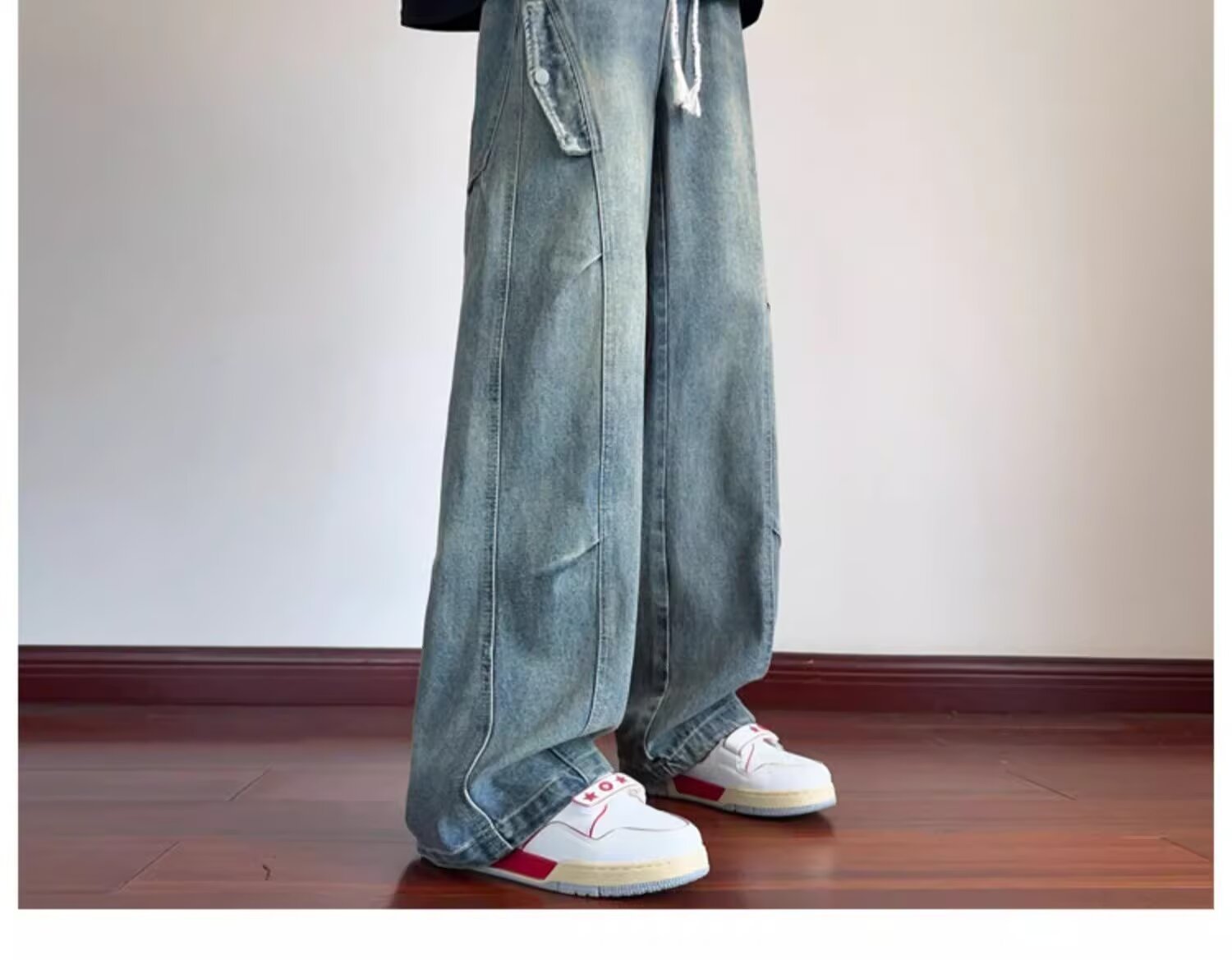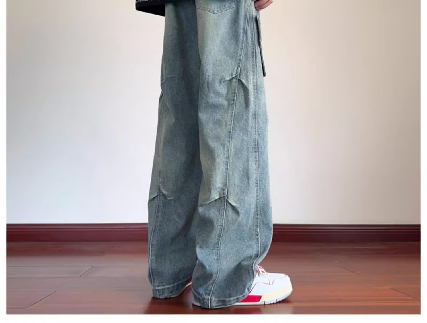 미국 복고풍 청바지 오래된 해체 된 넓은 다리 바지 남성 봄과 가을 하이 스트리트 패션 브랜드 디자인 주름 된 스트레이트 다리 바지스토어 가기