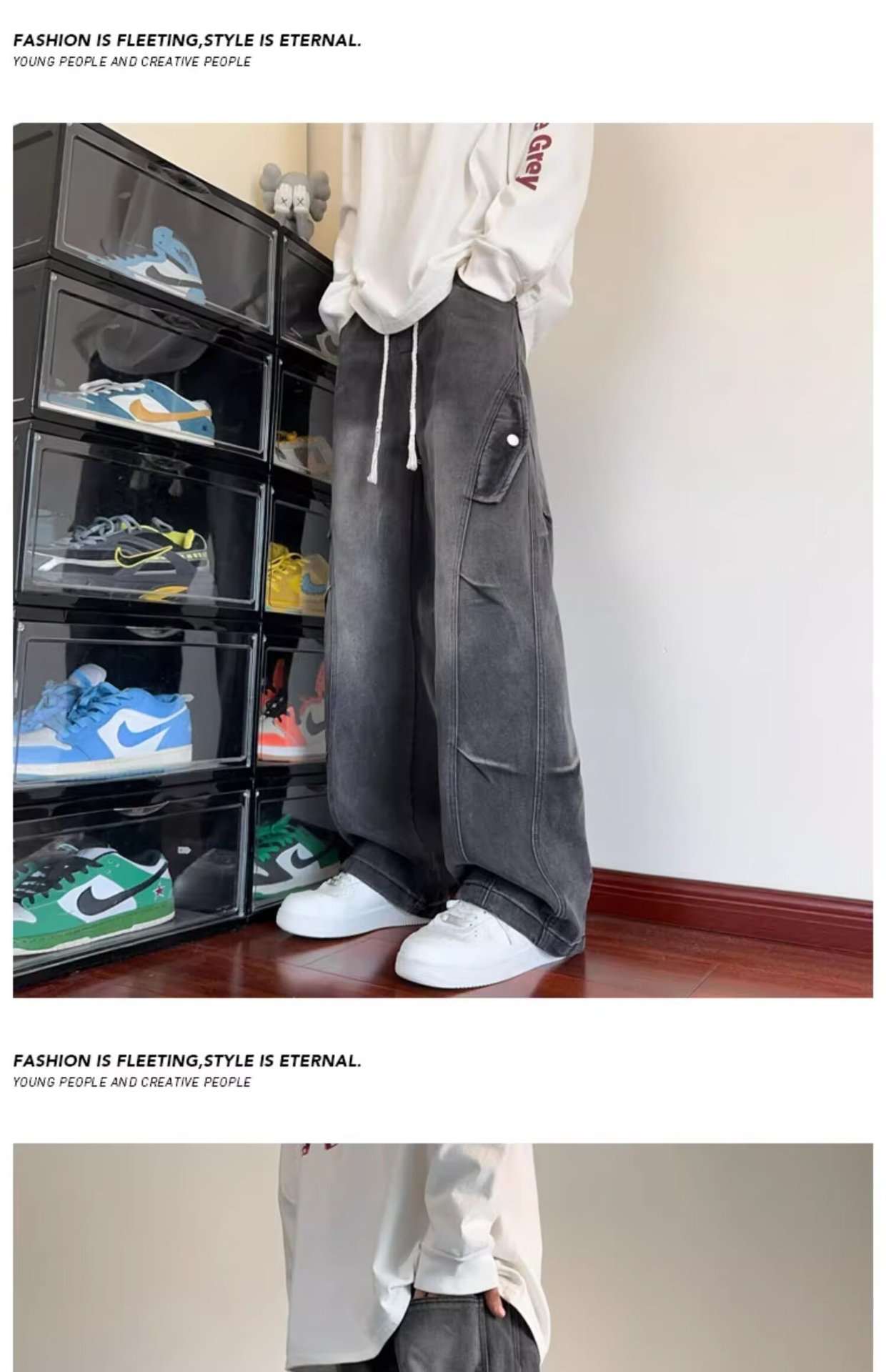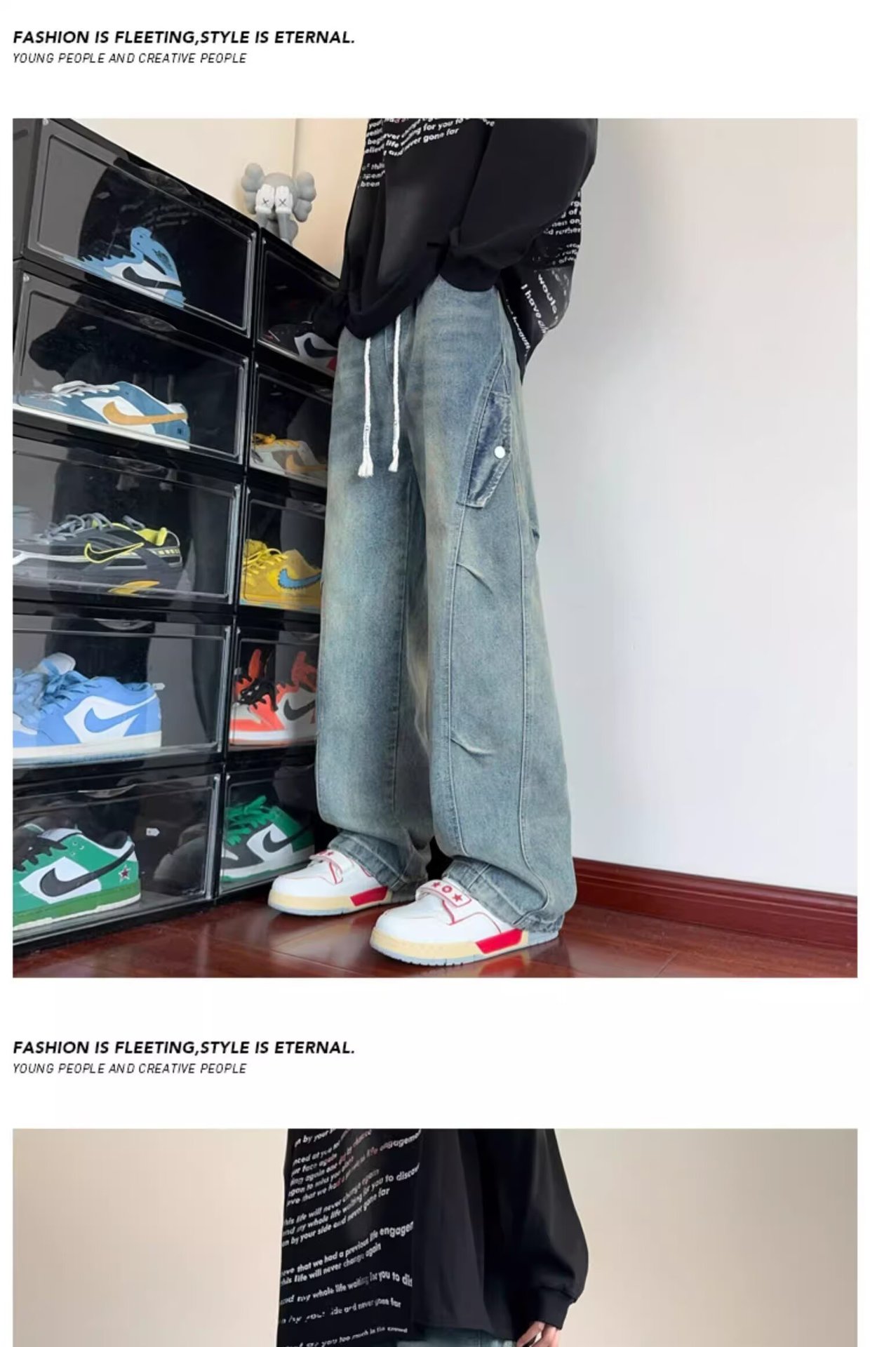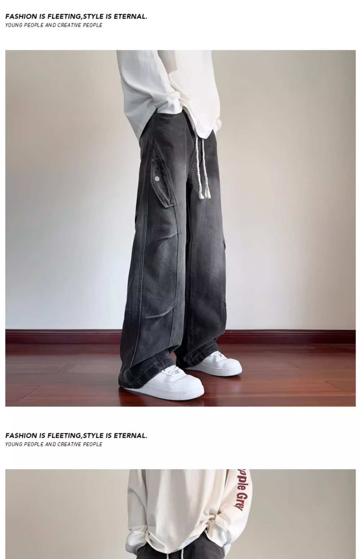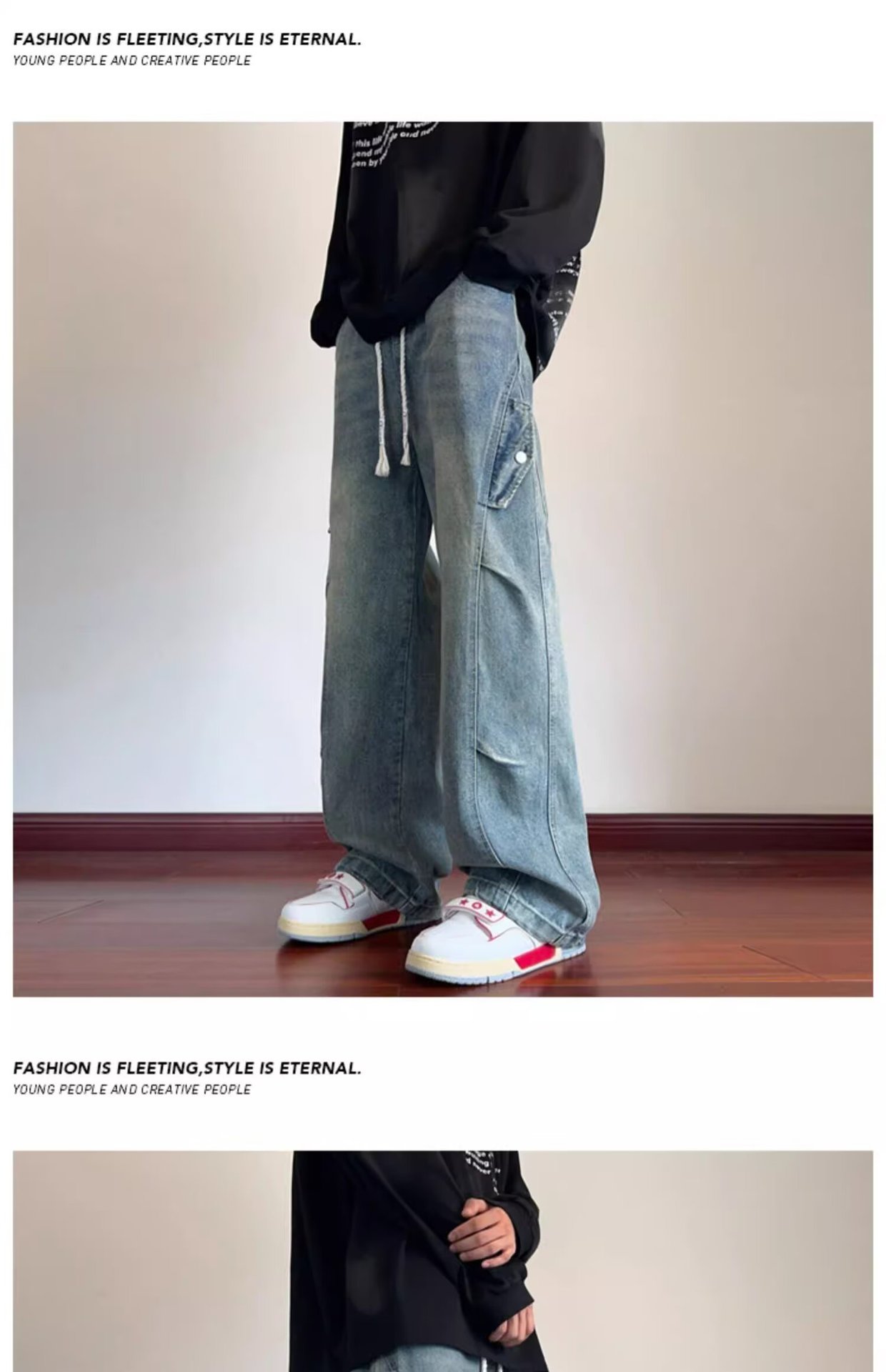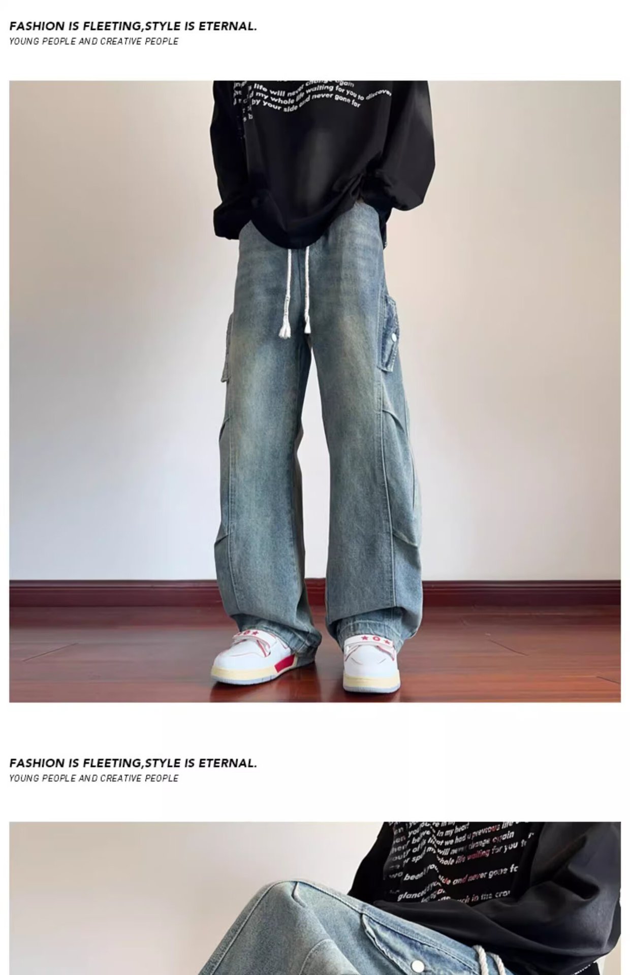 미국 복고풍 청바지 오래된 해체 된 넓은 다리 바지 남성 봄과 가을 하이 스트리트 패션 브랜드 디자인 주름 된 스트레이트 다리 바지스토어 가기