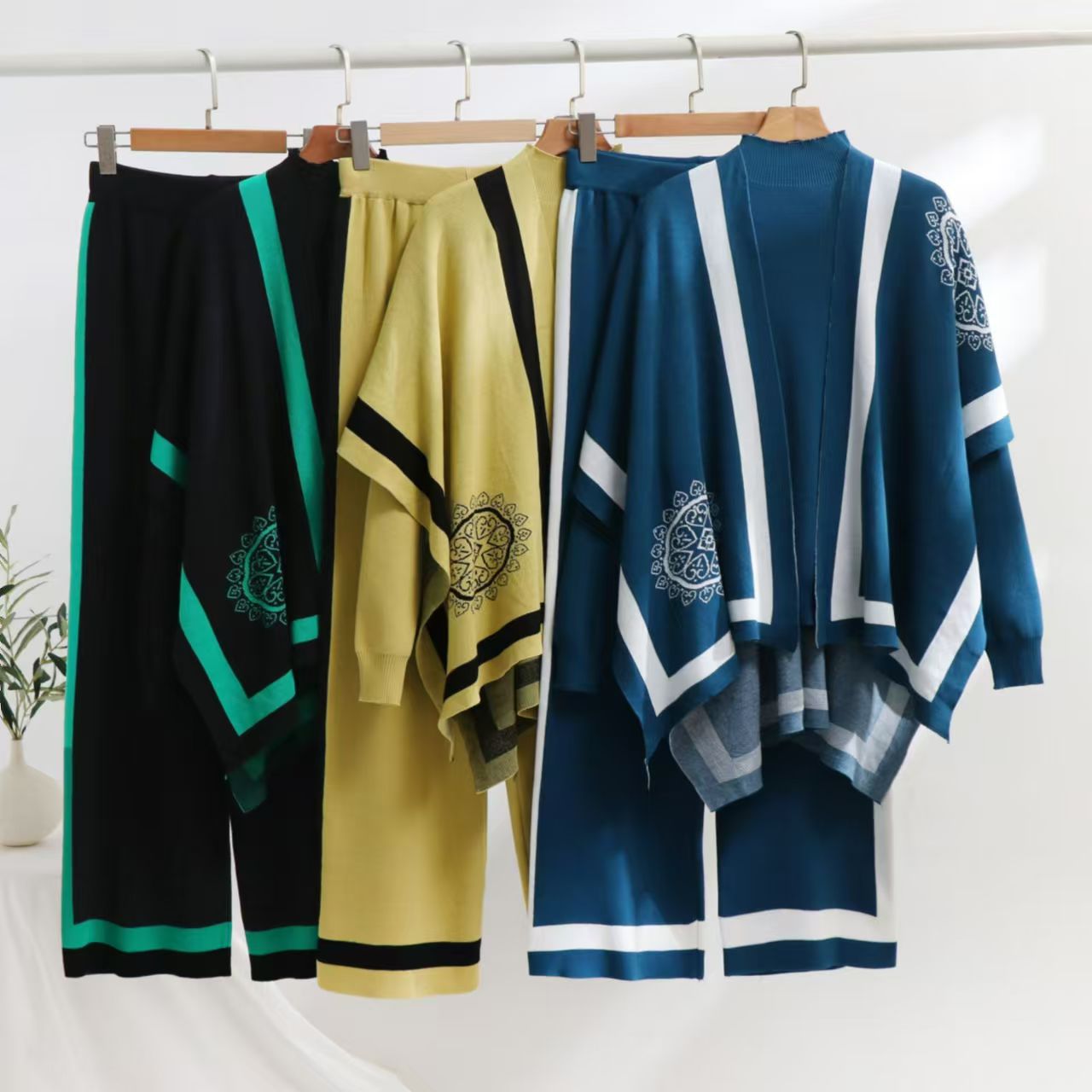 국경 간 유럽과 미국의 컬러 블록 목도리 탑 느슨한 와이드 레그 팬츠 니트 3 피스 간단한 캐주얼 스타일 세트 여성 의류