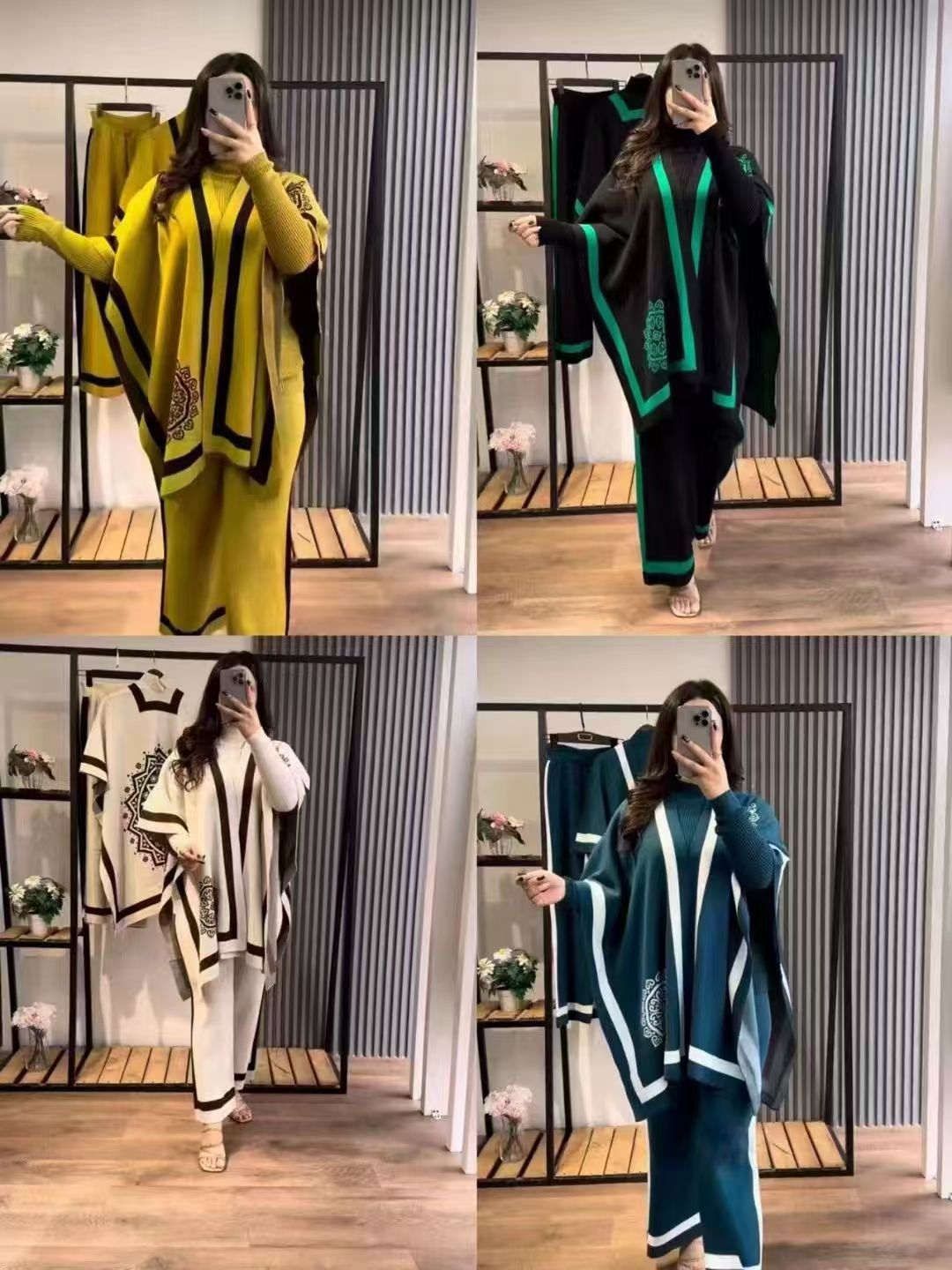 국경 간 유럽과 미국의 컬러 블록 목도리 탑 느슨한 와이드 레그 팬츠 니트 3 피스 간단한 캐주얼 스타일 세트 여성 의류스토어 가기