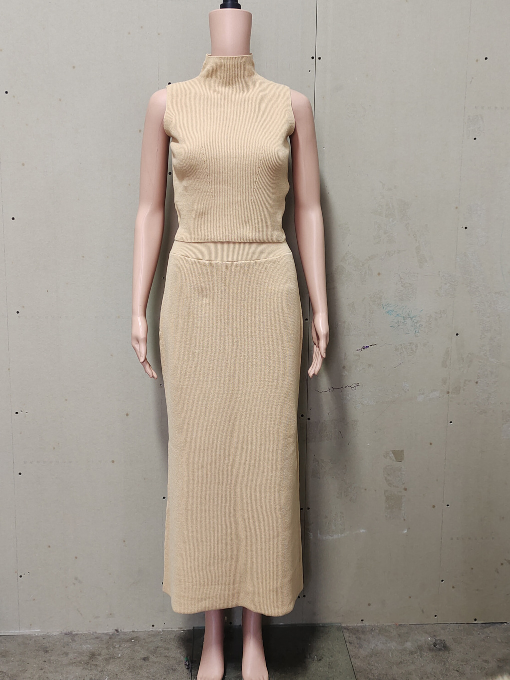 2025 봄과 가을 여성 의류 유럽과 미국의 우아한 양모 투피스 민소매 니트 하이 칼라 조끼 스커트 세트 스커트