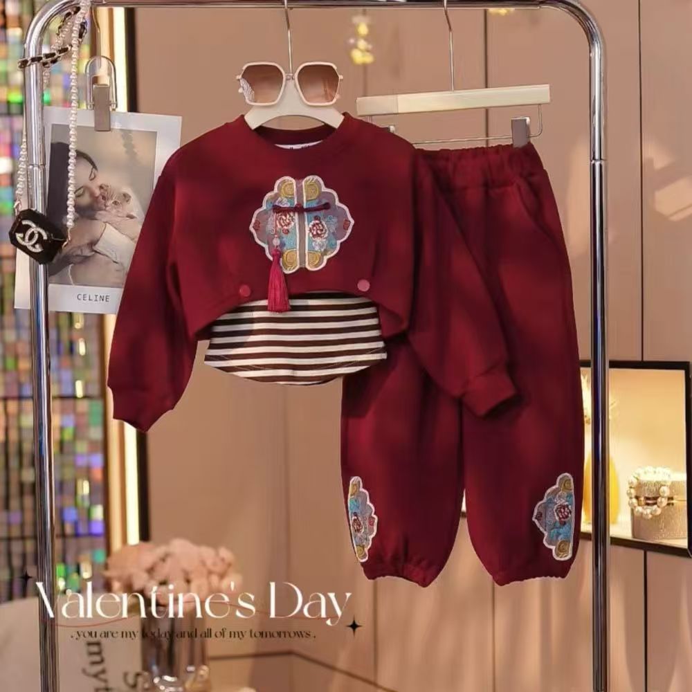 소녀 가을 겨울 세트 2024 새로운 중국 스타일 국가 스타일 어린이 아기 서양 스타일 땀 기모 3 피스 세트